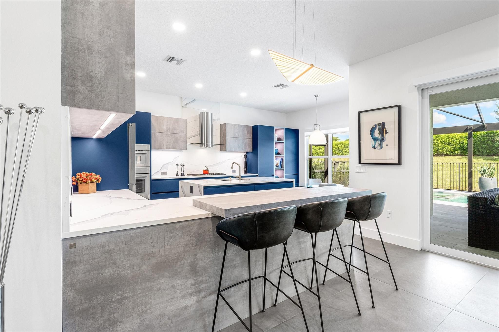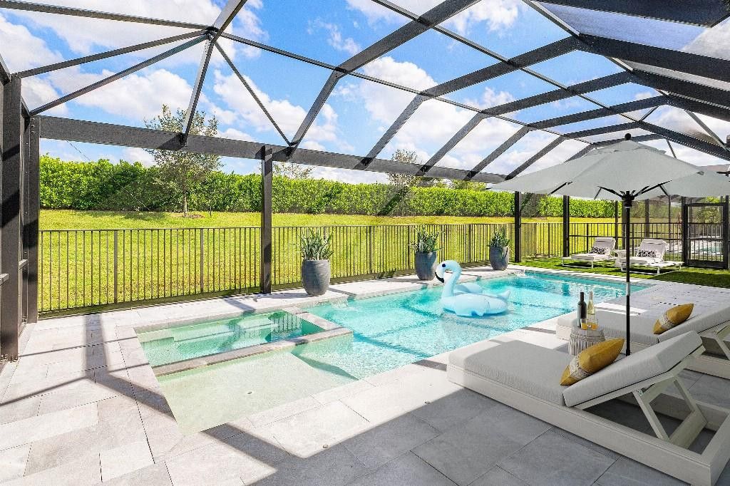 Designed Without Compromise — Every detail Thoughtfully CustomizedWelcome to the Caroline, your modern retreat in the Valencia Grove at Riverland, Port St. Lucie’s premier resort-style active adult living community! This stunning 3-bedroom, 2.5-bath residence seamlessly blends luxury, style, and comfort in every detail.Step inside to expansive open-concept living spaces highlighted by oversized 60” x 30” porcelain tile flooring throughout — extending even into the air-conditioned single-car garage, ideal for a home gym, workshop, or climate-controlled storage. Contemporary ceiling fans enhance the bedrooms, great room, den, and garage, while modern LED recessed lighting creates a bright, sophisticated ambiance in every room. Willing to work with a buyers broker. The primary suite is a private sanctuary, complete with dual oversized built-in closets and a spa-inspired ensuite bathroom that rivals any luxury hotel. The freestanding natural stone soaking tub is a stunning focal point, offering the perfect blend of elegance and relaxation. The bathroom also features an extended, flush-entry frameless shower with floor-to-ceiling tile, Brizo shower fixtures, custom wall-hung cabinetry, dual trough sinks with Moen faucets, illuminated mirrors, and a bidet with a heated seat for ultimate relaxation.The secondary bedroom with a walk-in and a built-in closet offers another beautifully appointed ensuite with a frameless, flush-entry shower featuring floor-to-ceiling, a floating vanity, an illuminated mirror, and sleek finishes that will leave your guests never wanting to leave.A third, non-conforming bedroom has been transformed into a spacious den with a custom-built-in cabinet with illuminated shelving, perfect for a home office, media room, or guest suite.At the heart of the home is the chef-inspired kitchen, fully redesigned with quartz countertops and backsplash and Leicht German cabinetry renowned for its modern design and superior craftsmanship. The relocated sink on the extended center island enhances the kitchen's flow, placing you just a pivot away from the Thermador gas cooktop. A Bosch refrigerator and Thermador Masterpiece Combination Wall Oven and dishwasher ensure both peak performance and sleek aesthetic appeal.The magnificent great room is elevated by bold, timeless Versace wallpaper, adding sophistication and grandeur. The stunning dry bar, complete with illuminated shelving and a wine refrigerator, enhances the space, making it perfect for entertaining.The laundry room is outfitted with upgraded, elevated, and back-saving GE front-load Washer & Dryer, surrounded by more storage than you could hope for.Solar shades throughout ensure the home is bathed in natural light while providing optimal privacy.Step outside to your screened and fenced private oasis, where a heated saltwater pool and hot tub await. Designed for year-round enjoyment, this low-maintenance outdoor space is perfect for both quiet mornings and lively gatherings with friends and family.The two-car garage features a premium concrete-coated floor for durability and a sleek modern look, designed to withstand heavy traffic. Cabinetry along one wall provides additional storage options.Experience Resort-Style Living: Located within the vibrant, gated community of Valencia Grove at Riverland, you'll have access to world-class amenities that make every day feel like a vacation. Lounge by the 34,000 sq. ft. clubhouse pool, enjoy a delicious lunch at the café, or take in a Broadway-style show at the social hall. The Arts & Culture Center offers a range of creative activities, from pottery and painting to cooking classes. Explore miles of walking, biking, and golf-cart paths along the Paseo and Greenway, where you can enjoy the beautiful Florida weather without ever crossing a street. The Sports & Racquet Club boasts a 51,000 sq. ft. Wellness & Fitness Center, offering over 50 weekly fitness classes such as aerobics, Zumba, and barre. With personal trainers, massage therapists, and nutritionists available for hire, you'll have everything you need to stay active and healthy. Riverland is also home to Florida's largest private pickleball facility, with 53 courts, as well as tennis, bocce ball, and more. With everything you need for an active, engaging lifestyle, the only thing missing is you. This isn't just a home — it's a statement. Live in contemporary comfort, stylish design, and an active, engaging community. Schedule your private tour today!