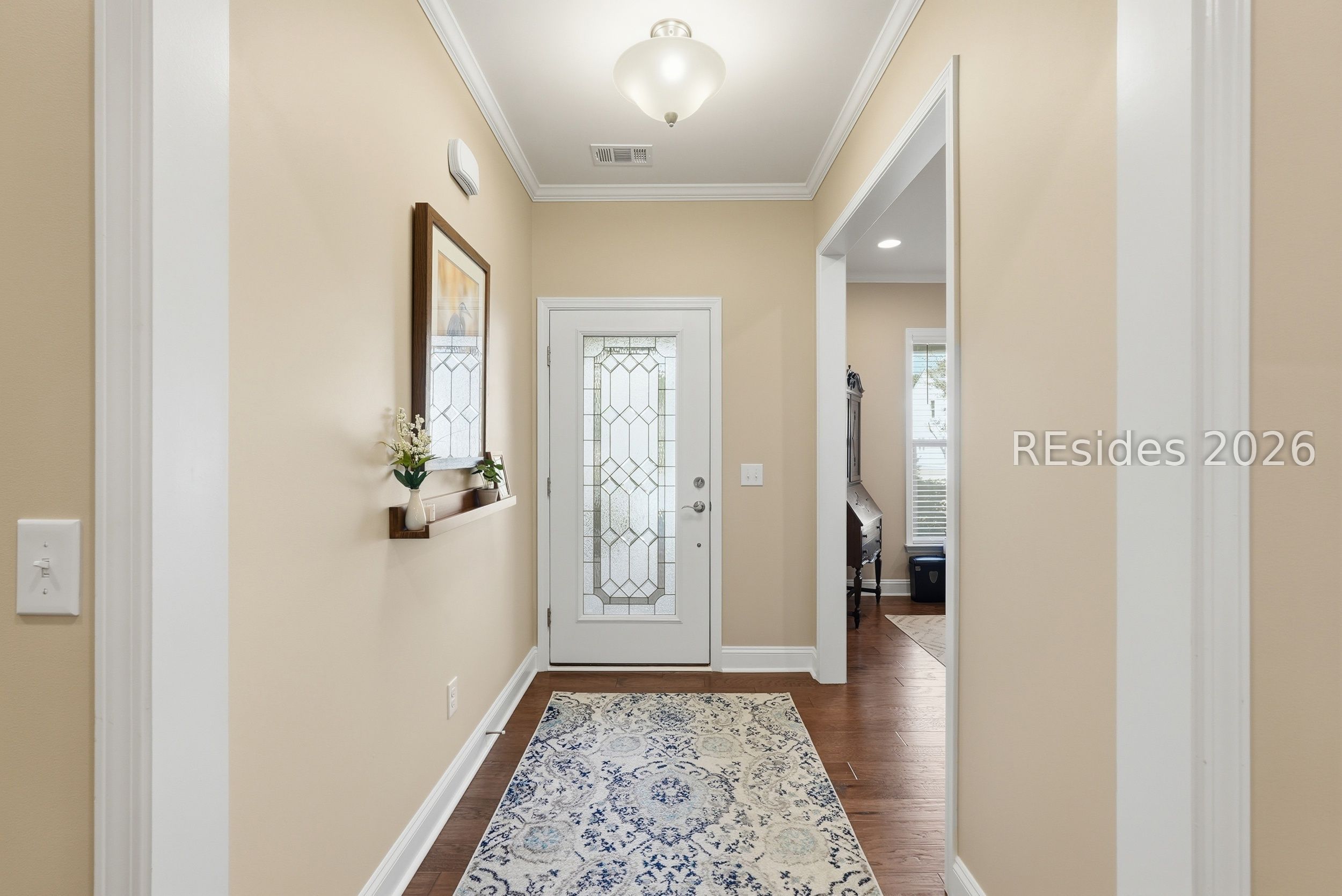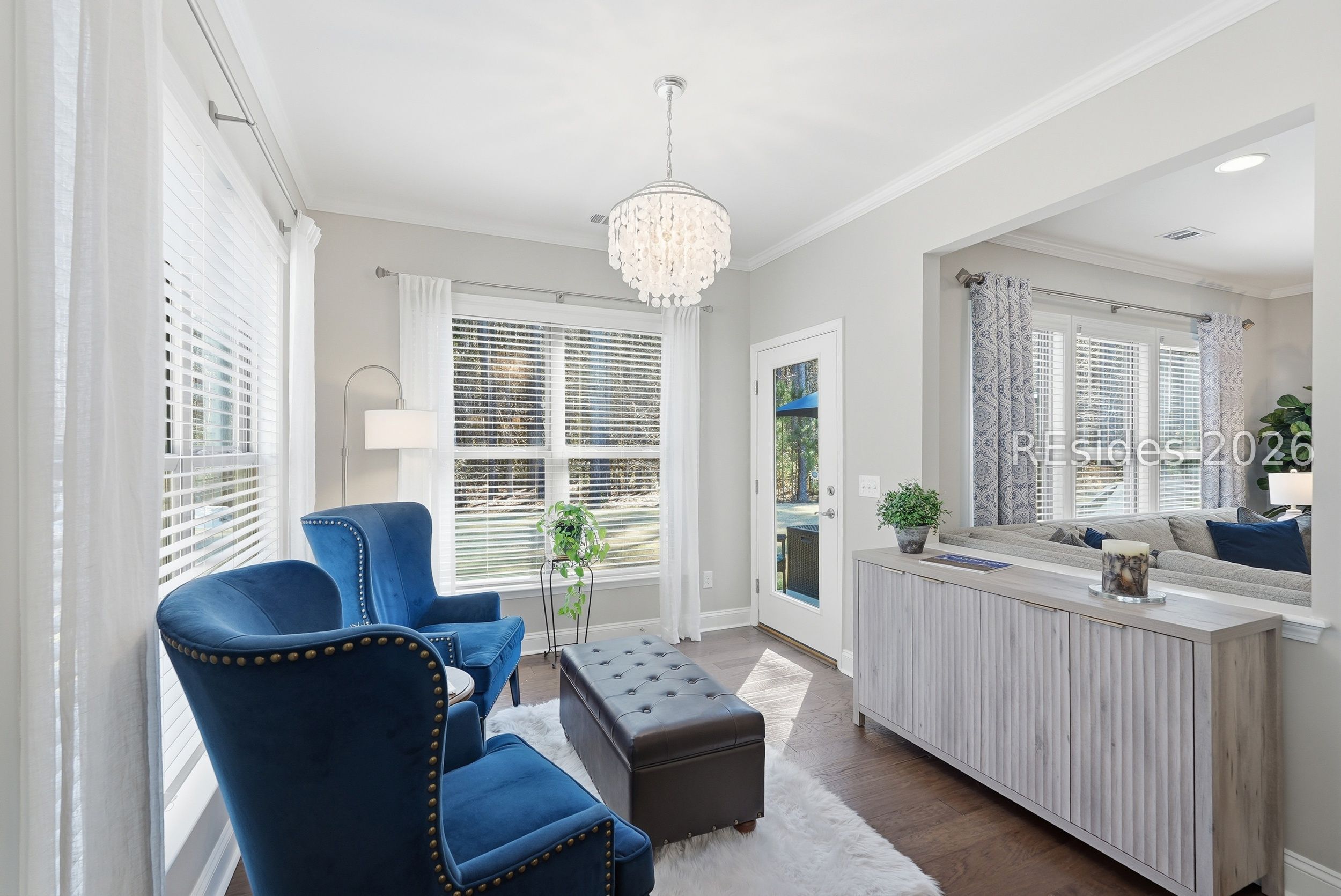 Exceptional privacy meets refined design in this immaculate 2019 Castle Rock, ideally located on the highly desirable North Side of Sun City Hilton Head. Private wooded views and tasteful designer upgrades elevate this beautifully maintained 2-bedroom, 2-bath home with versatile flex/office space. A striking stained glass front door welcomes you from the charming covered front porch, setting the tone for the inviting interiors. Hardwood flooring flows throughout the main living areas, complemented by crown molding, recessed lighting, and thoughtful architectural details. The gourmet kitchen impresses with KitchenAid stainless appliances, double ovens, a gas range, granite countertops, tile backsplash, custom pantry shelving, and an upgraded entertainment package featuring a built-in beverage refrigerator, sink and wine storage. A light-filled sunroom opens to a concrete patio framed by peaceful wooded privacy-ideal for relaxing or entertaining. The spacious primary suite offers a tray ceiling and an elegant frameless floor-to-ceiling tiled shower with bench and transom window. An extended finished garage with utility sink and custom storage adds exceptional functionality and organization. Enjoy championship golf, resort-style pools, fitness centers, tennis, pickleball, scenic walking trails, and the vibrant lifestyle that makes Sun City Hilton Head so sought-after.