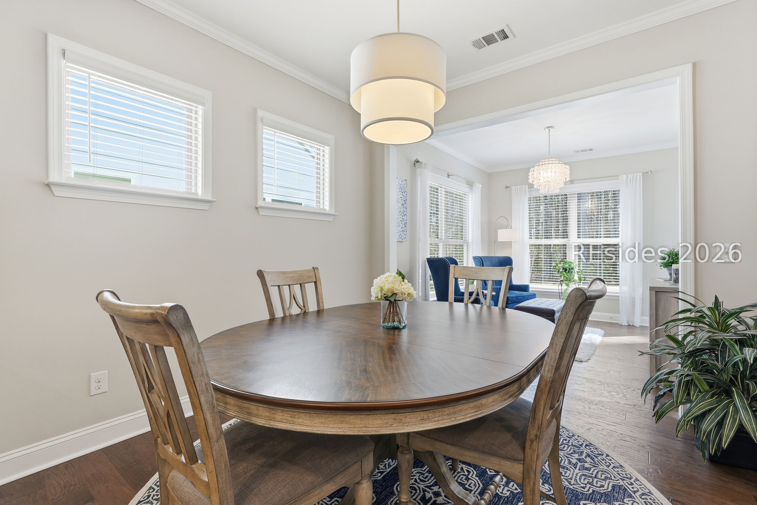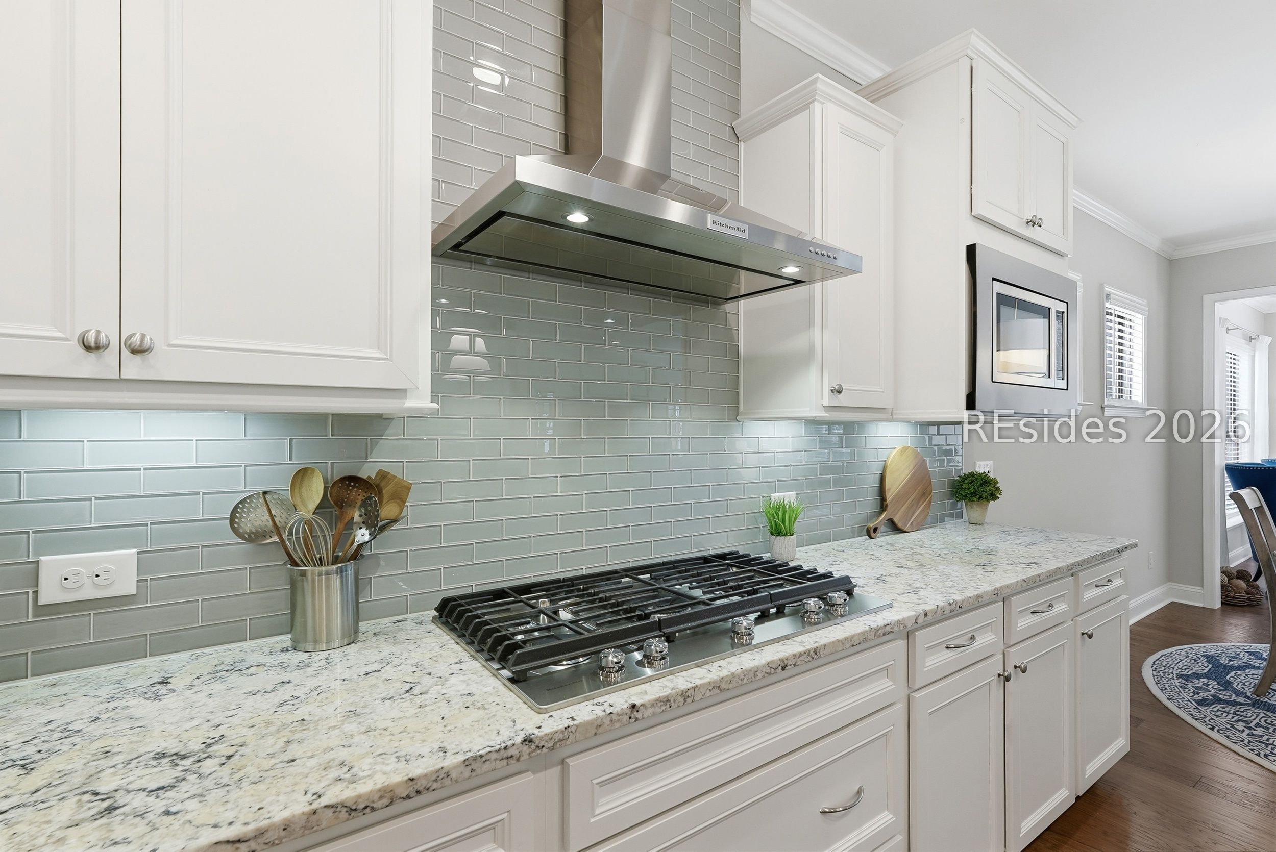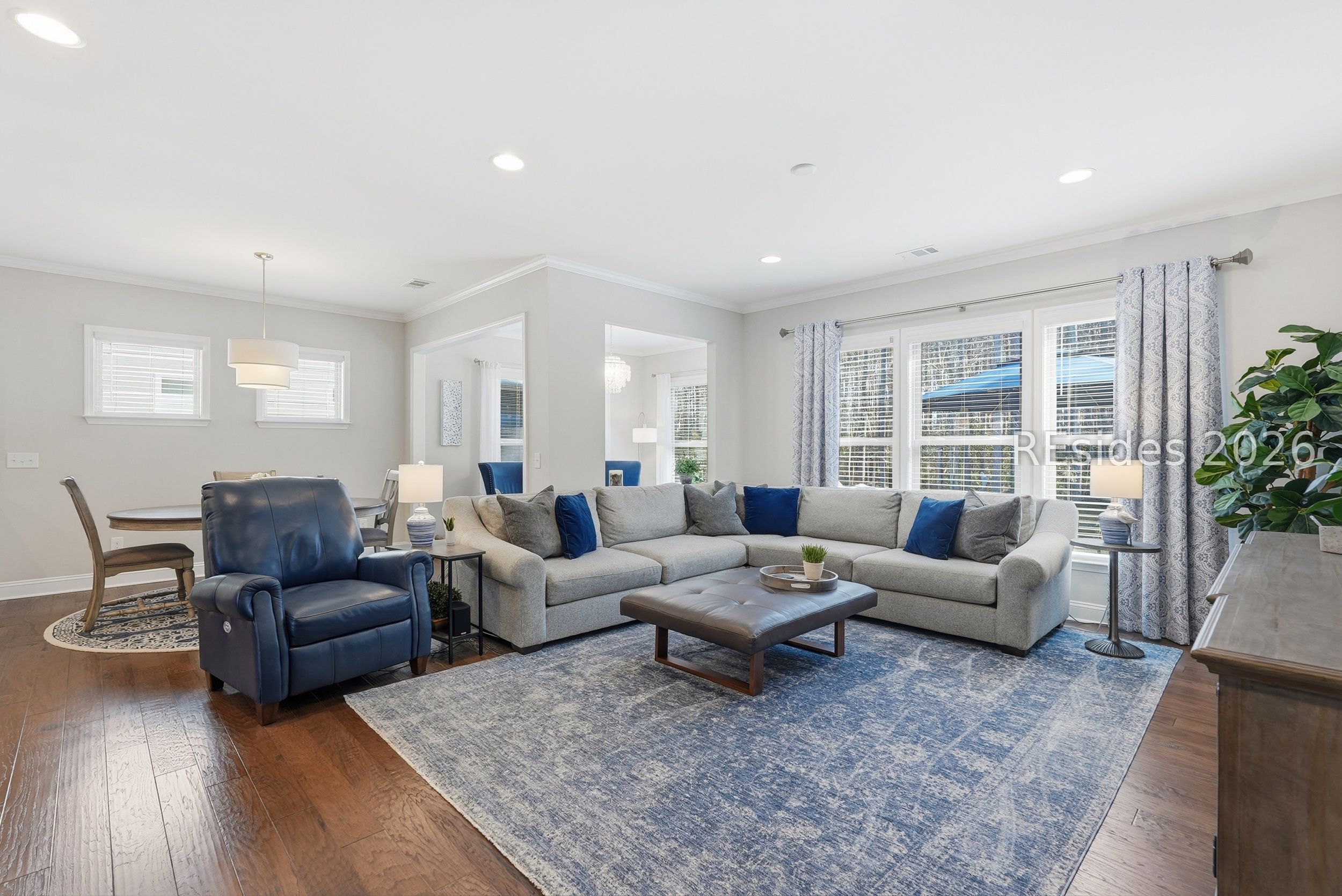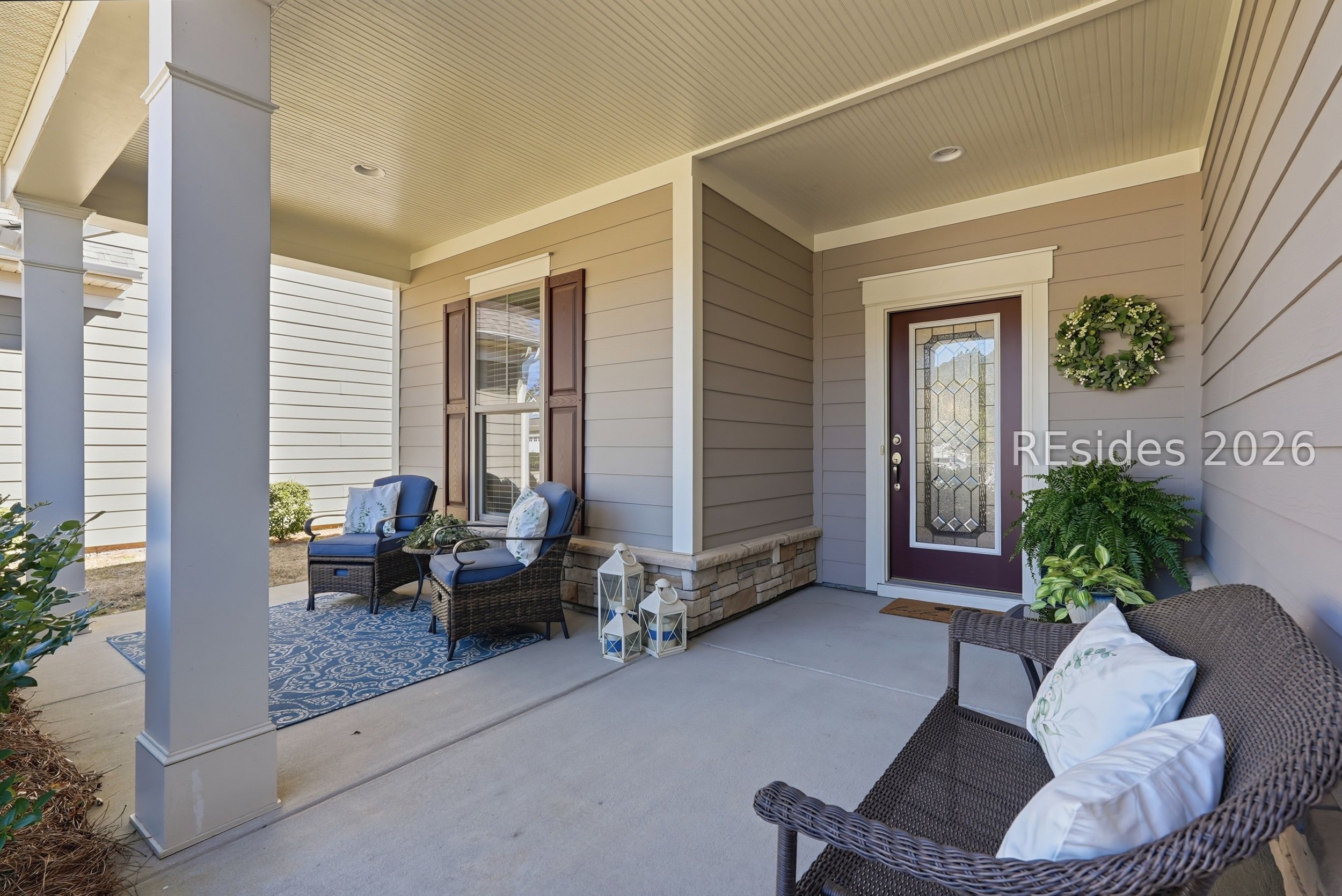 Exceptional privacy meets refined design in this immaculate 2019 Castle Rock, ideally located on the highly desirable North Side of Sun City Hilton Head. Private wooded views and tasteful designer upgrades elevate this beautifully maintained 2-bedroom, 2-bath home with versatile flex/office space. A striking stained glass front door welcomes you from the charming covered front porch, setting the tone for the inviting interiors. Hardwood flooring flows throughout the main living areas, complemented by crown molding, recessed lighting, and thoughtful architectural details. The gourmet kitchen impresses with KitchenAid stainless appliances, double ovens, a gas range, granite countertops, tile backsplash, custom pantry shelving, and an upgraded entertainment package featuring a built-in beverage refrigerator, sink and wine storage. A light-filled sunroom opens to a concrete patio framed by peaceful wooded privacy-ideal for relaxing or entertaining. The spacious primary suite offers a tray ceiling and an elegant frameless floor-to-ceiling tiled shower with bench and transom window. An extended finished garage with utility sink and custom storage adds exceptional functionality and organization. Enjoy championship golf, resort-style pools, fitness centers, tennis, pickleball, scenic walking trails, and the vibrant lifestyle that makes Sun City Hilton Head so sought-after.