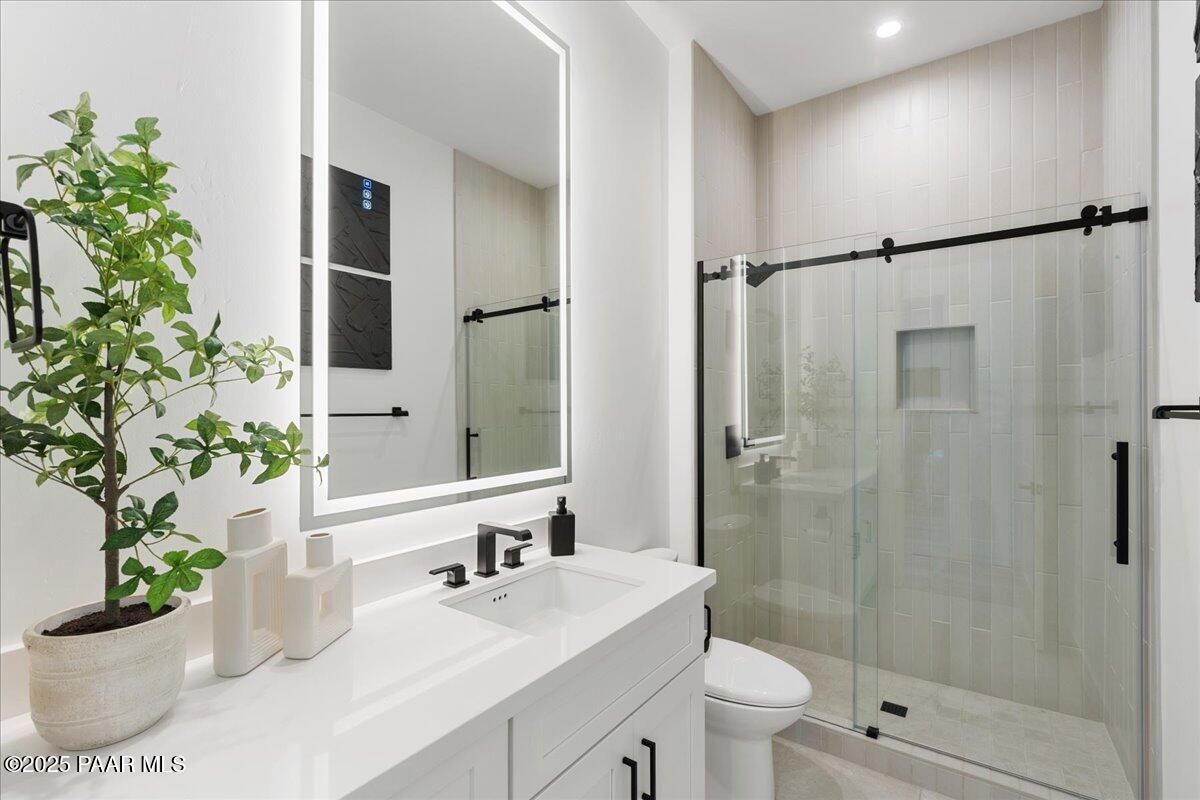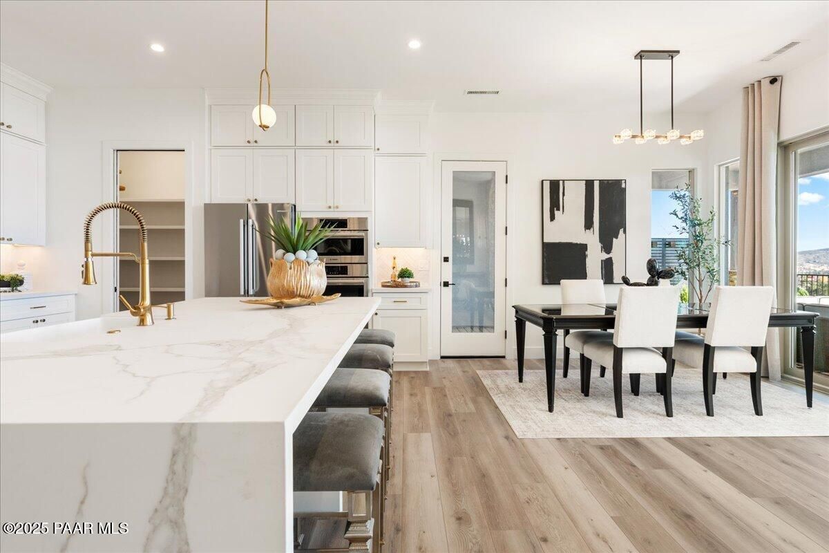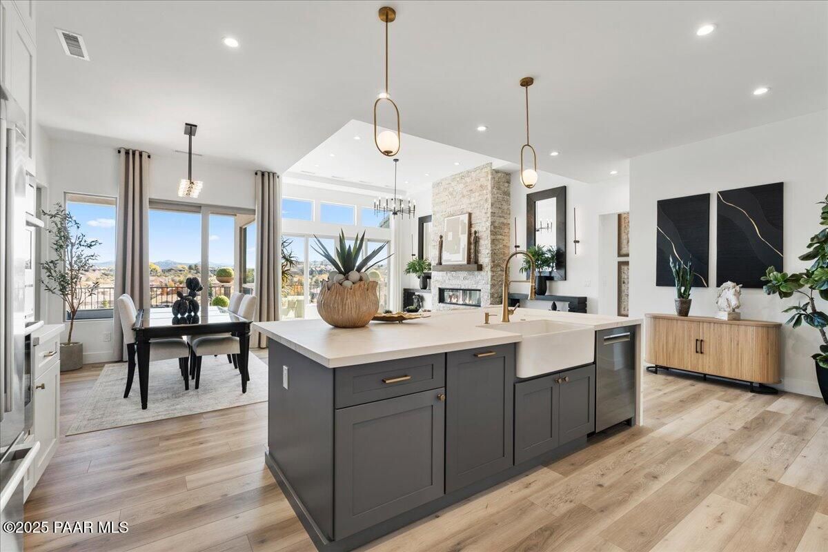 NEW CONTEMPORARY MODERN RANCH - IMMEDIATE MOVE-IN - WHY WAIT TO BUILD - Experience modern luxury with sweeping panoramic views on one of the best lots in Solstice Ridge II. Perched high above the golf course with Granite Dells, Golf Greens, fairways & distant mountains. Features an open concept design with gourmet kitchen, shaker white cabinets, designer hardware, Bosch appliances, Calacatta honed porcelain counters, farmhouse sink, 60'' linear FP with stack stone face & ruff sawn mantle, 12ft tray ceiling in GR. Primary suite w/ spa-style bath, Large Walk-in shower, Sensi Roma 24x48 'anti slip porcelain tile, and walk-in closet. Enjoy a seamless indoor-outdoor lifestyle with a private view deck. Large 3 car garage. Short walk to the Prescott Lakes Clubhouse with numerous amenities.