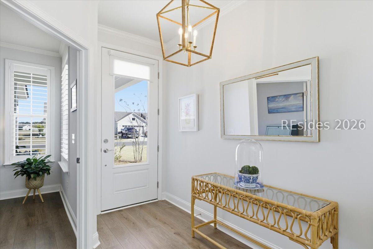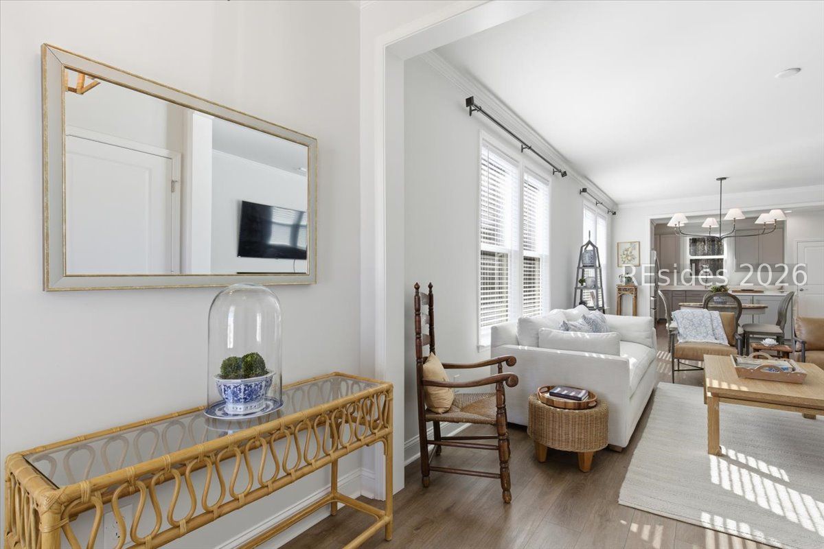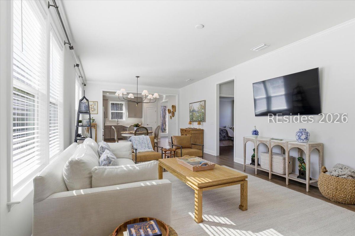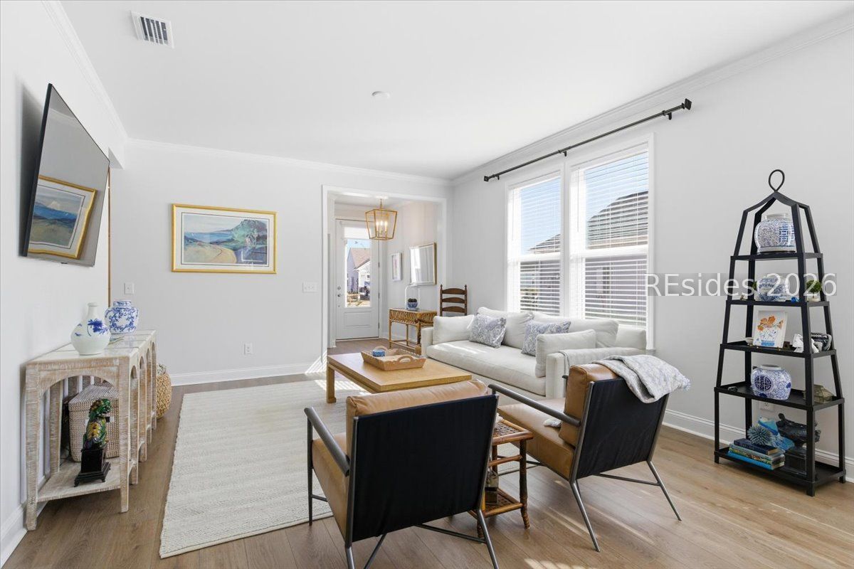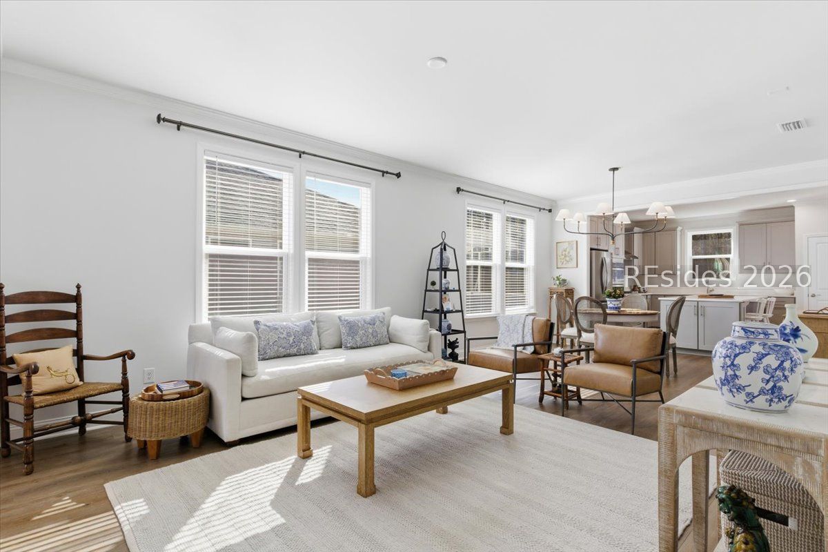 Experience the pinnacle of low-country living in this nearly new 2-bedroom, 2-bathroom Compass model, perfectly situated on a premium, oversized wooded homesite in Sun City's newest campus. Unlike other new builds, this home offers the luxury of modern upgrades without the noise or dust of active construction nearby. The interior is defined by high-end finishes, including luxury vinyl plank (LVP) flooring throughout and elegant crown molding. At the heart of the home, the gourmet kitchen serves as a chef's sanctuary, boasting a 5-burner gas cooktop, sleek quartz countertops, a stainless steel hood, and a spacious island.The open-concept layout flows seamlessly into a bright Carolina room, providing the ideal spot to enjoy serene views of the private, wooded backyard. The primary suite serves as a sophisticated retreat, featuring a spa-like bathroom with a tiled shower and a frameless glass door. Complete with a versatile flex room-perfect for a home office or hobby space-this residence combines comfort and style in one of the region's most sought-after active adult communities.