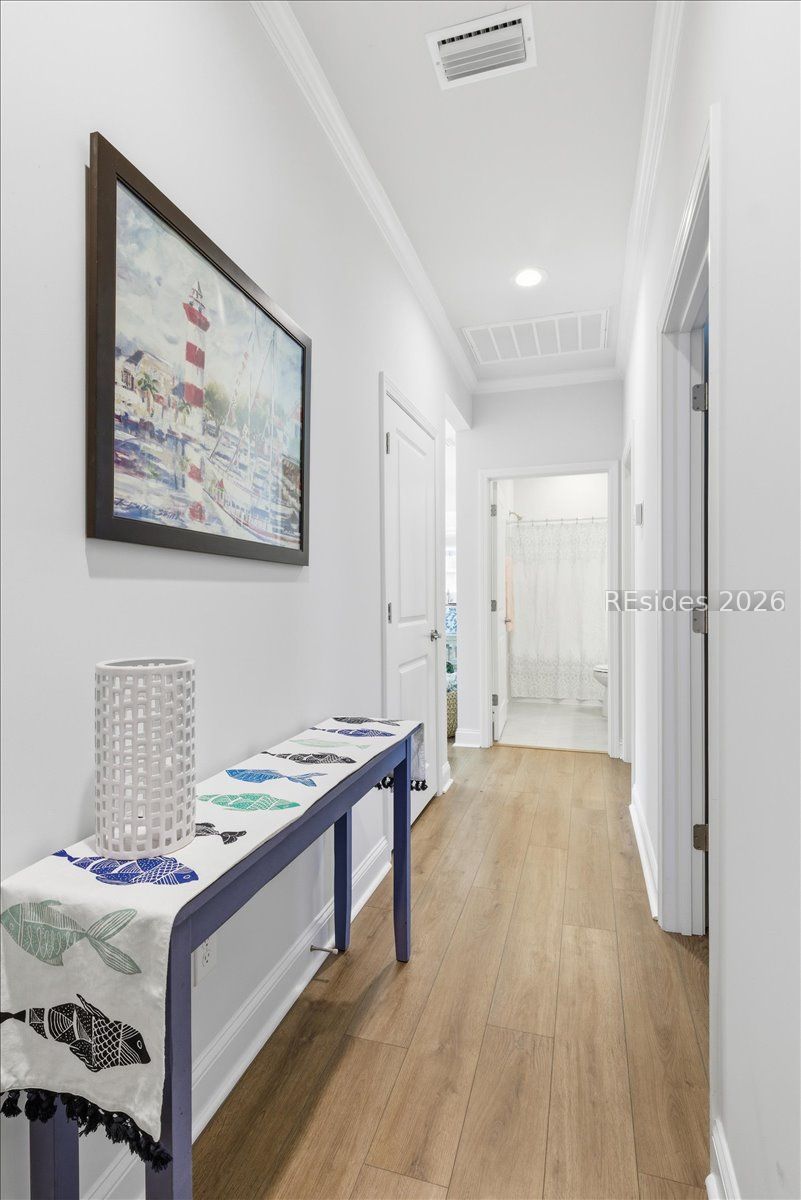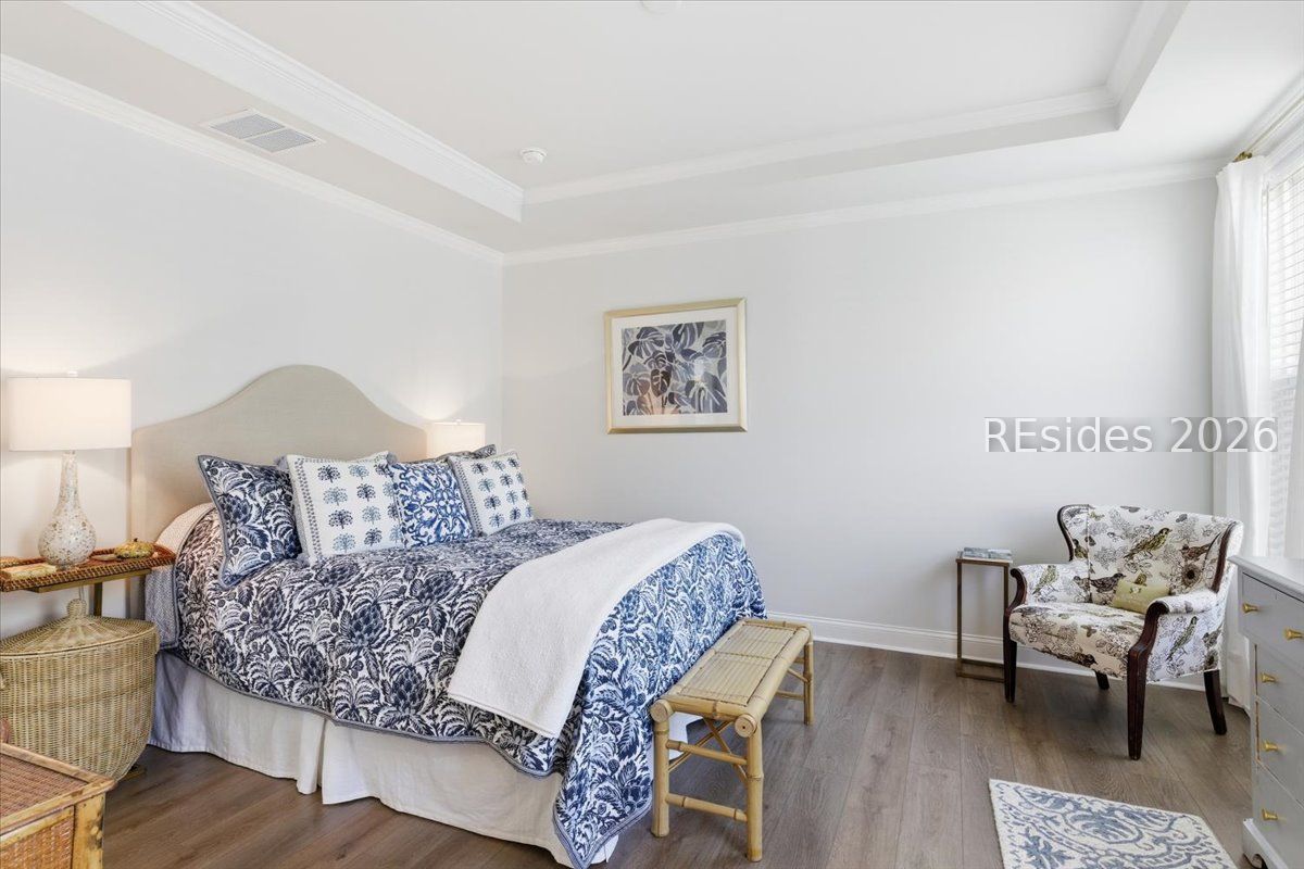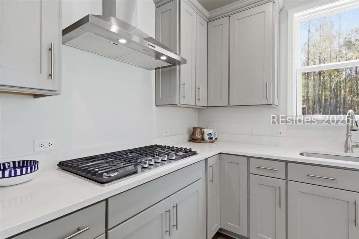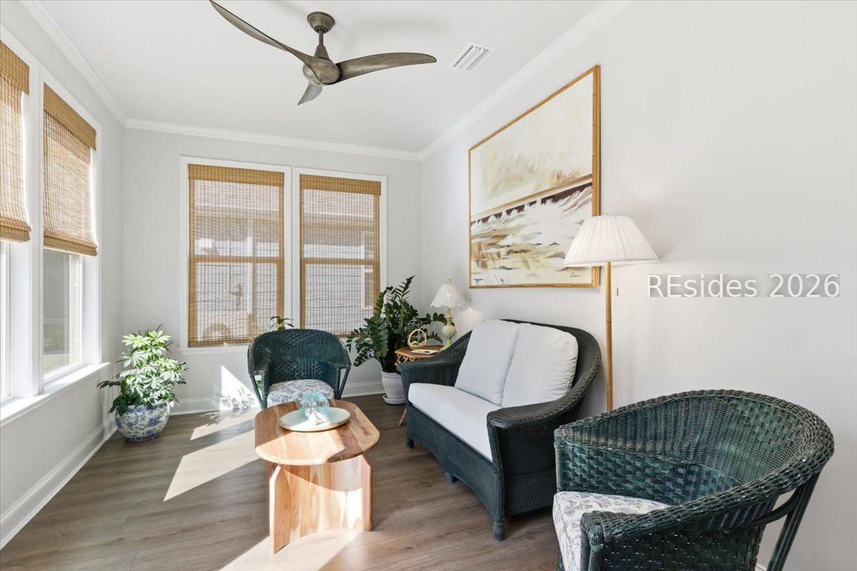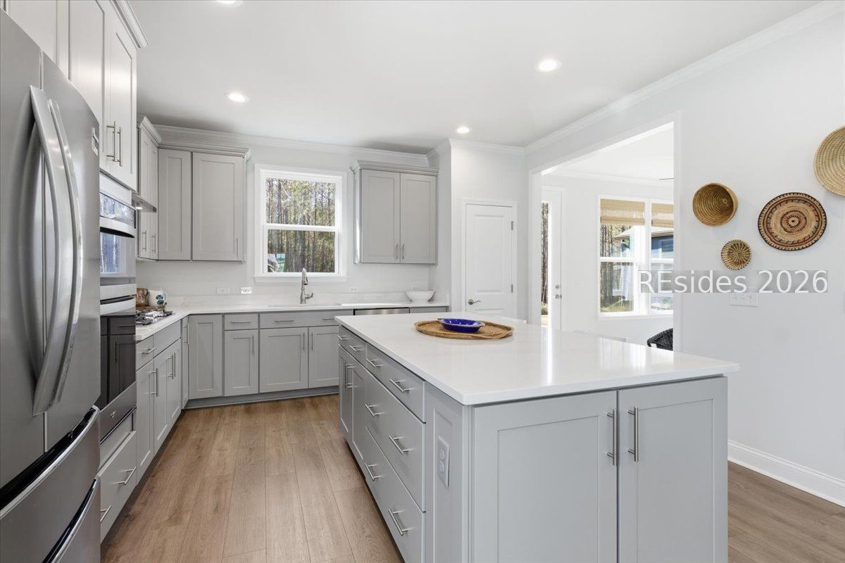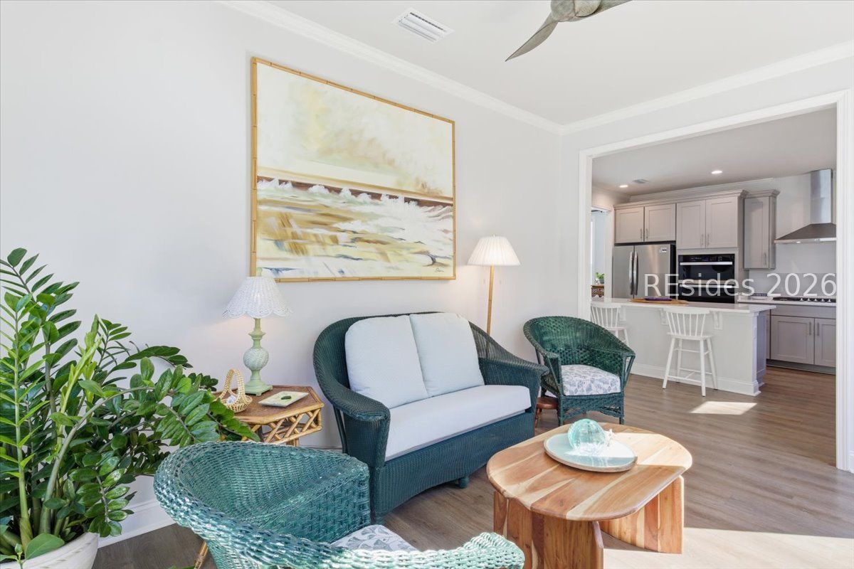 Experience the pinnacle of low-country living in this nearly new 2-bedroom, 2-bathroom Compass model, perfectly situated on a premium, oversized wooded homesite in Sun City's newest campus. Unlike other new builds, this home offers the luxury of modern upgrades without the noise or dust of active construction nearby. The interior is defined by high-end finishes, including luxury vinyl plank (LVP) flooring throughout and elegant crown molding. At the heart of the home, the gourmet kitchen serves as a chef's sanctuary, boasting a 5-burner gas cooktop, sleek quartz countertops, a stainless steel hood, and a spacious island.The open-concept layout flows seamlessly into a bright Carolina room, providing the ideal spot to enjoy serene views of the private, wooded backyard. The primary suite serves as a sophisticated retreat, featuring a spa-like bathroom with a tiled shower and a frameless glass door. Complete with a versatile flex room-perfect for a home office or hobby space-this residence combines comfort and style in one of the region's most sought-after active adult communities.