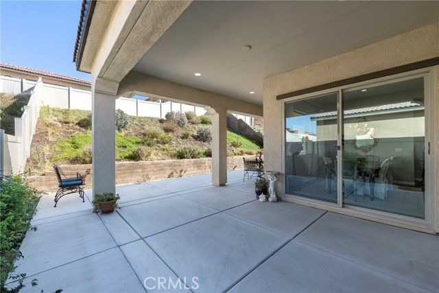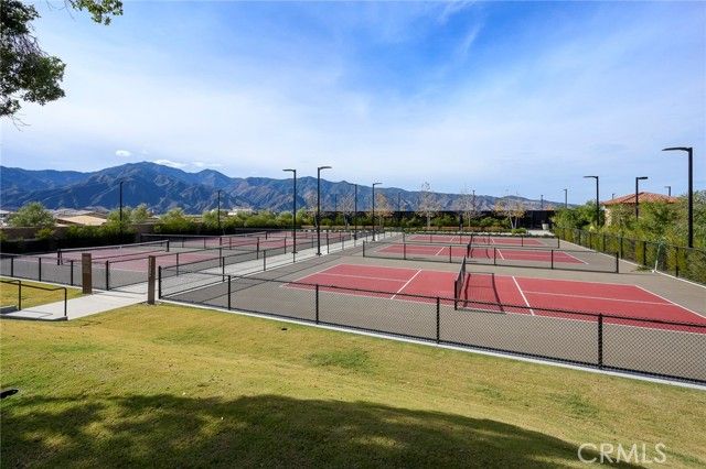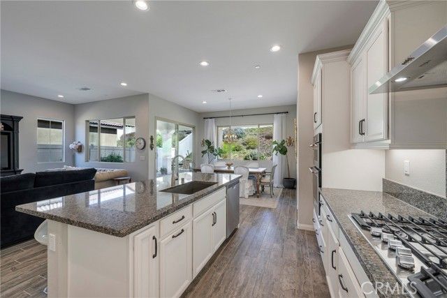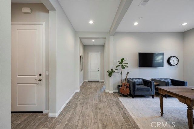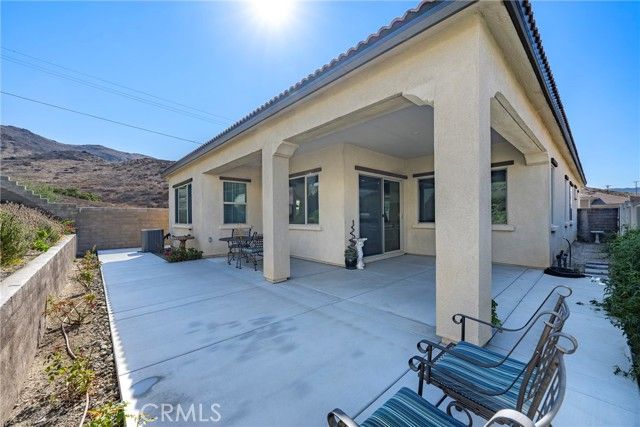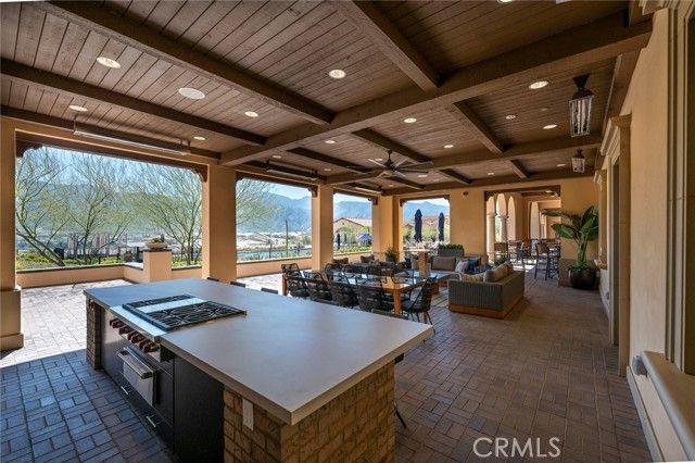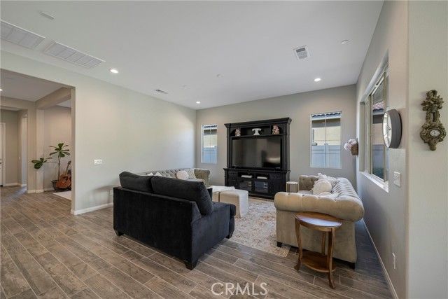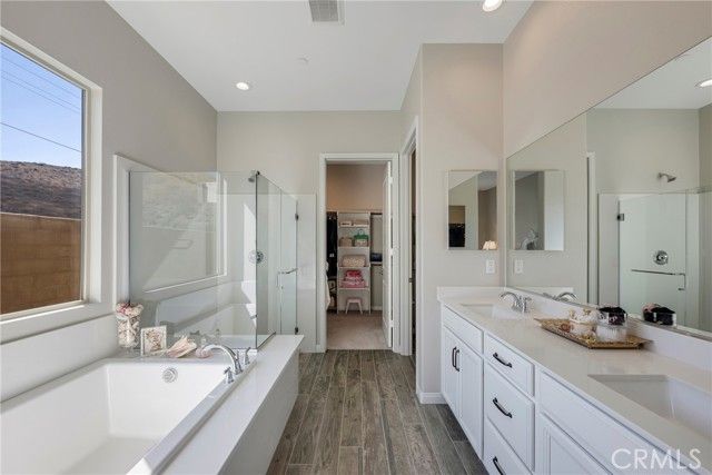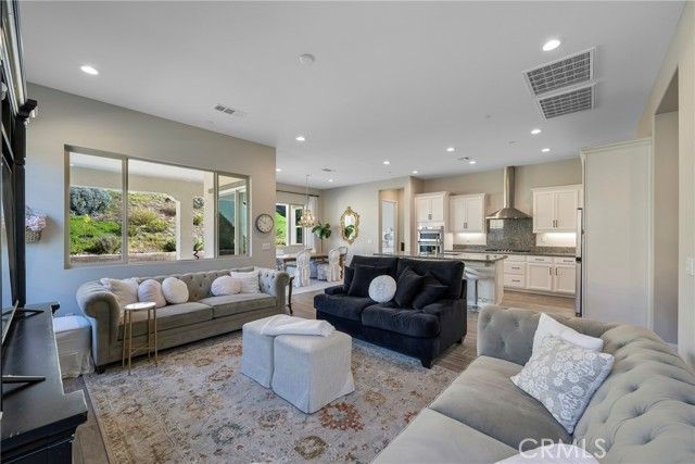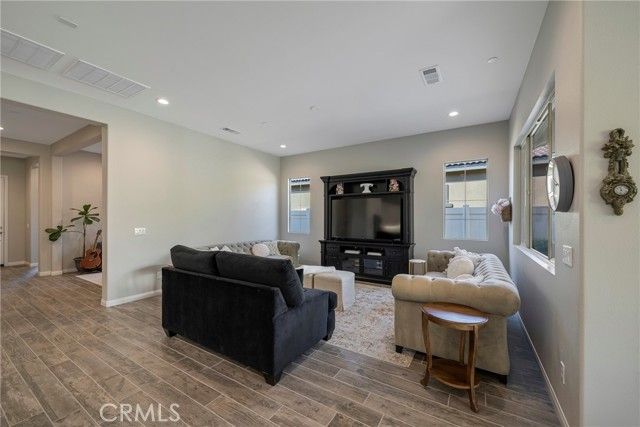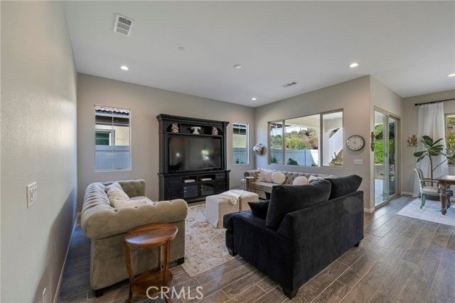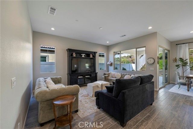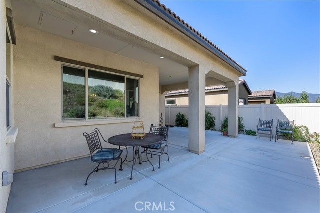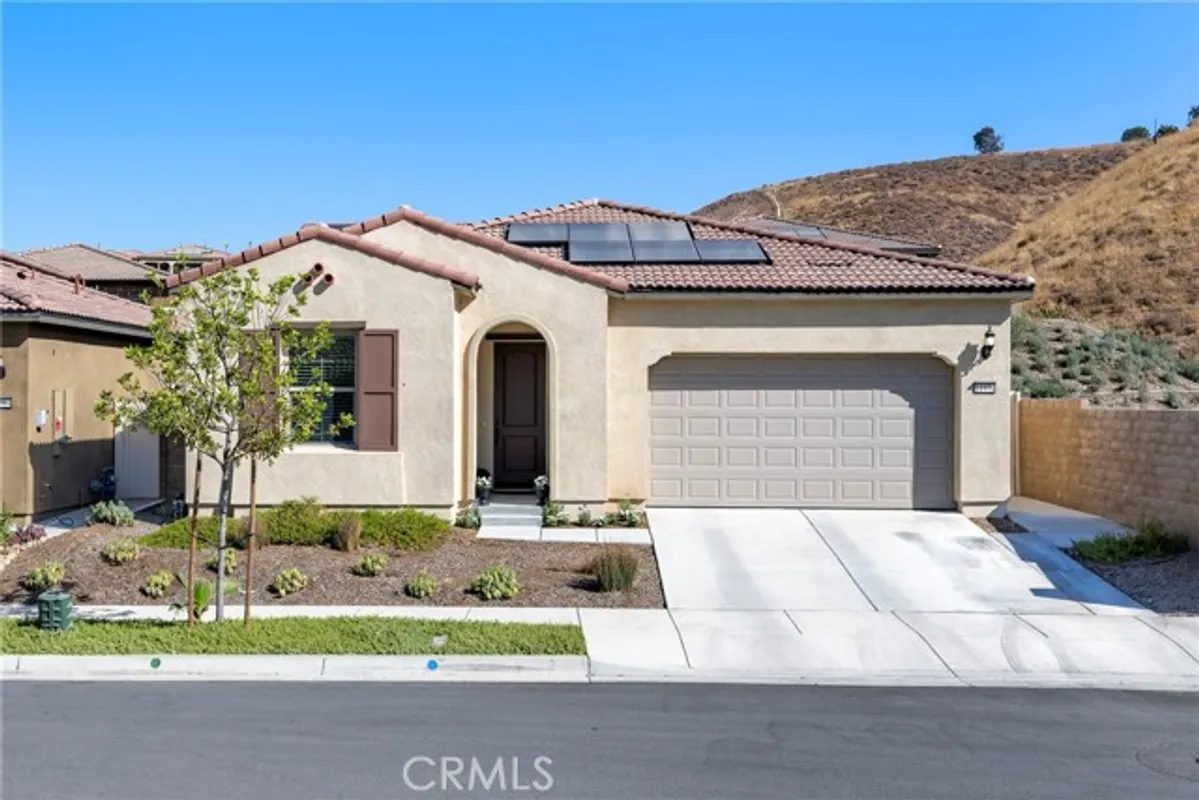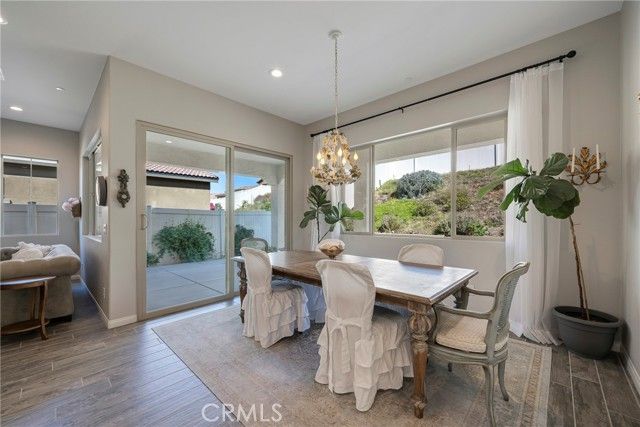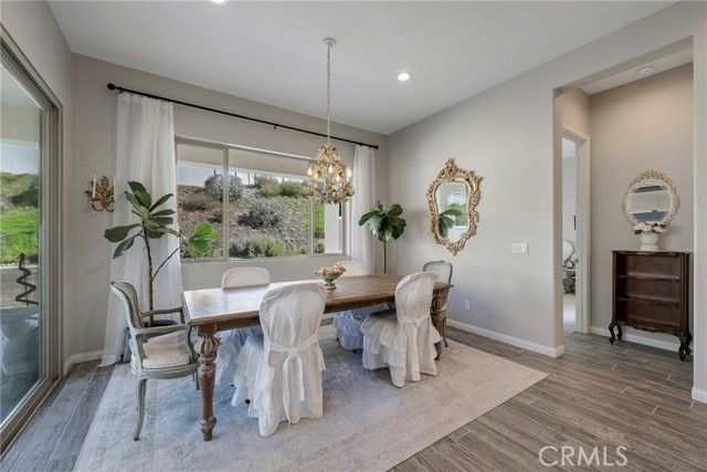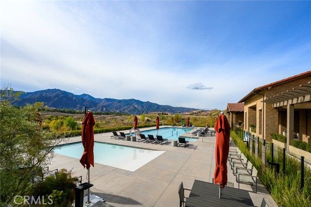 Beautiful Home in the 55+ Terramor Community! Step into this beautifully upgraded home and be welcomed by impressive 10-foot ceilings and luxury wood tile plank floors. The residence boasts upgraded cabinetry and hardware throughout, enhanced by designer paint and recessed lighting that fills the home with a bright and airy ambiance. The chef’s kitchen is a standout feature, offering staggered cabinets, under-cabinet lighting, upgraded stainless steel appliances, a sleek drop-in sink, and a pull-out trash system. A versatile flex space provides endless possibilities — perfect for a home office, guest room, or hobby space. The master suite is a serene retreat, featuring stunning views, an upgraded soaking tub, custom cabinetry, and a spacious walk-in closet. Enjoy your very private backyard with breathtaking mountain views, perfect for relaxation or entertaining. Additional features include a whole-house fan for comfort and energy efficiency, a leased solar system, and a private cul-de-sac location. Living in Terramor means enjoying resort-style amenities: two clubhouses, two outdoor swimming pools, an indoor swimming pool, spa, gym, sauna, game room, event room with a full bar, fire pits, and an outdoor cooking area. Stay active with pickleball courts, tennis courts, bocce ba