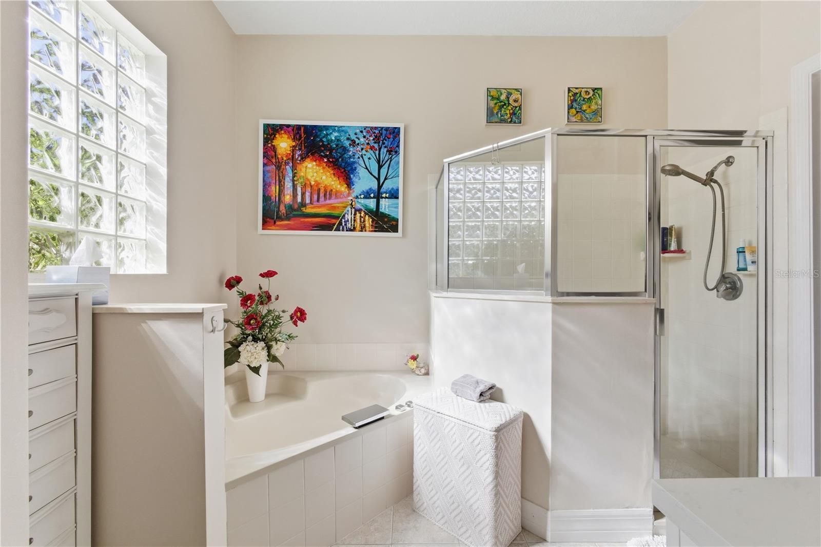 - Ceiling Fan(s), Crown Molding, Eat-in Kitchen, High Ceilings, Open Floorplan, Main Level Primary, Solid Surface Counters, Split Bedrooms, Stone Counters, Walk-In Closet(s), Window Treatments