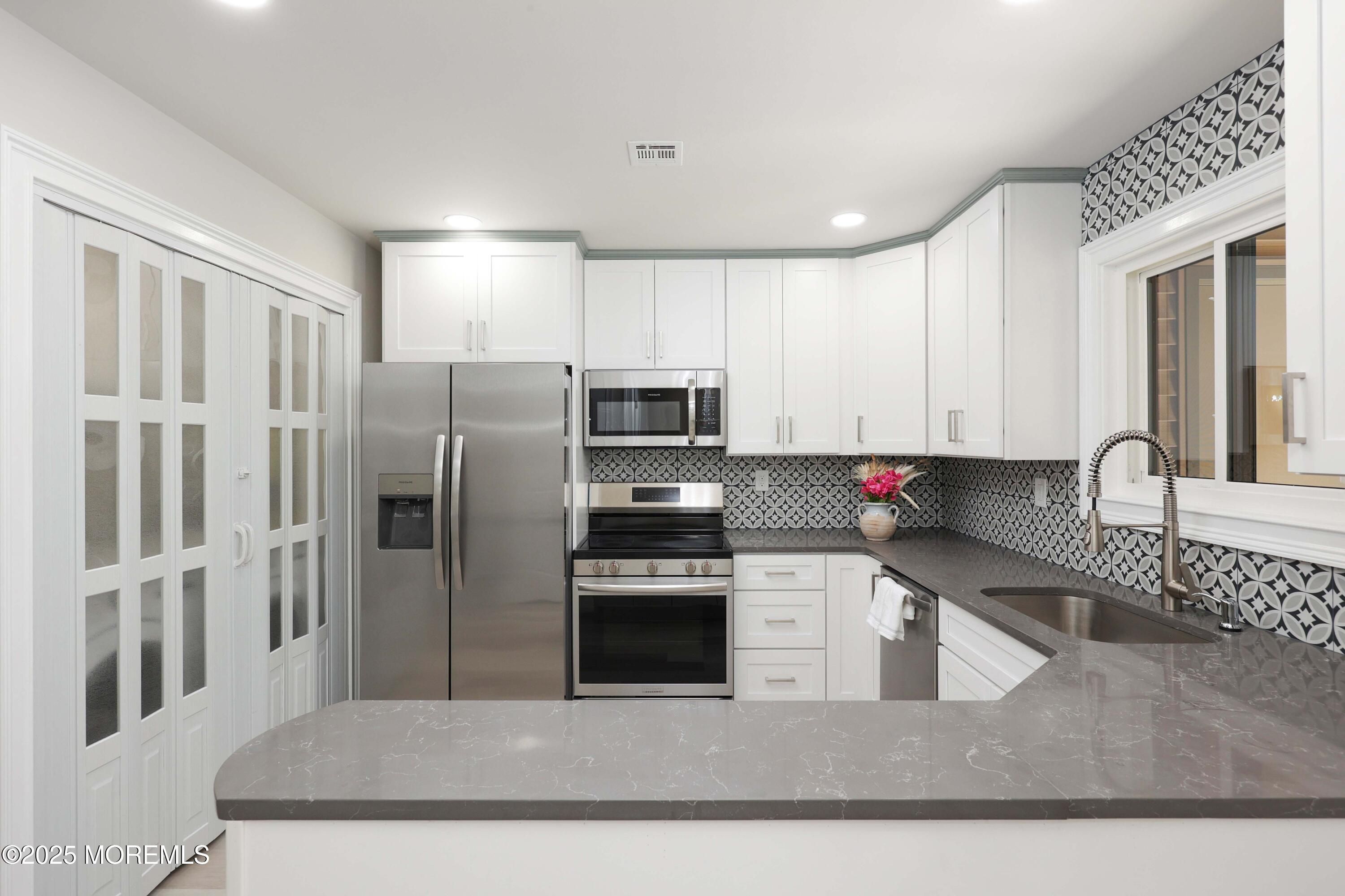 This is a COMING SOON listing and cannot be shown until Thursday, January 8, 2026. A stunning property that showcases the embodiment of elegance & modern living. Newly renovated, custom-designed Villa 600 Ranch model with an assigned parking spot right outside your front door offers a spacious, comfortable layout perfect for those seeking a relaxed, maintenance-free lifestyle & boasts two bedrooms, two bathrooms & a den. The primary bedroom has a large custom closet, offering plenty of storage options & ensuring a clutter-free environment. The bathrooms have been redesigned to include spa-like custom tile showers, extra storage & beautiful vanities with granite countertops. Step into the living space & be captivated by the many contemporary touches. A wall of glass doors seamlessly connects the outside terrace to the den, providing an easy place to entertain or enjoy the picturesque surroundings. Recessed LED lighting illuminates the condo throughout, enhancing the modern aesthetic & creating a warm & welcoming feeling. This ranch has several upgrades designed to enhance comfort & convenience. Glass French doors, new thermostats for optimal climate control, luxury vinyl flooring in every room, new sliders & entrance door. The new HVAC system keeps the home cool during hot summer & cozy during the chilly winter months. The heart of this home is a brand-new kitchen blending functionality & style featuring stainless steel appliances, white shaker cabinets & granite countertops. Residents of Shadow Lake Village enjoy a host of amenities & community features, including access to a clubhouse, fitness center, swimming pool, & beautifully landscaped grounds. With convenient proximity to shopping, dining, & entertainment options, this property offers a truly exceptional lifestyle.