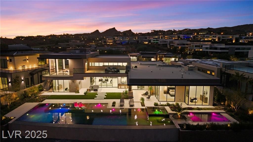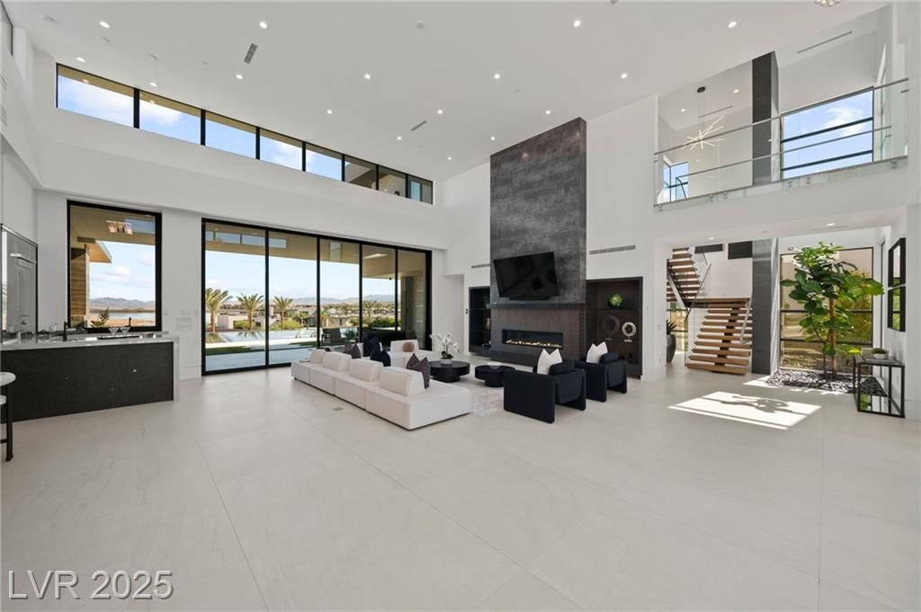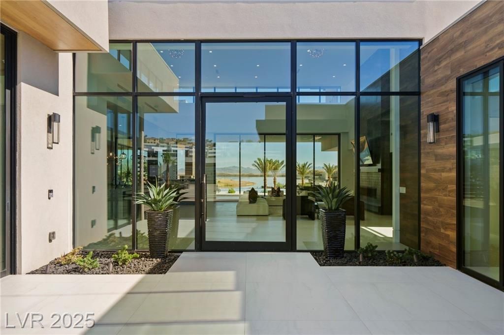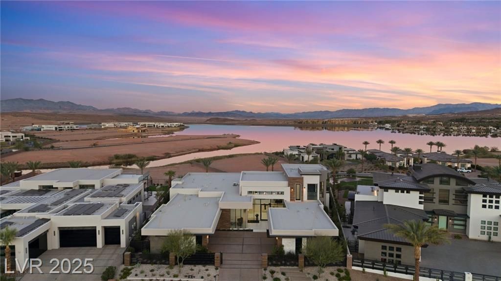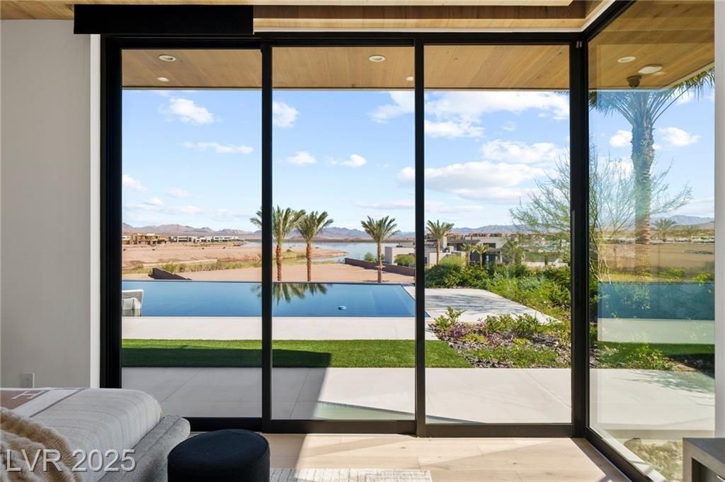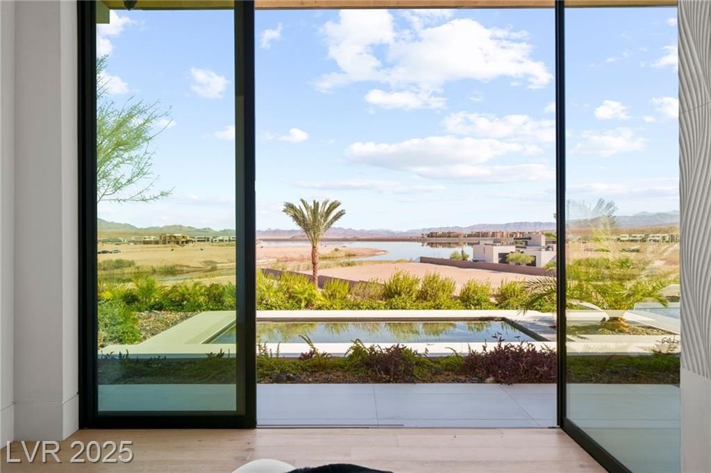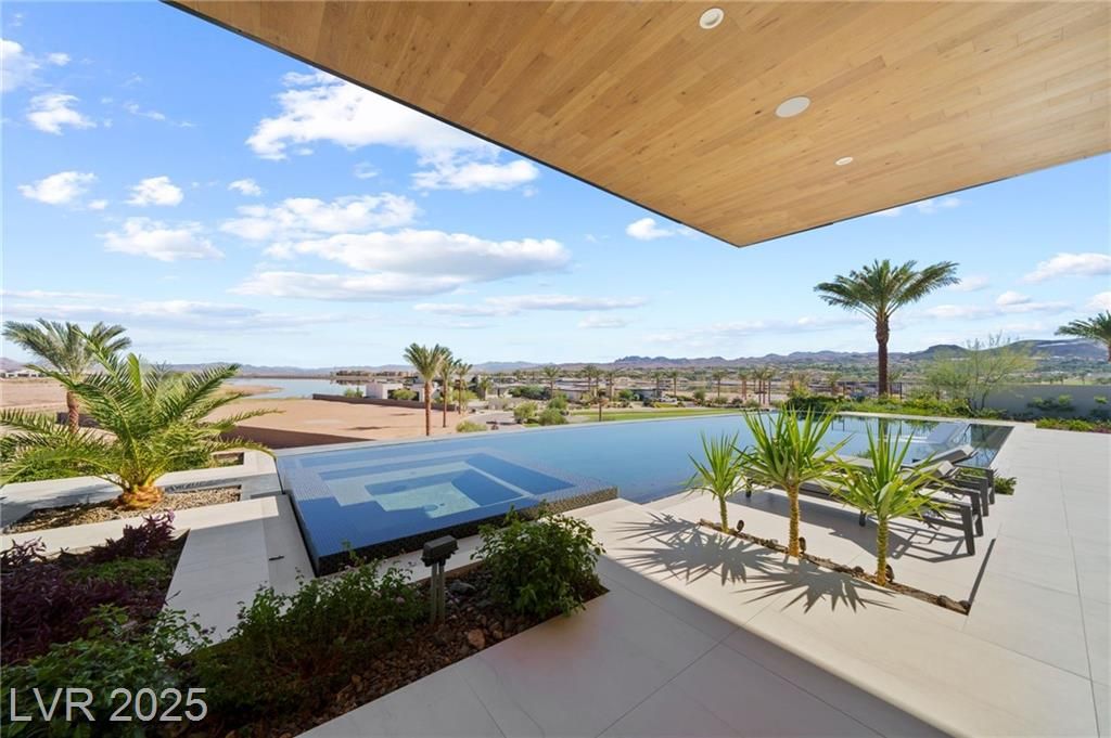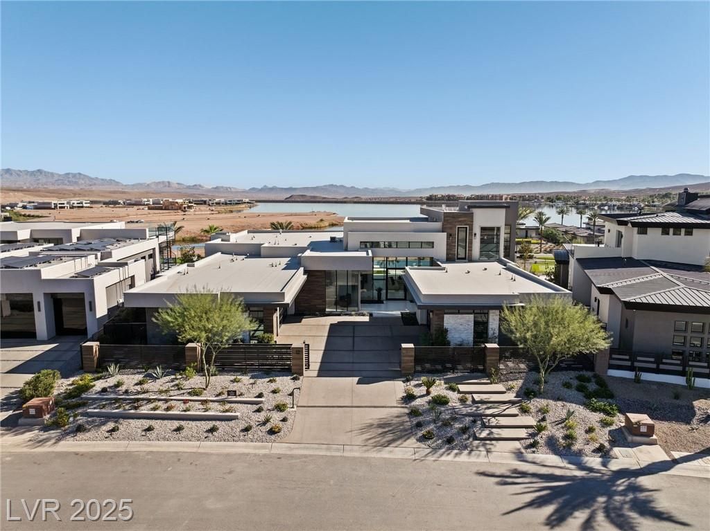 Exquisite lake view custom estate, tucked behind triple gates in LakeLas Vegas, exudes sophistication with a one-story layout and an upstairsen suite loft & sky deck. Soaring floor-to-ceiling windowsreveal sweeping lake views, while corner pocket doors create a seamlesstransition to a grand negative-edge lap pool with stunning light features. In/Out bar & gourmet kitchen is a showcase of culinary artistry,w/ quartzite counters, waterfall islands, designer lighting, floor to ceilingcabinetry, Thermador appliances, wine cooler & glass wine case. A five-car garage,courtyard with electric gate add refinement andease. All bedrooms are en suite sanctuaries, showcasing stone finishes,spa-inspired bathrooms, and custom closets. The primary suite definesindulgence with a steam shower, floating vanities, multiple showerheads, and patio access. Blending bold architecture with serene resortsurroundings, this estate is exceptional in design, comfort, andtimeless elegance!