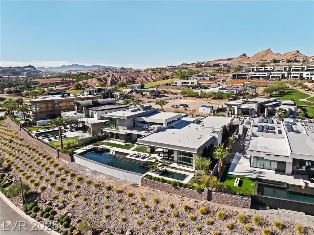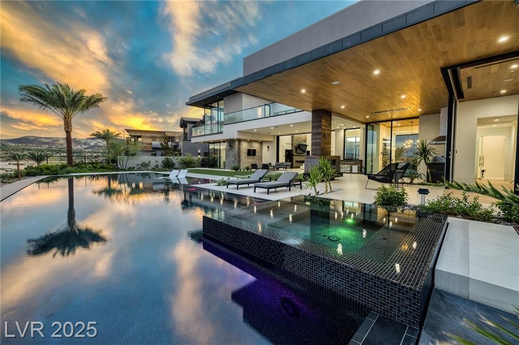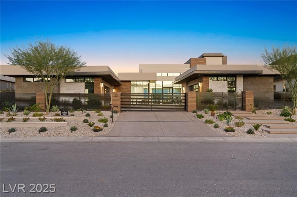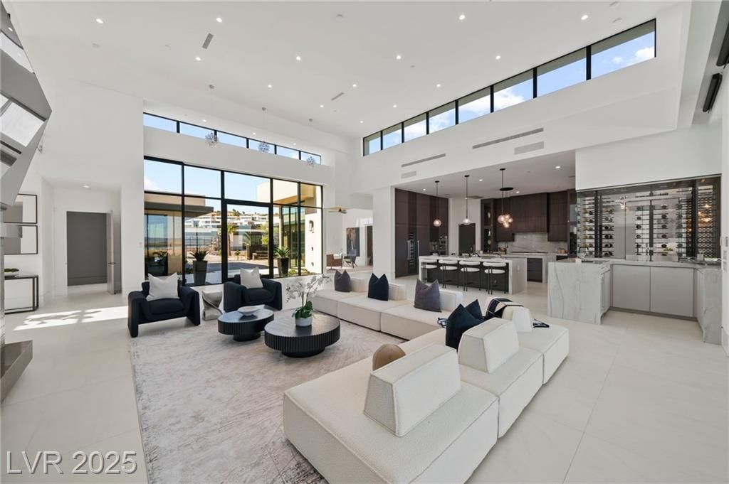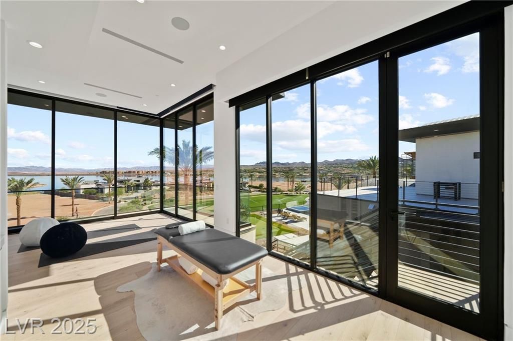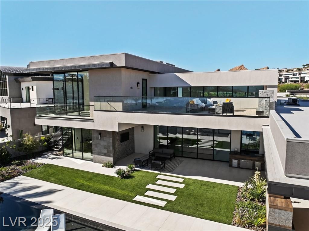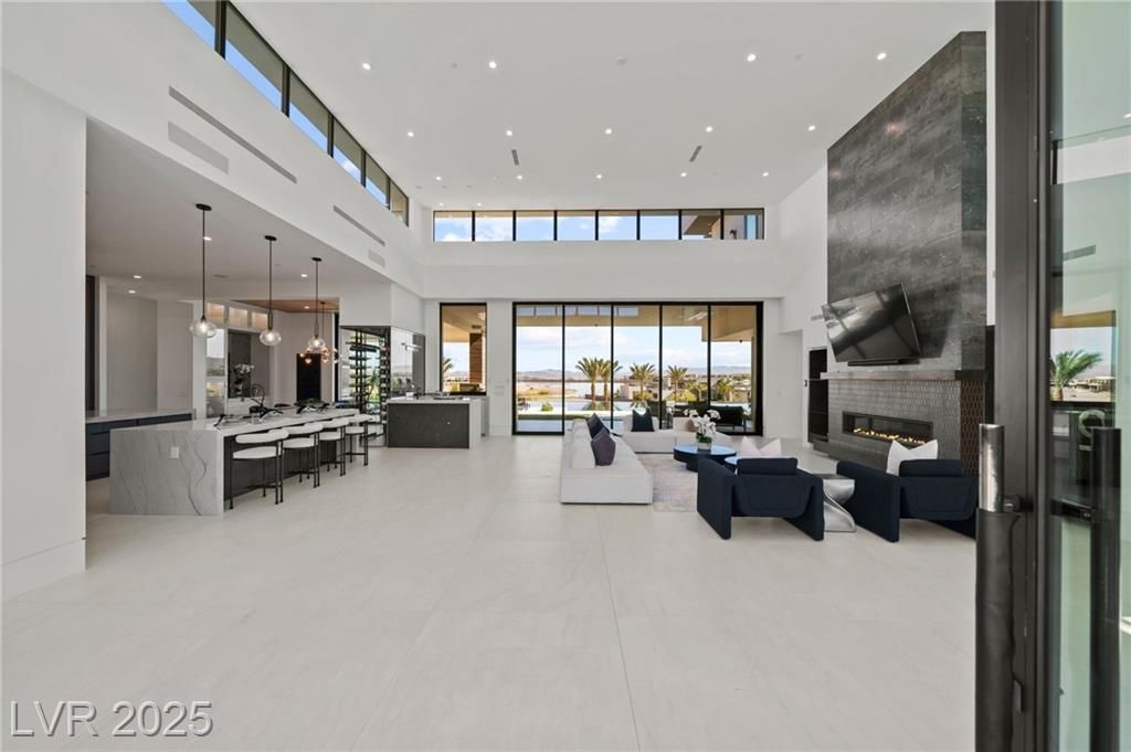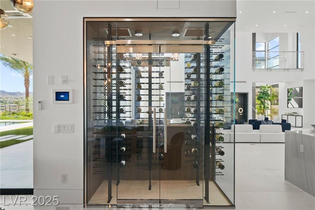 Exquisite lake view custom estate, tucked behind triple gates in LakeLas Vegas, exudes sophistication with a one-story layout and an upstairsen suite loft & sky deck. Soaring floor-to-ceiling windowsreveal sweeping lake views, while corner pocket doors create a seamlesstransition to a grand negative-edge lap pool with stunning light features. In/Out bar & gourmet kitchen is a showcase of culinary artistry,w/ quartzite counters, waterfall islands, designer lighting, floor to ceilingcabinetry, Thermador appliances, wine cooler & glass wine case. A five-car garage,courtyard with electric gate add refinement andease. All bedrooms are en suite sanctuaries, showcasing stone finishes,spa-inspired bathrooms, and custom closets. The primary suite definesindulgence with a steam shower, floating vanities, multiple showerheads, and patio access. Blending bold architecture with serene resortsurroundings, this estate is exceptional in design, comfort, andtimeless elegance!