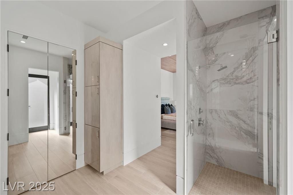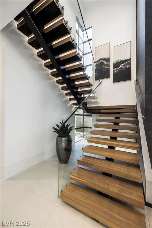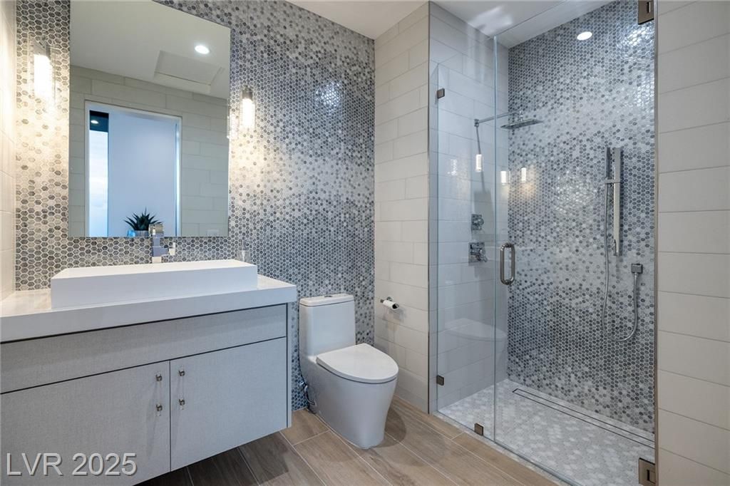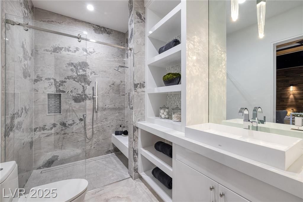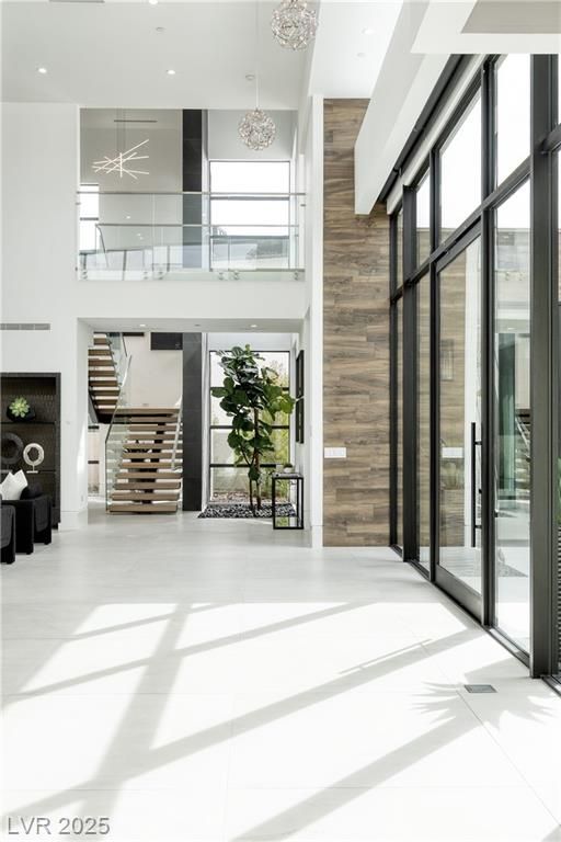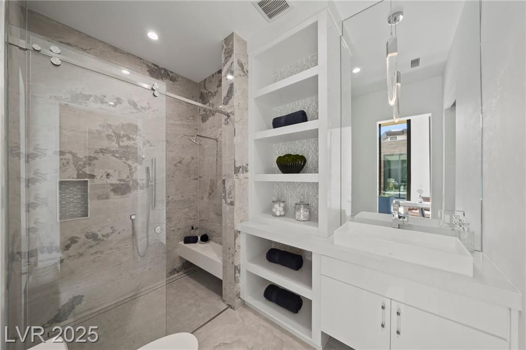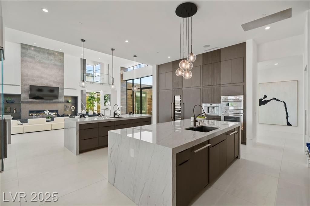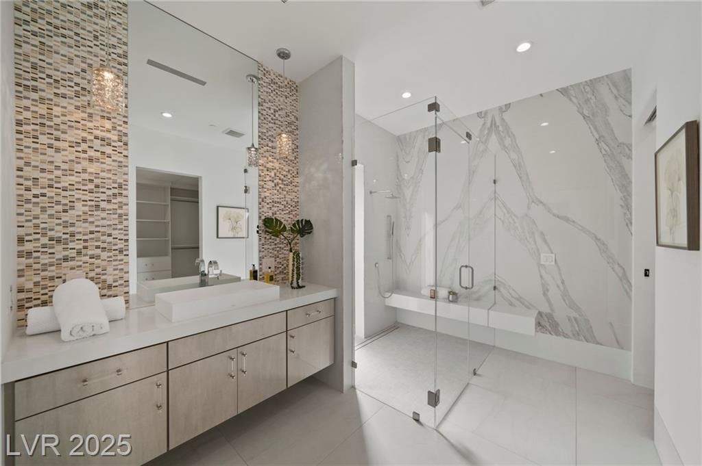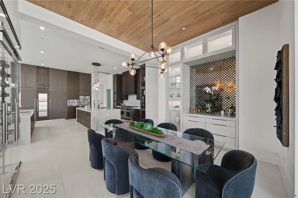 Exquisite lake view custom estate, tucked behind triple gates in LakeLas Vegas, exudes sophistication with a one-story layout and an upstairsen suite loft & sky deck. Soaring floor-to-ceiling windowsreveal sweeping lake views, while corner pocket doors create a seamlesstransition to a grand negative-edge lap pool with stunning light features. In/Out bar & gourmet kitchen is a showcase of culinary artistry,w/ quartzite counters, waterfall islands, designer lighting, floor to ceilingcabinetry, Thermador appliances, wine cooler & glass wine case. A five-car garage,courtyard with electric gate add refinement andease. All bedrooms are en suite sanctuaries, showcasing stone finishes,spa-inspired bathrooms, and custom closets. The primary suite definesindulgence with a steam shower, floating vanities, multiple showerheads, and patio access. Blending bold architecture with serene resortsurroundings, this estate is exceptional in design, comfort, andtimeless elegance!