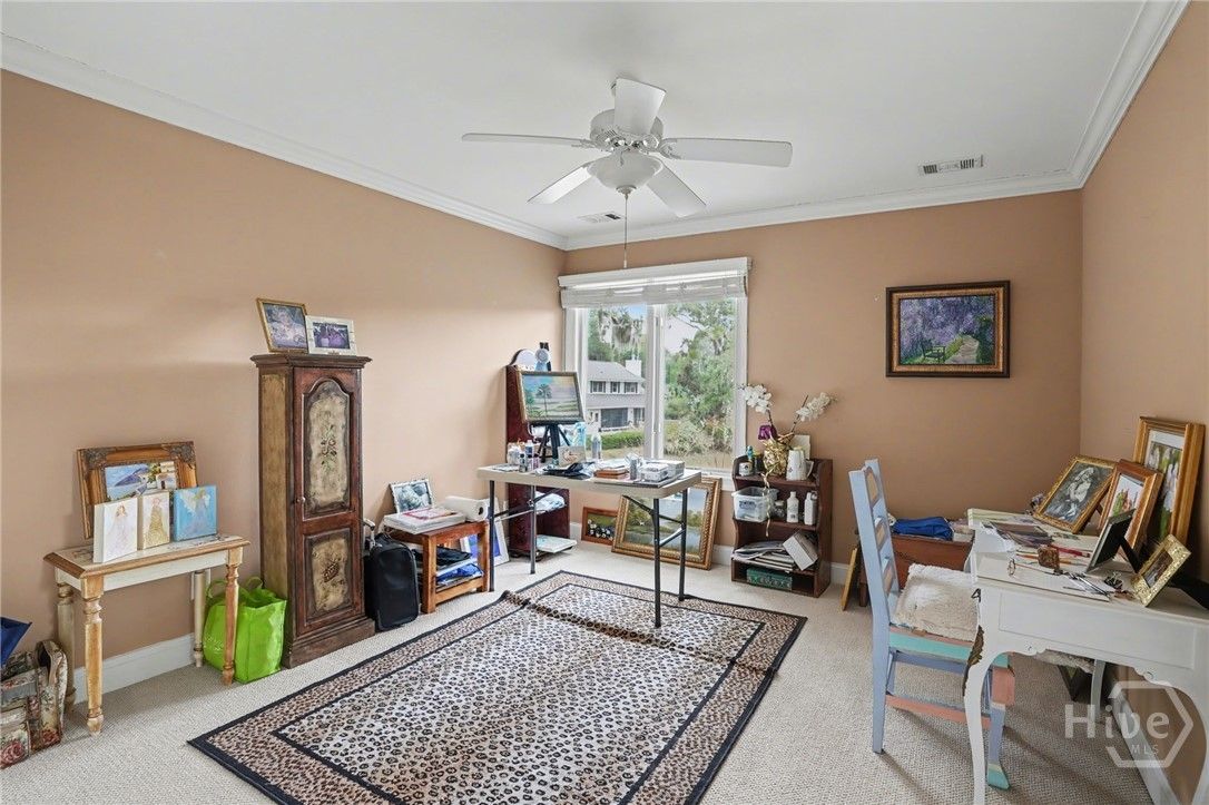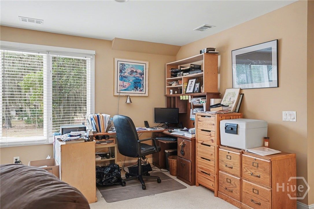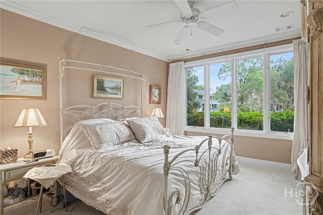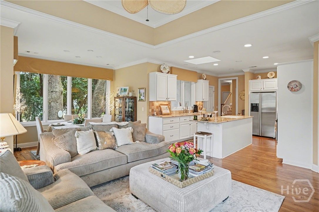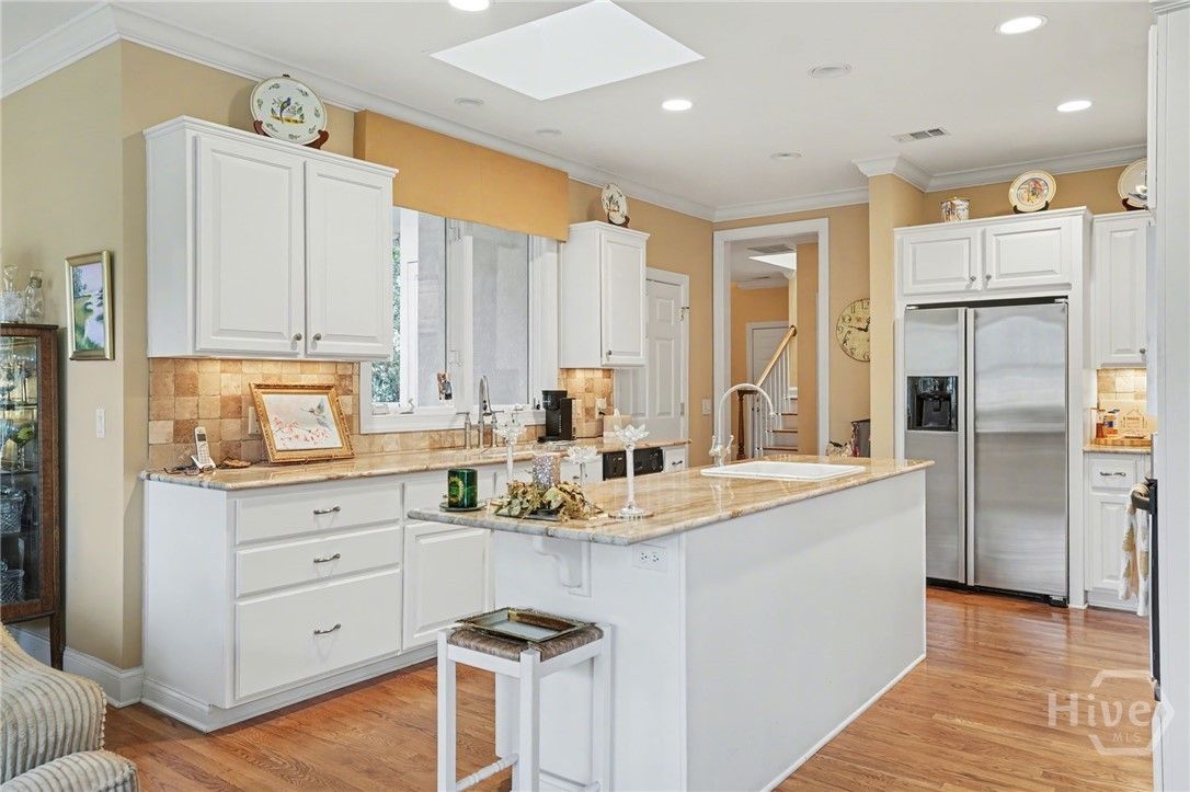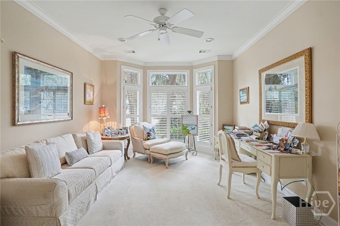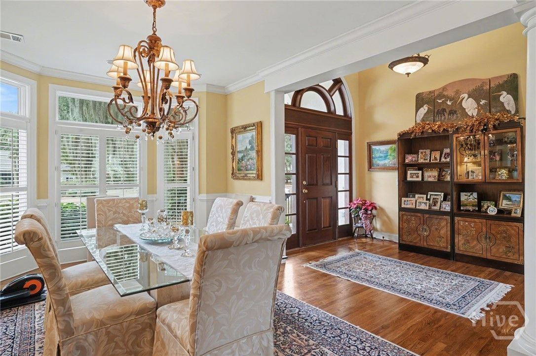 Located in the desirable Palmetto section of The Landings on Skidaway Island, this exceptional stucco home offers serene lagoon views and timeless coastal appeal. Enjoy peaceful mornings with coffee as the sun rises over the lagoon from the covered back porch. The spacious first-floor primary suite provides a private retreat featuring separate his-and-hers closets, double vanities, a whirlpool tub, and a walk-in shower. An adjoining private study creates the perfect space for working from home or relaxing with a good book. The main level also includes a welcoming formal living room with built-ins and a gas fireplace, a large formal dining room with built-ins, and a bright open kitchen with stainless steel appliances, center island, and cozy eat-in area. The kitchen opens to a casual sitting area, allowing you to take in beautiful lagoon views throughout the day. A well-appointed laundry room with sink and closet adds everyday convenience. Upstairs, two guest bedrooms with full baths provide comfortable accommodations for family and guests. A large ensuite bonus room—with its own full bath and generous closet—easily serves as a fourth bedroom. Additional highlights include extensive moldings, beautiful hardwood flooring, abundant closet space, and a full three-car garage. Stylish yet comfortable, this home blends elegant details with relaxed coastal living—an ideal retreat for both entertaining and everyday enjoyment.