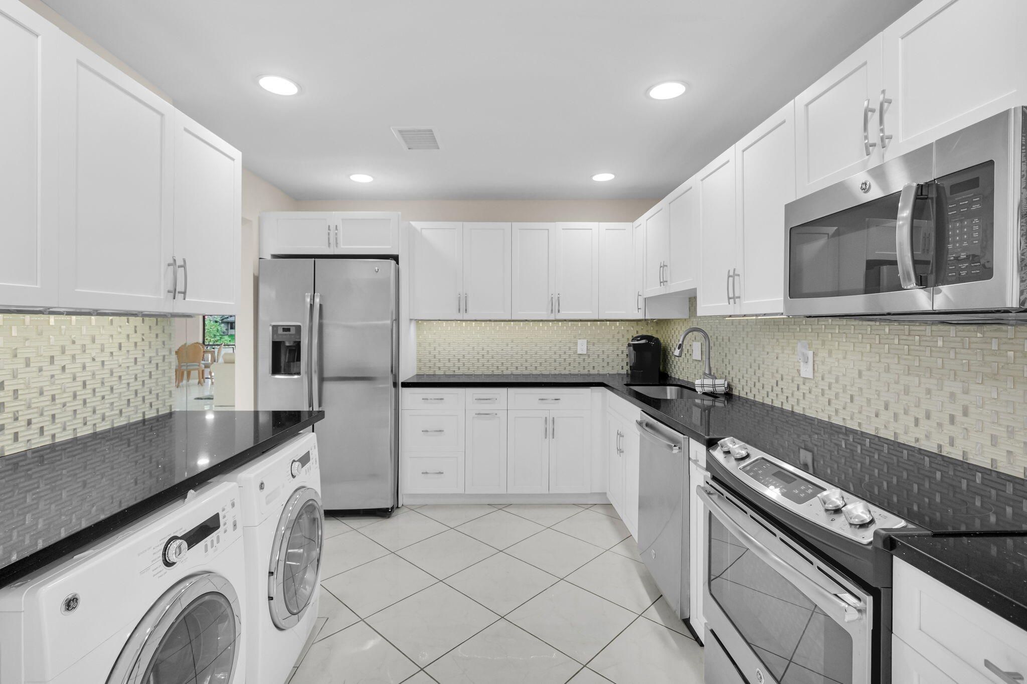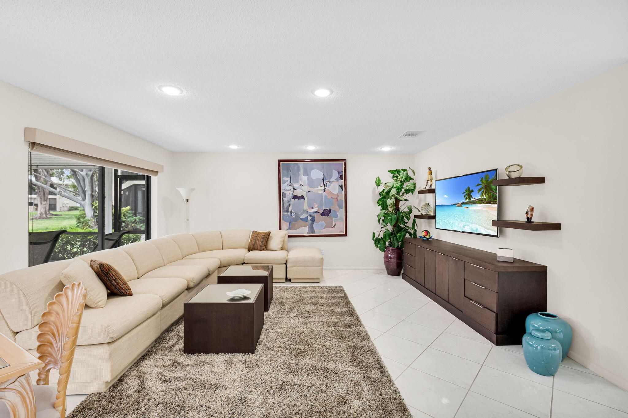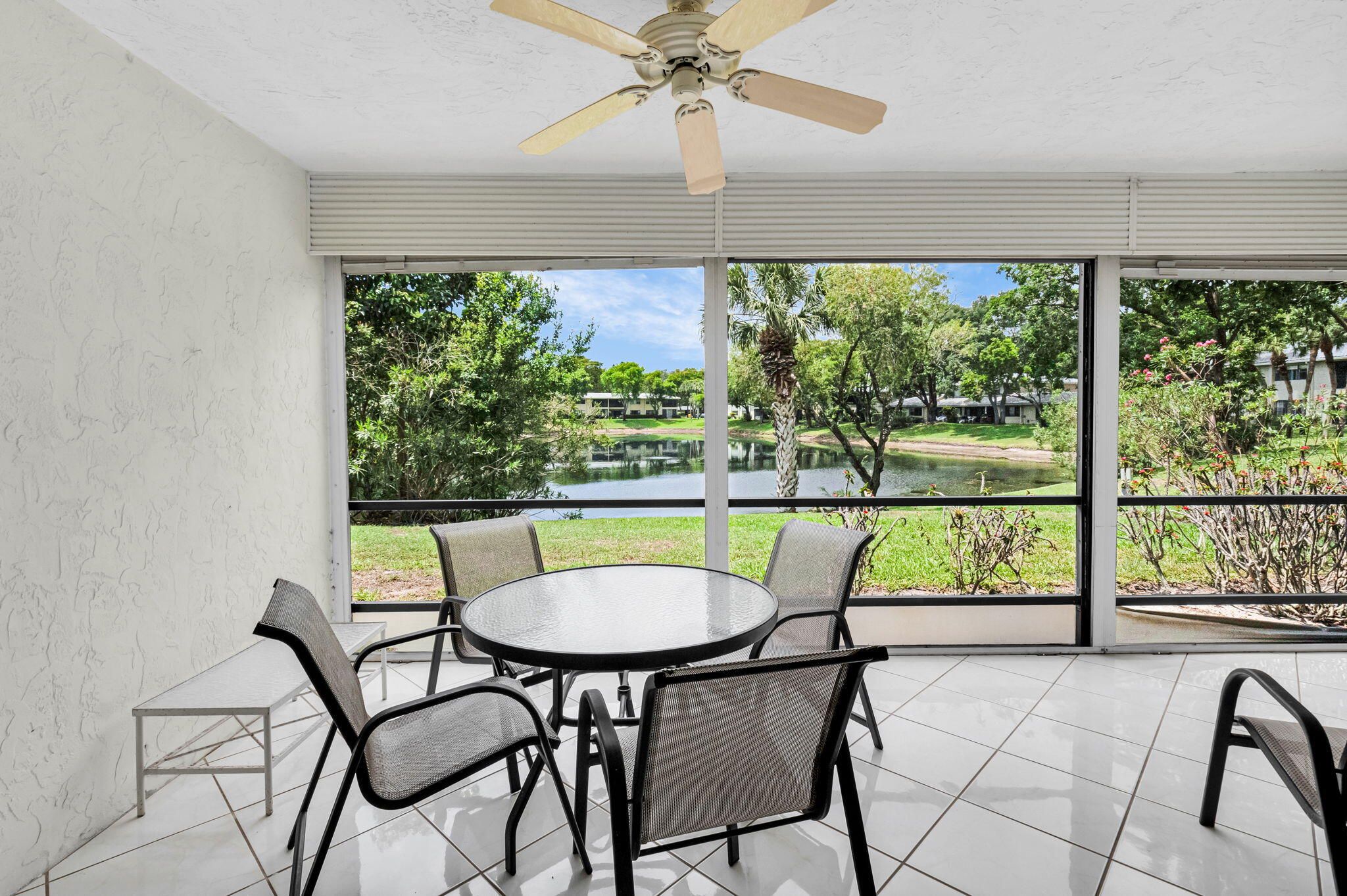 Enjoy serene water views from this light and bright first-floor condo, perfectly designed for comfortable living and effortless style. The updated white shaker kitchen features sleek stainless steel appliances and offers both functionality and charm. Neutral ceramic tile, elegantly set on an angle, flows throughout the main living areas, creating a modern and cohesive feel. An inviting bonus room, filled with natural light, offers the flexibility to be used as a third bedroom, home office, or cozy den. A perfect blend of comfort, style, and peaceful waterfront living awaits. Hunters Run is a mandatory buy-in and yearly membership, amenities-filled community, offering 3 championship 18-hole golf courses, tennis & pickle ball courts, 6 dining venues, pools, a fitness center, spa & salon, golf shop, entertainment & activities. Just minutes to vibrant downtown Delray and the BEACH! Come to Hunters run the only thing missing is you!