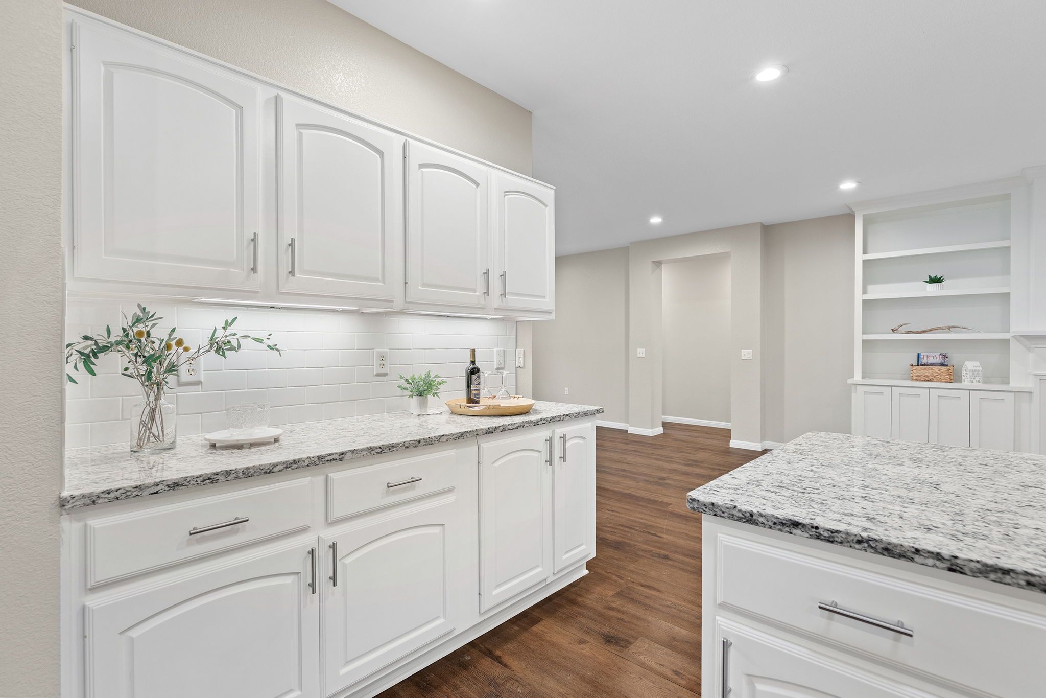 - Breakfast Bar, Bookcases, Built-in Features, Separate/Formal Dining Room, Double Vanity, Eat-in Kitchen, Granite Counters, High Ceilings, Kitchen Island, Multiple Dining Areas, Main Level Primary, NoInteriorSteps, Open Floorplan, Pantry, Recessed Lighting, Smart Thermostat, Walk-In Closet(s)