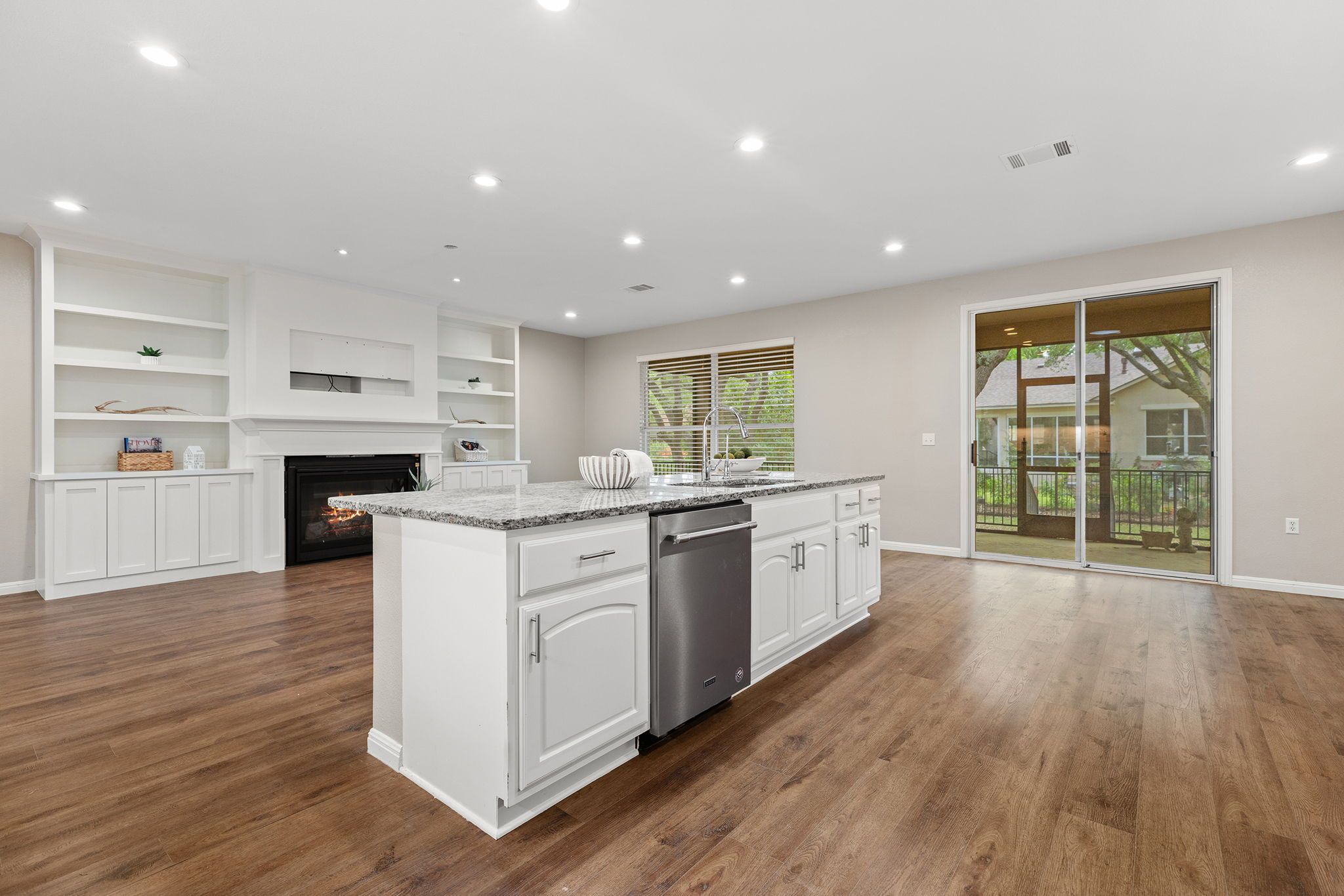 Enjoy the Sun City lifestyle and activities while still close to major roadways and easy access to surrounding cities, shopping, and restaurants. 15 minutes from Liberty Hill and Georgetown sports fields. This 3 bedroom, 2 full bath home has an open floor plan with flex spaces for multiple uses. The large screen-in back porch is the perfect place to enjoy morning coffee, or evening sunsets. Enjoy this large kitchen, center island, multiple dining areas, all open to the living room with built-in cabinets and shelving surrounding the gas log fireplace. Mature trees and landscaping, with a fenced in back yard.