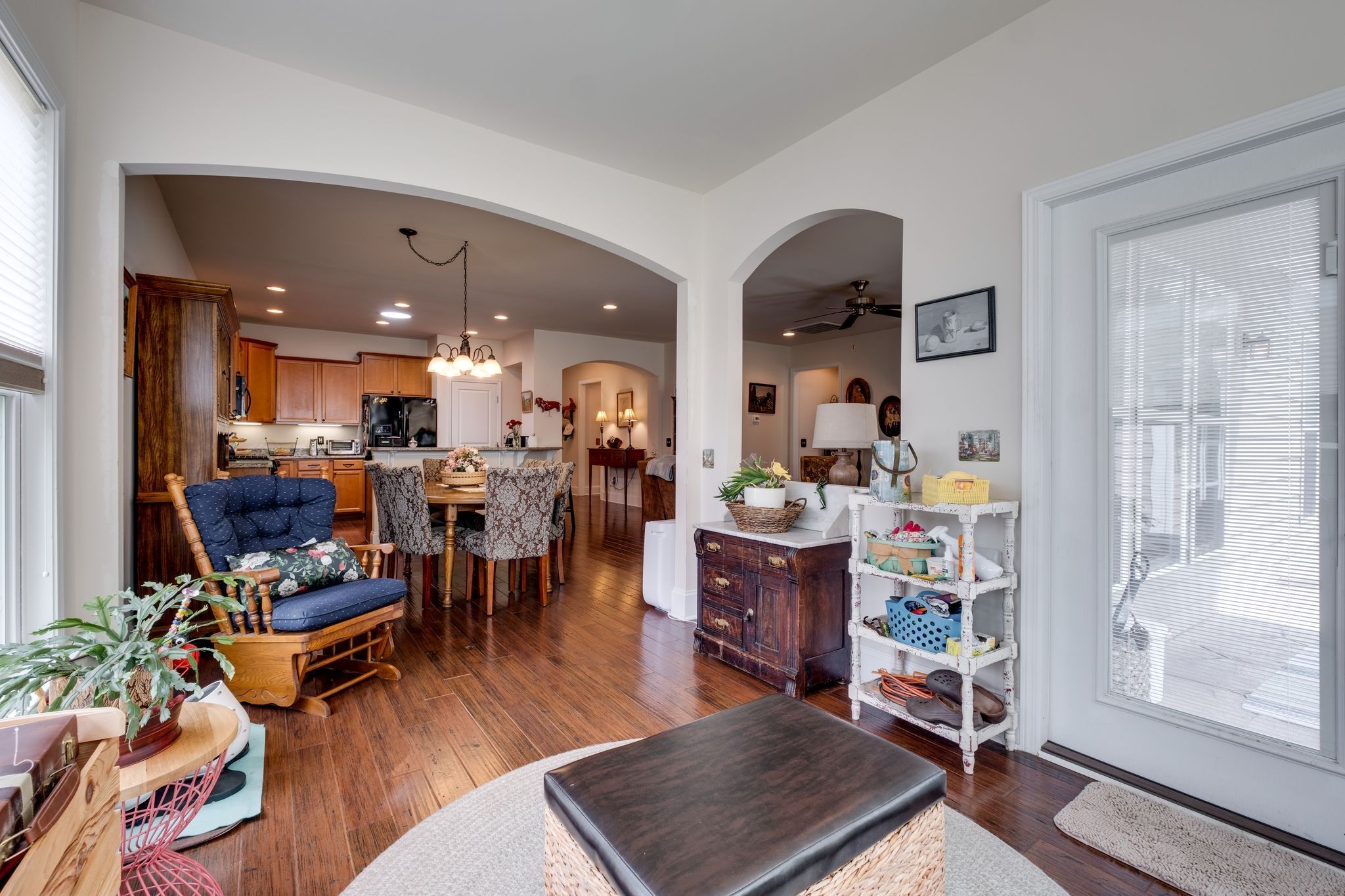 Gated Resort style living in Del Webb Lake Providence 55+ active community with 80 clubs to keep one active. Beautiful Copper Ridge floor plan, 2bd, 2 ba + office, extended 4 ft garage, sunroom, beautiful hardwood, grey granite countertop, under cabinet lighting, new microwave. Walk in master closet, blackout curtains in the bedrooms, tile master shower. Front door storm/screen door. Stamped concrete back patio 30 x10 across the back side of the house, fenced yard 39x11, for your pet. Back yard included mature crepe myrtles as well as an electric mower. Washer and dryer included. Attic storage above the garage with pull down steps.