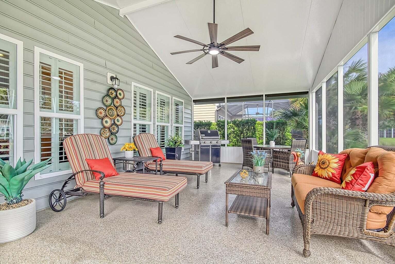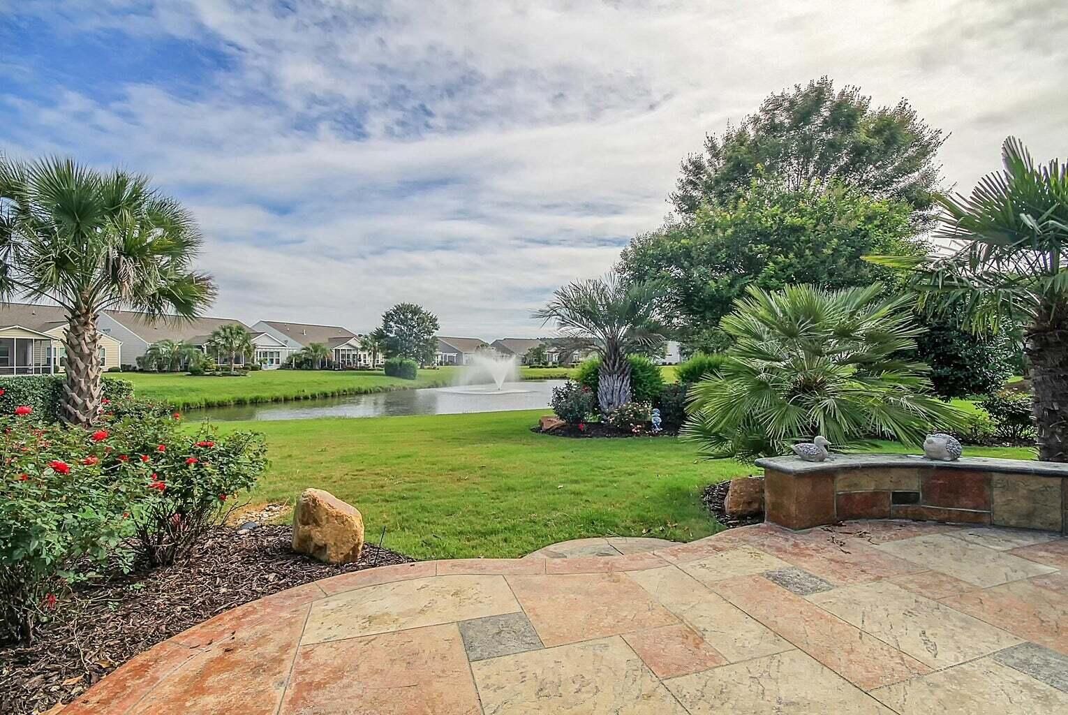 Experience the pinnacle of low-maintenance luxury in this stunning lakefront retreat situated on a rare, oversized .22-acre lot within the prestigious, award-winning Del Webb Cane Bay community. This meticulously maintained 2,234 sq. ft. residence offers an open and airy layout featuring two bedrooms, a dedicated home office, and sophisticated finishes throughout, including rich hardwood floors and a cozy fireplace in the great room. The gourmet kitchen is a chef's delight, showcasing granite countertops, a separate dining room, and a striking travertine woven tile backsplash. Retreat to the owner's suite to find a custom ''California'' walk-in closet, or enjoy the ultimate in outdoor living on the expansive screened-in lanai and custom stamped-and-stained concrete patio.Thoughtful upgrades abound, from the ceiling-height laundry cabinetry and pull-down attic storage to the charming covered front porch and permanent decorative concrete landscape borders. Best of all, you can enjoy the expansive yard and world-class resort amenities of this vibrant 55+ community without ever picking up a mower. Discover the effortless, active lifestyle you've earned in a home that truly has it all. Seller will happily sell fully furnished should the buyer prefer that.