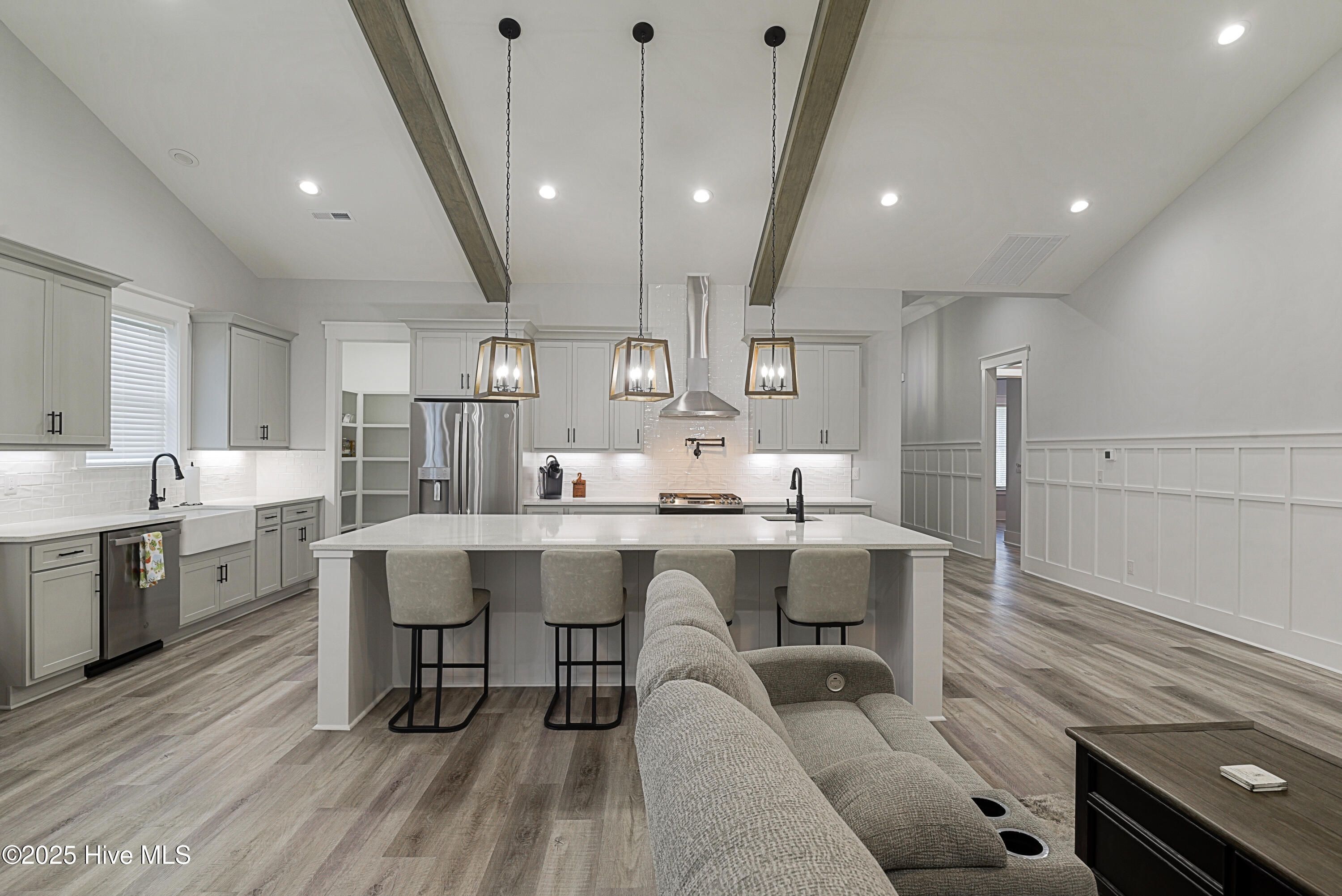 Step into this nearly new home where thoughtful design and luxurious finishes set the tone. From the moment you enter, details like a trey ceiling and wainscotting in the foyer welcome you into an open, light-filled floorplan perfect for everyday living and entertaining. The heart of the home is the vaulted great room, enhanced with striking faux beams and a stone gas fireplace. Oversized sliding glass doors extend the living space onto a screened patio, where you can relax while enjoying peaceful views of the wooded backdrop. The chef's kitchen is a showstopper with a large island with seating, a built-in microwave drawer, prep sink, quartz counters, tiled backsplash, and a farmhouse sink. A gas range with stainless steel hood and a pot filler make cooking effortless, while the walk-in pantry with custom shelving keeps everything organized. A formal dining area just off the kitchen provides the perfect space for gatherings. The main-level primary suite is a private retreat, featuring a trey ceiling, a custom walk-in closet, and a spa-like en-suite bath with a walk-in tiled shower and double-sink vanity. Guest bedrooms enjoy the same high-end finishes, with luxury vinyl plank flooring in the living areas and bedrooms, and durable tile in the baths. Upstairs, the versatile bonus room--with its own full bathroom, walk-in closet, and mini-split AC unit--makes an ideal guest suite, office, or media room. Additional highlights include: an irrigation system, laundry room with cabinets and utility sink, epoxy-coated garage floor, tankless water heater, and hand-selected fixtures and finishes throughout. Homeowners in the gated-golf community of Brunswick Plantation enjoy an active social committee and resort style amenities such as: an indoor pool, hot tub, fitness center, several outdoor pools, along with tennis and pickleball courts. Close to the restaurants and shopping in Calabash, and still only minutes to Sunset Beach and close to the attractions of Myrtle Beach.