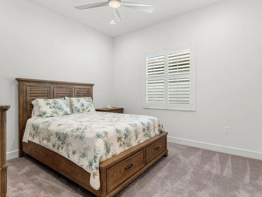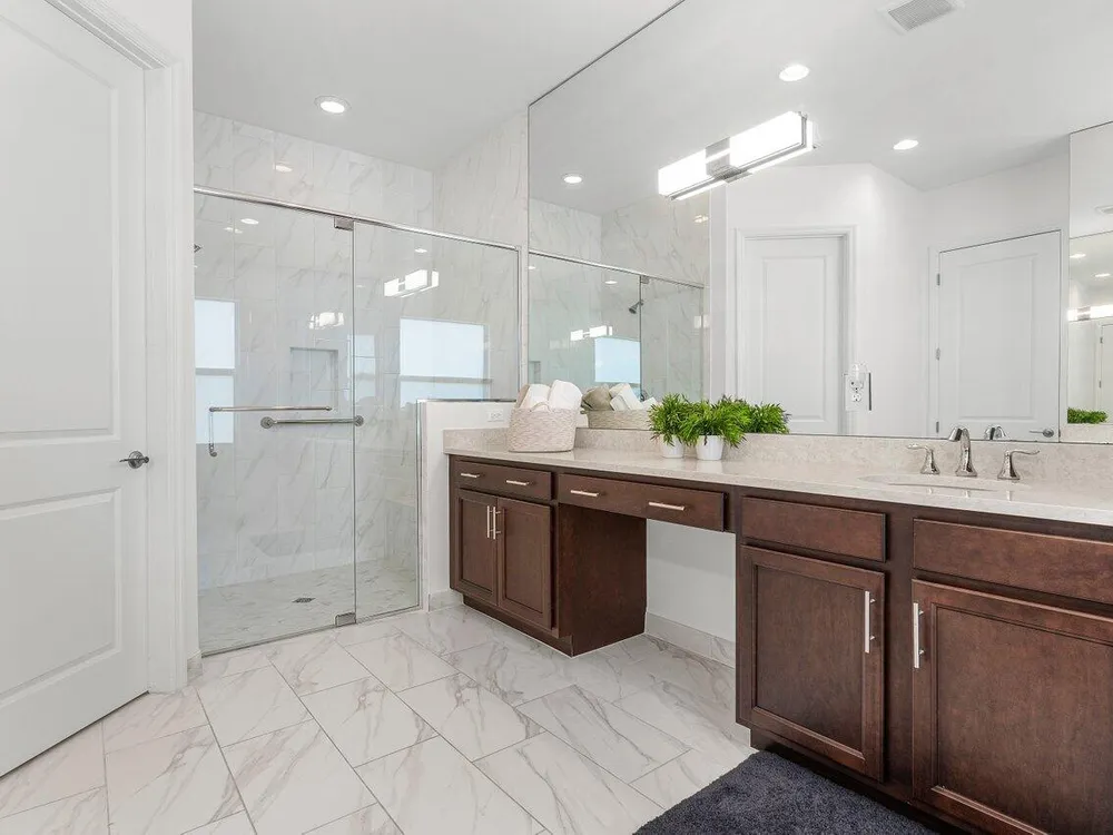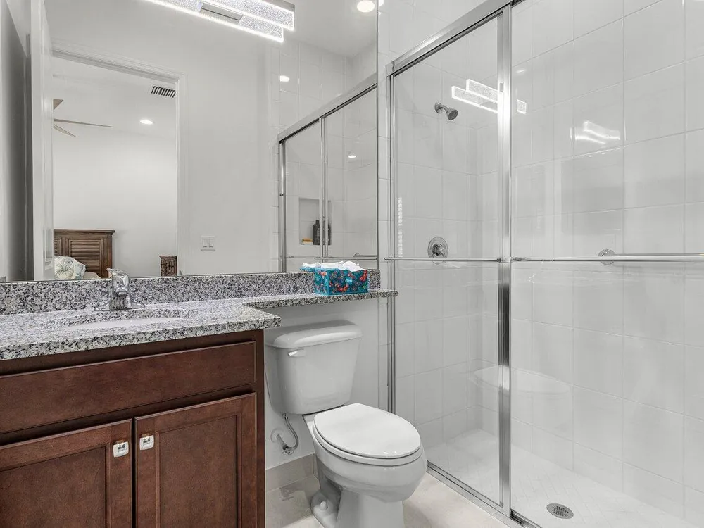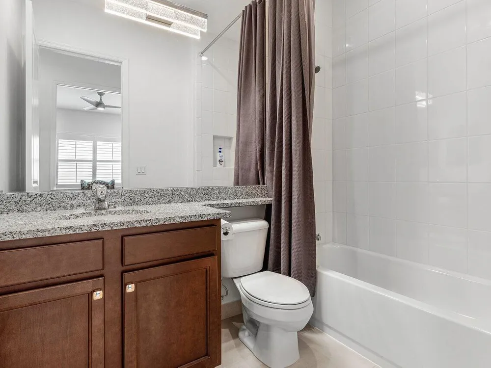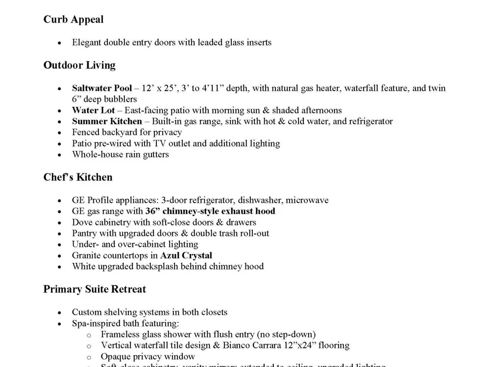 details such as ceiling fans and custom lighting. The chef's kitchen is the centerpiece of the home, showcasing GE Profile appliances including a gas range with a 36-inch chimney hood, a three-door refrigerator, and a dishwasher. Soft-close Dove colored cabinetry upgraded pantry doors with double trash roll-out, Azul Crystal granite countertops, and under- and over-cabinet lighting combine to create a refined yet functional space.The primary suite offers a private retreat with custom shelving systems in both closets and a spa-inspired bathroom with a frameless walk-in shower, a vertical waterfall tile design, Bianco Carrara flooring, an opaque privacy window, extended vanity mirrors, and soft-close cabinetry. Guests will appreciate the two additional bathrooms--one on-suite featuring