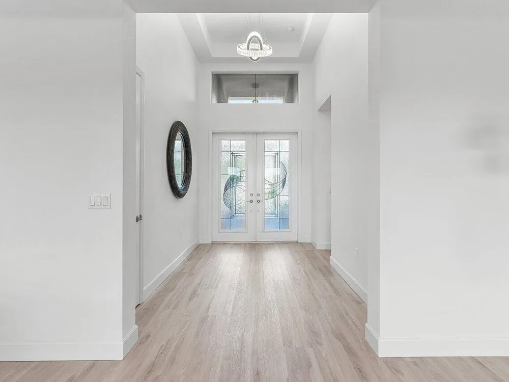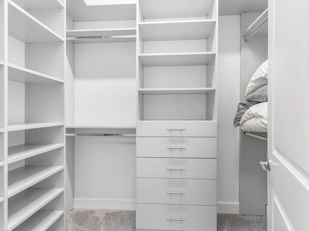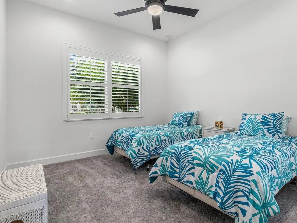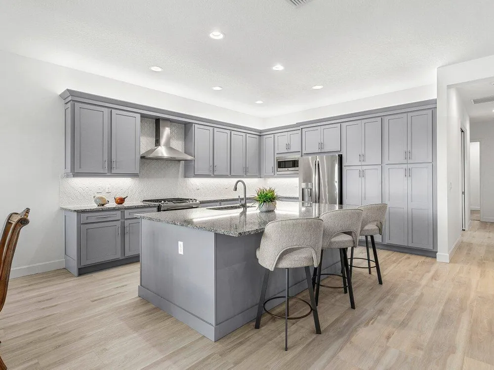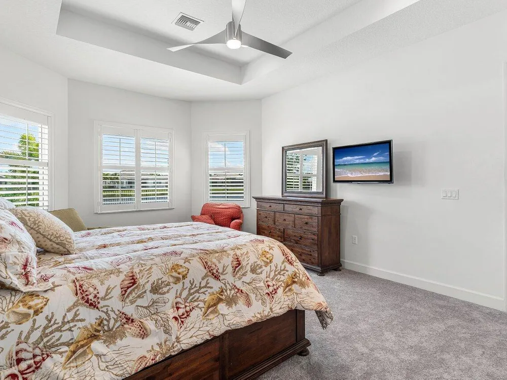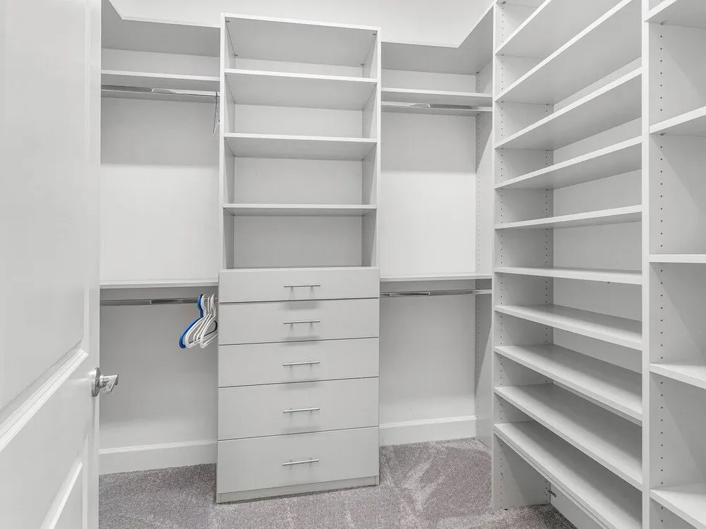 details such as ceiling fans and custom lighting. The chef's kitchen is the centerpiece of the home, showcasing GE Profile appliances including a gas range with a 36-inch chimney hood, a three-door refrigerator, and a dishwasher. Soft-close Dove colored cabinetry upgraded pantry doors with double trash roll-out, Azul Crystal granite countertops, and under- and over-cabinet lighting combine to create a refined yet functional space.The primary suite offers a private retreat with custom shelving systems in both closets and a spa-inspired bathroom with a frameless walk-in shower, a vertical waterfall tile design, Bianco Carrara flooring, an opaque privacy window, extended vanity mirrors, and soft-close cabinetry. Guests will appreciate the two additional bathrooms--one on-suite featuring