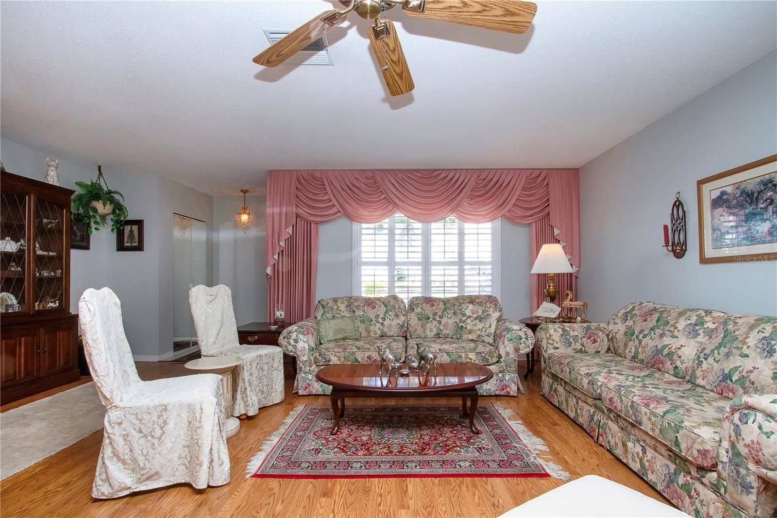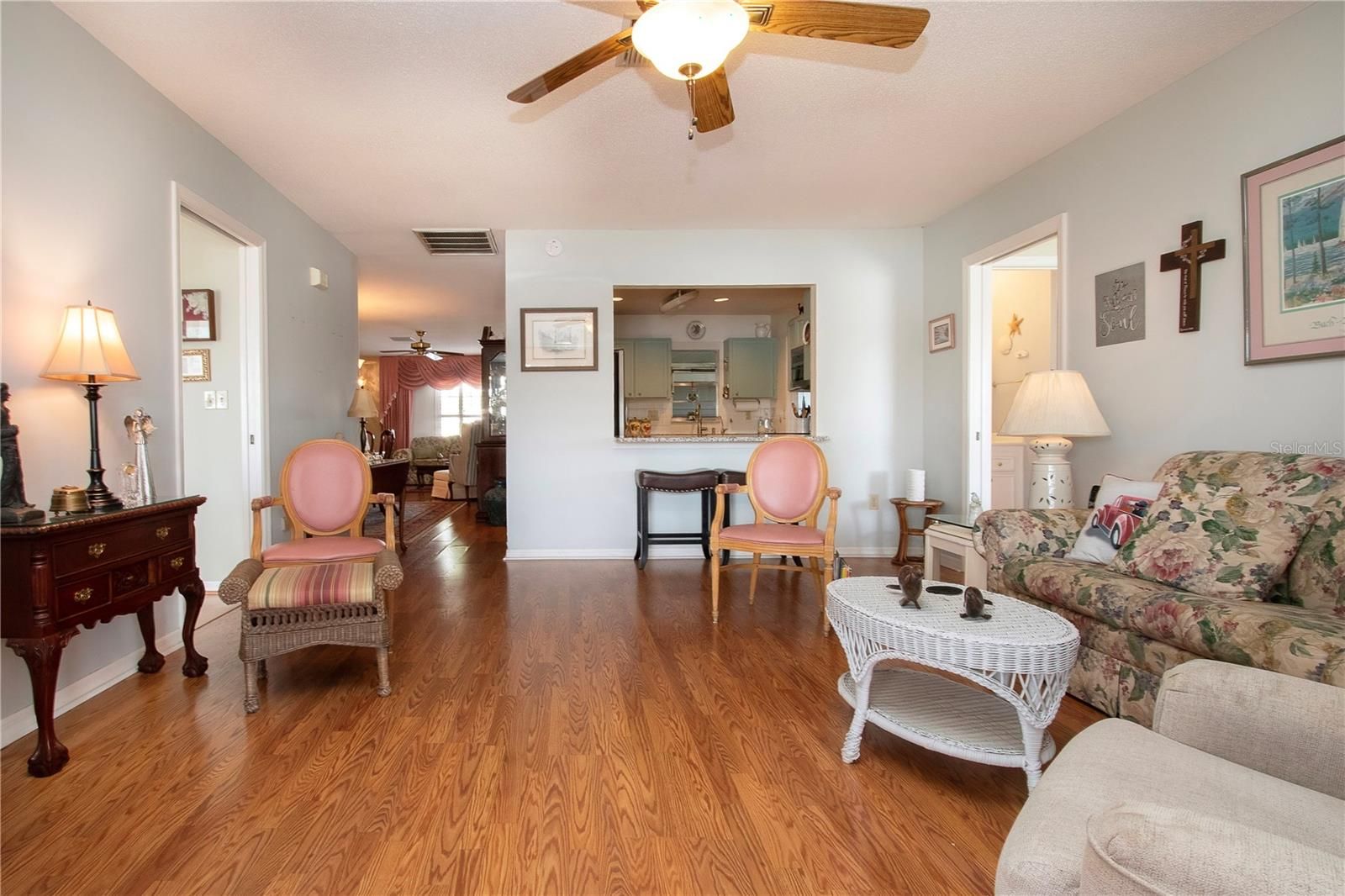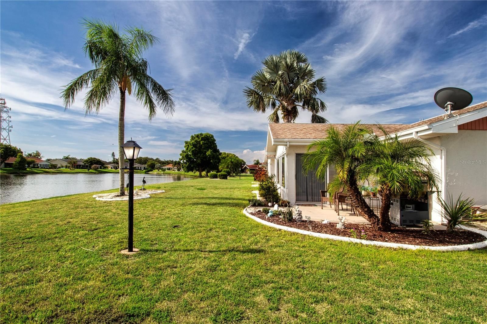 This home is a lovely twin tree model not only with a beautiful water view, but the assumption of a VA loan at 2.75% may also be possible!! The home features a spacious living room/dining room combo with plantation shutters, neutral decor and brand new laminate flooring! The attractive, efficiently designed kitchen presents nice countertops, newer appliances, recessed lighting, new flooring, a breakfast bar and plenty of cabinet space! The kitchen opens to a family room which overlooks the water and provides access to a large air conditioned Florida room with vaulted ceiling and an additional AC unit. This room also has brand new laminate flooring. From here you can relax and enjoy the water view and watch all of the Florida wildlife! There is also a very nicely landscaped outside patio where you can relax, use your grill and/or entertain guests. The home features a split floor plan with two master suites. The primary master is very private and has its own en suite bath with shower, double sinks and a linen closet. The second suite is very cozy and has an adjacent bath complete with a tub and shower and also has a large linen closet. Add to this a full two car garage and hurricane shutters for all of the windows, and a reverse osmosis system. View this home today and make it your own piece of paradise.