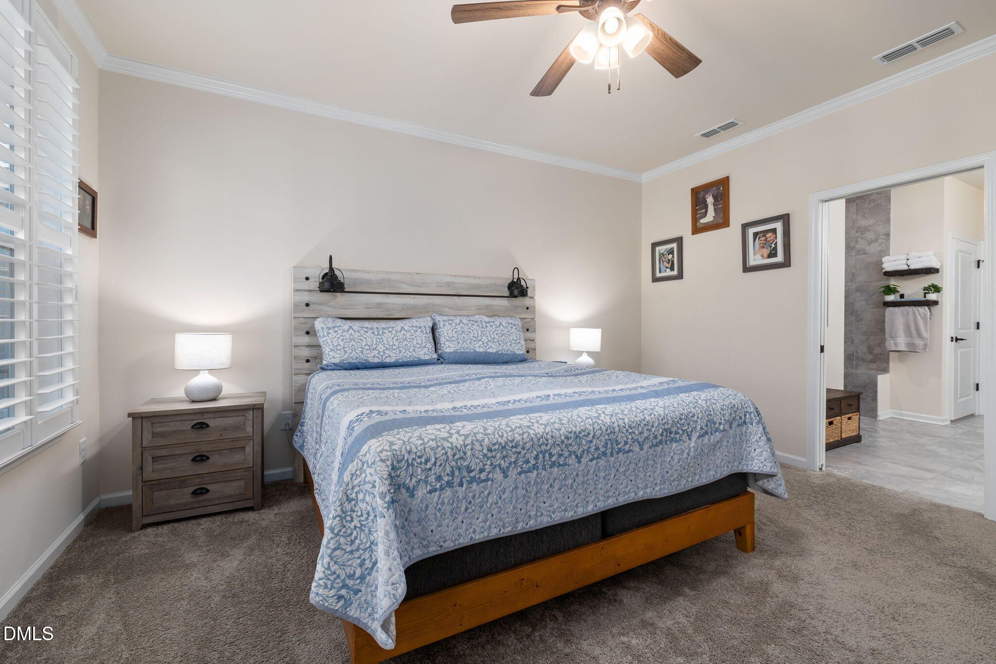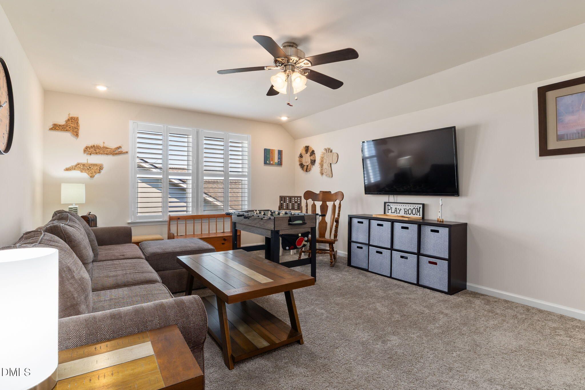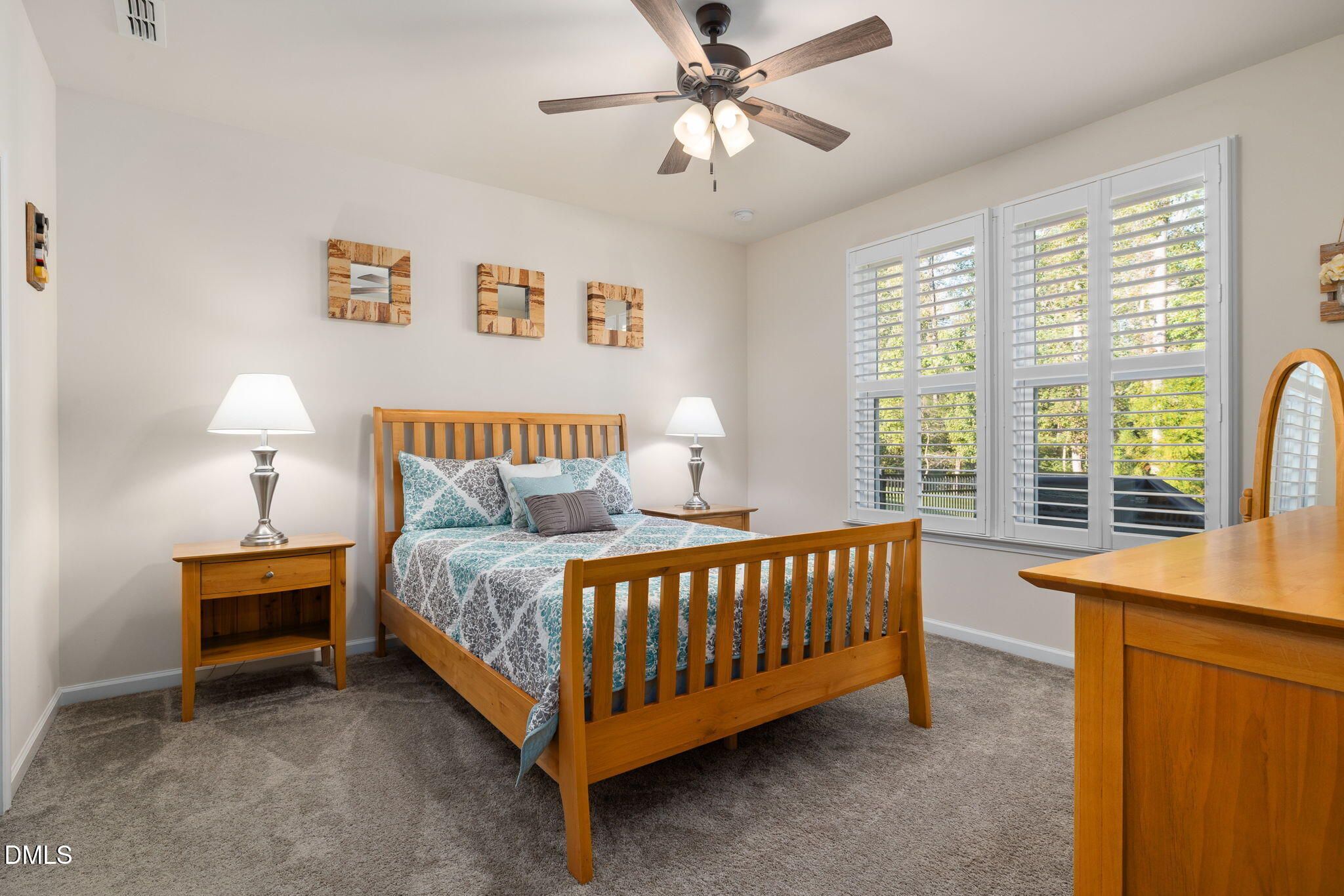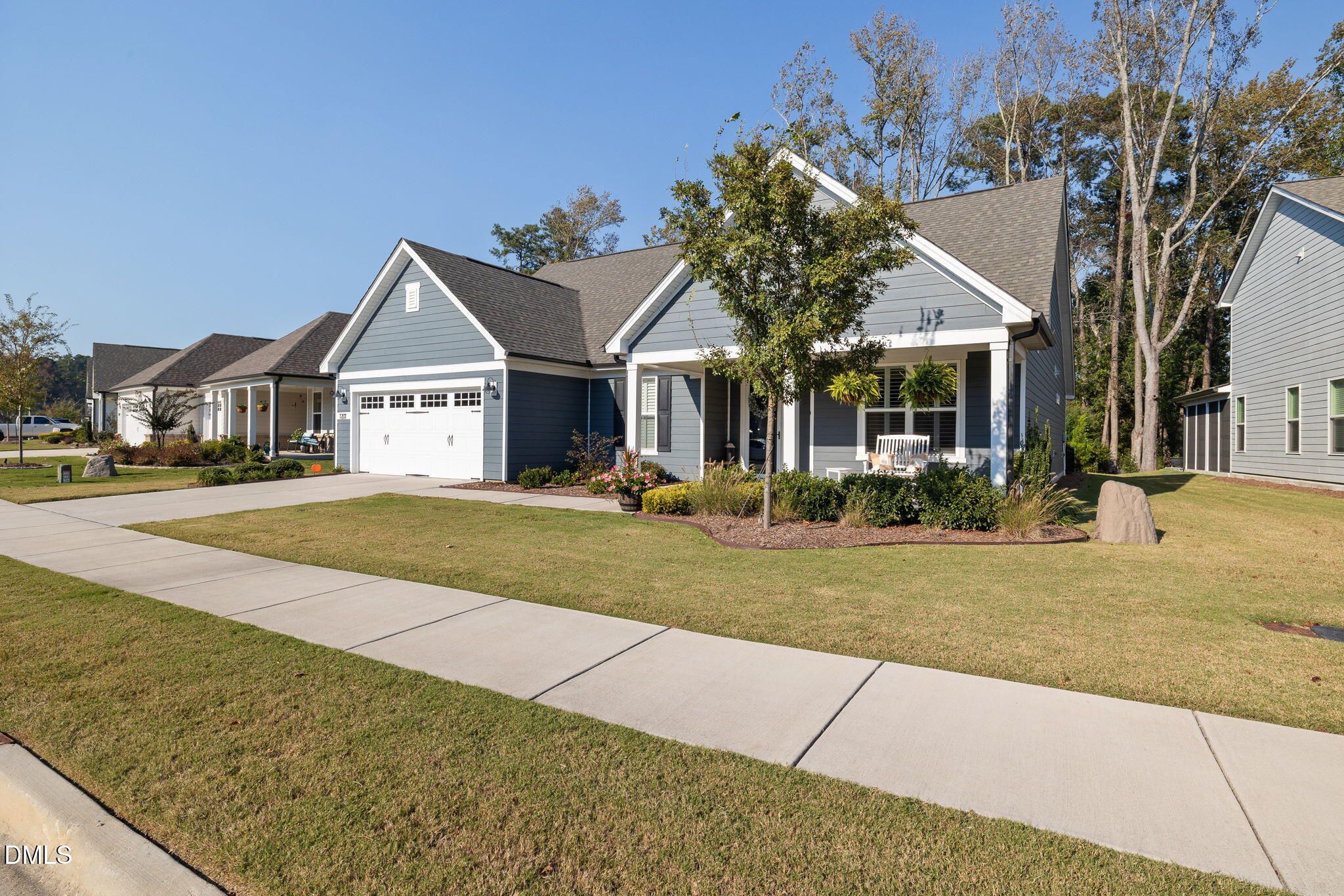Welcome to this meticulously maintained and beautifully upgraded home located in the sought-after Carolina Gardens by Del Webb. Designed for comfort, style, and functionality, this residence offers an exceptional blend of open-concept living and private retreat spaces. The first floor features two spacious bedrooms, 2.5 baths, and a dedicated home office, ideal for remote work or hobbies. The gourmet kitchen is a showstopper with an extra-long island seating six, premium appliances, and elegant finishes—perfect for entertaining or casual dining. Enjoy gatherings in the bright and open living area highlighted by massive glass sliding doors that lead to the EZBreeze-covered porch, seamlessly blending indoor and outdoor living. Upstairs, you'll find a versatile loft, third bedroom, and full bath, offering the perfect space for guests or a second living area. The fenced backyard provides privacy and serenity, backing to mature trees—no homes behind you! The EZBreeze screened porch invites you to relax year-round, while the irrigation system keeps your landscaping lush and green. Additional highlights include: Plantation shutters throughout California Closets in the laundry room Framed bathroom mirrors 8-foot front door with storm door Large storage area in garage (approximately half-garage size, designed to look like part of the home exterior) Fenced yard with privacy panels This home truly shines with attention to detail and thoughtful upgrades at every turn.