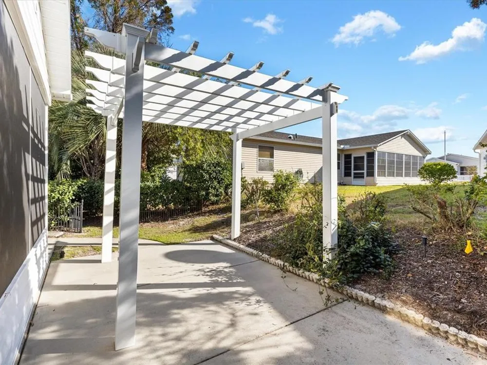 One or more photo(s) has been virtually staged. • NO BOND • 2021 ROOF & HVAC • 2020 TANKLESS GAS WATER HEATER • FLORIDA ROOM • ENCLOSED LANAI Located on a desirable corner lot in the sought-after Village of Santiago, this beautifully maintained 2-bedroom, 2-bathroom Stetson model offers updated systems and a thoughtfully designed layout. A charming covered front porch with a decorative leaded-glass front door welcomes you into an open, split floorplan featuring tile flooring throughout the living, dining, and kitchen areas. The kitchen boasts brand new stainless steel appliances and a convenient breakfast bar, perfect for casual meals and entertaining. Enjoy year-round comfort in the added Florida Room with new carpet, or relax in the enclosed lanai that opens to a private outdoor patio with a pergola, ideal for outdoor dining or lounging. The primary suite features new carpet, a walk-in closet, and a private bath with a tub-shower combo. The guest bedroom includes a Murphy bed, new carpet, and a walk-in closet, while the guest bathroom is equipped with a stand-up shower. An indoor laundry room with an extra refrigerator adds convenience, and the 2-car garage includes an insulated garage door for comfort and efficiency. Enjoy proximity to Spanish Springs (~0.6 mi), Lake Sumter Landing, Mallory Hill Golf Course, and nearby recreation centers with golf cart accessibility throughout The Villages.