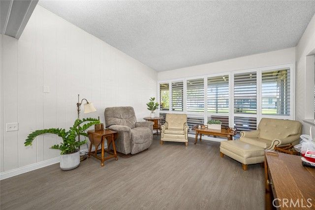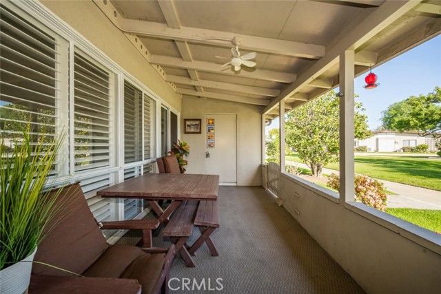 Tucked into a wide, park-like greenbelt, 196H in Mutual 8 is a peaceful retreat offering outstanding privacy. The home has been partially expanded while still maintaining a generously sized patio with a storage closet measuring approximately 5' x 8'. Inside, a formal dining area provides ample wall space for larger furniture or decorative accents. Expansive windows line the living area, showcasing calming greenbelt views and are enhanced with classic plantation shutters. Laminate flooring runs seamlessly throughout, leading into a well-cared-for kitchen illuminated by a skylight. The bathroom features a seated shower and updated fixtures. Additional highlights include central HVAC, double-pane windows throughout, a sliding door off the primary bedroom, and the rare bonus of a private sauna. SENIOR COMMUNITY-OFFERS THE FOLLOWING AMENITIES: 9 Hole Golf Course, Swimming Pool, Jacuzzi, Gym, Table Tennis, Shuffle Board, Billiards, Pickle Ball, and Bocce Ball courts. Amphitheater, 6 Clubhouses featuring: Art Room, Sewing, Crafts, Wood Shops, Lapidary, Pool Tables, Over 200 Clubs, LWSB is a Security-Guard-Gated Community. Also Library, Friends of Library Bookstore, Credit Union, Health Care Center, Pharmacy and Post Office (CARPORT 96, SPACE 20).