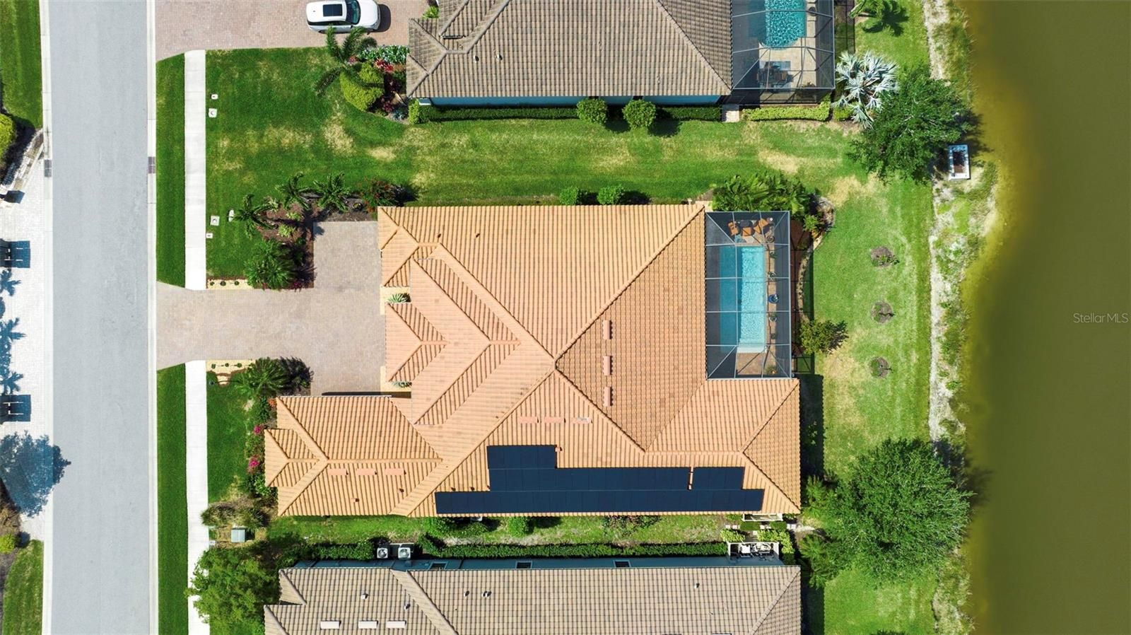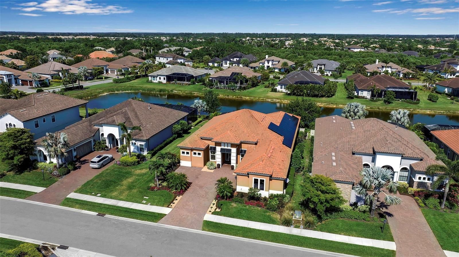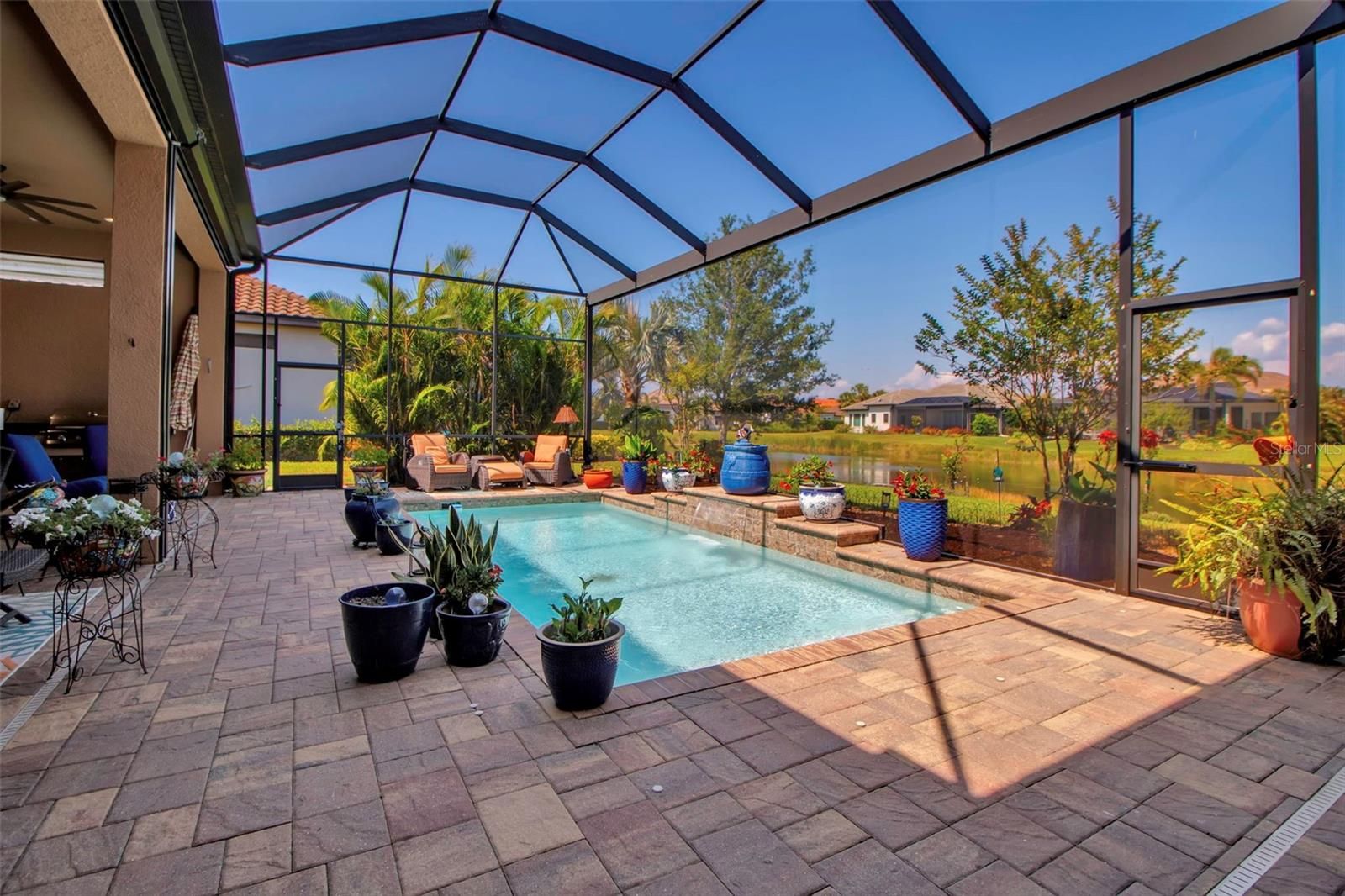 This beautiful single-story home features 3 bedrooms, 3.5 baths, an office, and a bonus room, and pool overlooking the lake, and offering luxurious living at its finest. The bright, open floor plan is enhanced by soaring ceilings, creating an easy flow from room to room. The sellers have thoughtfully upgraded this exceptional space with trayed ceilings, crown molding, plantation shutters, custom drapery, and upgraded ceiling fans. A stunning stone wall with an electric fireplace and warm color palette creates an inviting atmosphere. Outside, experience the best of Florida living with serene lake views and panoramic screens for uninterrupted enjoyment of the natural surroundings. Multiple areas invite relaxation and entertainment, including a lanai with an outdoor kitchen, paver brick decking, and pool. Enjoy a maintenance-free lifestyle with groundskeeping provided by the association. For those seeking to complement their lifestyle, the clubhouse offers a fitness center, yoga and massage rooms, locker rooms, and a game room, as well as tennis, pickleball, and bocce ball courts, and even two dog parks. Legacy Estates is a gated community with resort-style amenities, including the Bahama Bar Restaurant next to a beach-entry pool, heated spa, and a kid-friendly splash and play area. The location provides easy access to the Legacy Trail and nature trails for walking and bicycling for the outdoor enthusiast. Conveniently located near A-rated schools, shopping and dining options abound, and a short drive will take you to some of the most beautiful beaches in the world!