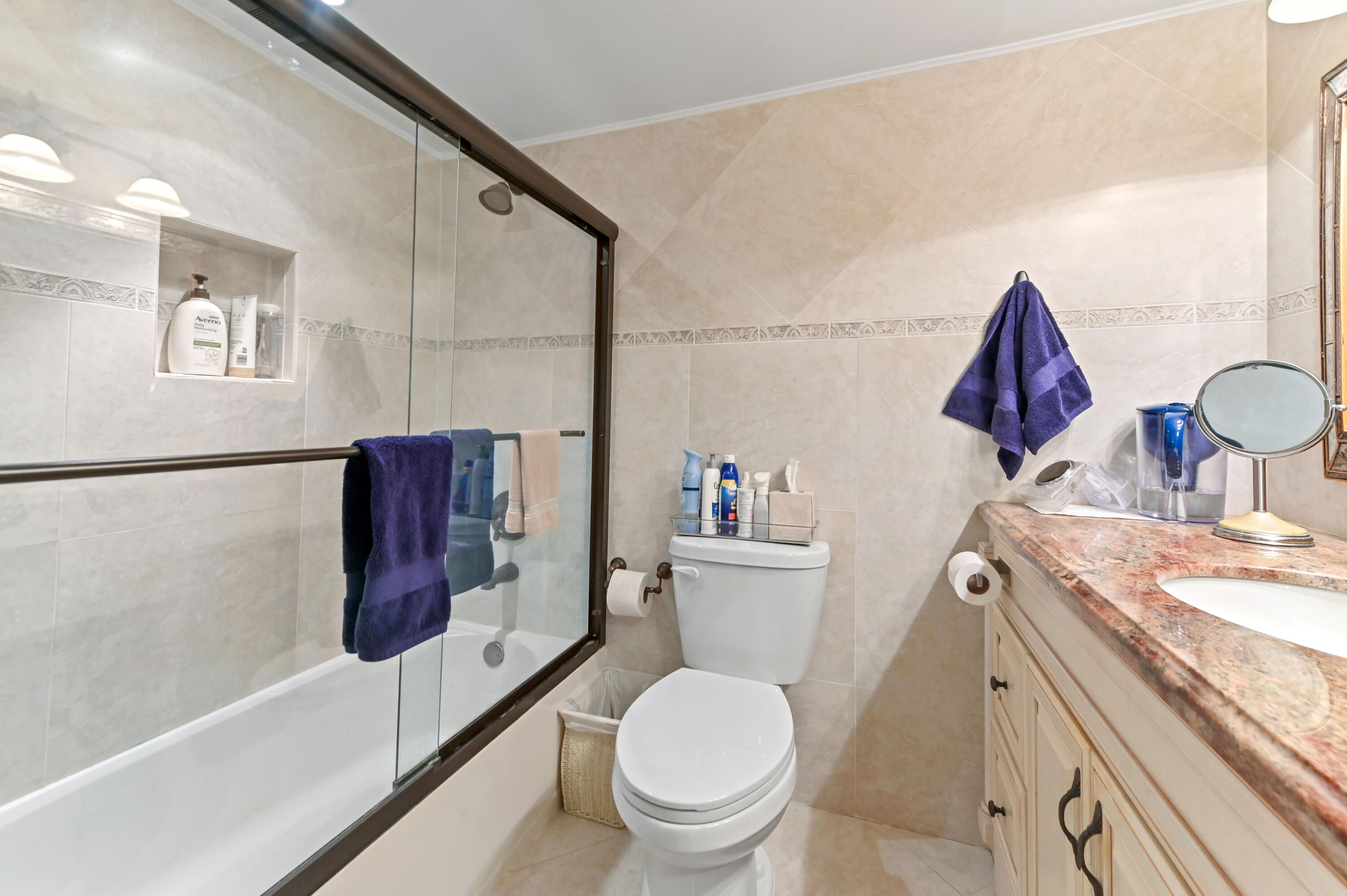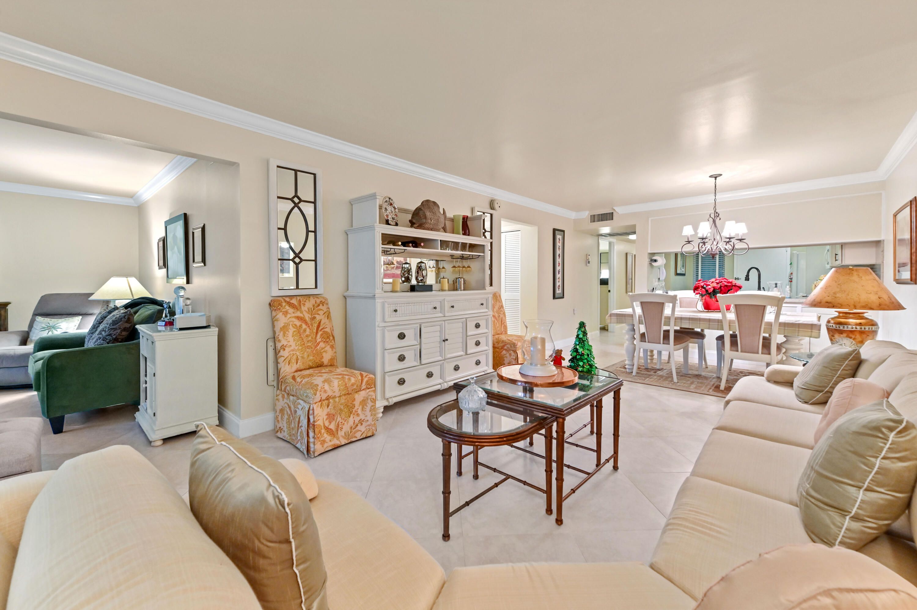 Experience spacious living in this beautiful 55+ condo, where a thoughtful layout offers far more than the standard condo experience. Beyond the welcoming foyer and pristine diagonal tile flooring, you'll discover a stunning kitchen featuring antique-white raised panel cabinetry, granite countertops, and a pass-through breakfast bar that connects effortlessly to the formal dining area. Unique to this unit is the abundance of living space; in addition to the expansive main living room with its elegant crown molding, there is a separate, cozy family room or den—perfect for a media center or home office—bathed in natural light from large windows. Retreat to the comfortable private quarters, including a serene primary suite that features ample closet space behind classic louvered doors and an ensuite bathroom. Step through the floor-to-ceiling sliding glass doors in the living room to your private screened balcony, where you can unwind while overlooking tranquil waterfront views and lush green grounds. Situated in a well-maintained building with easy access to parking and just moments from Coconut Creek's best shopping and dining, this move-in-ready home offers the perfect blend of luxury, comfort, and convenience.
