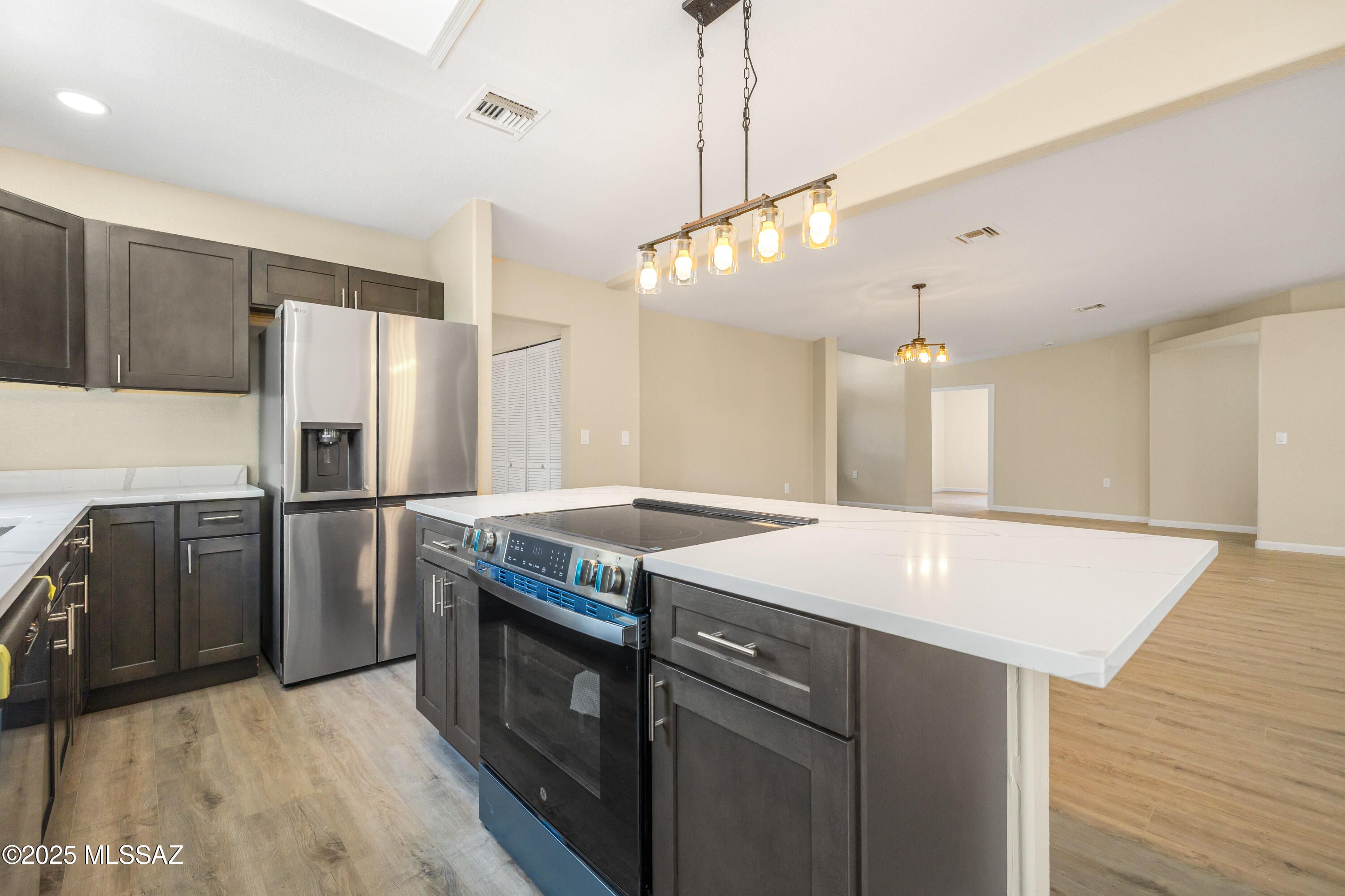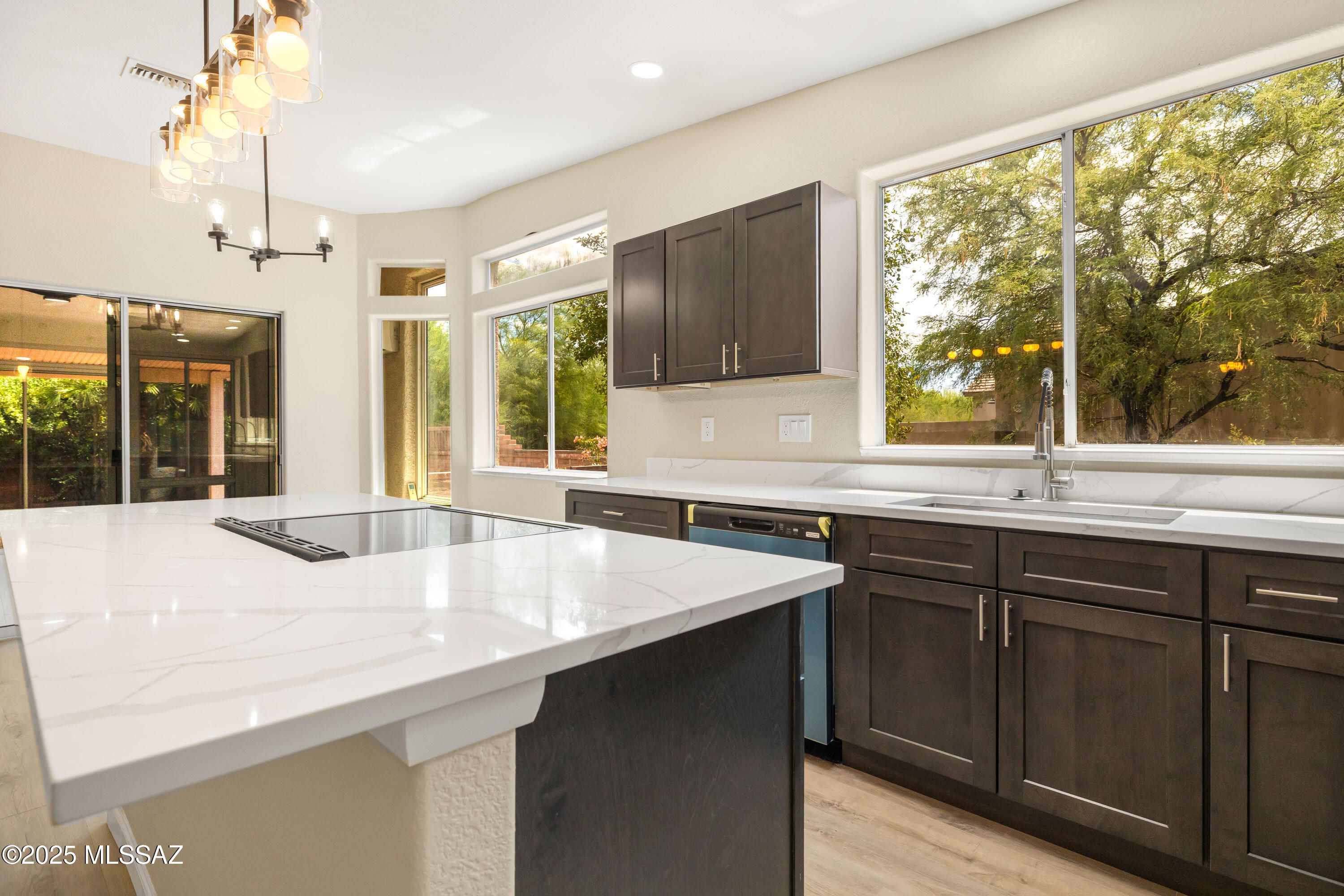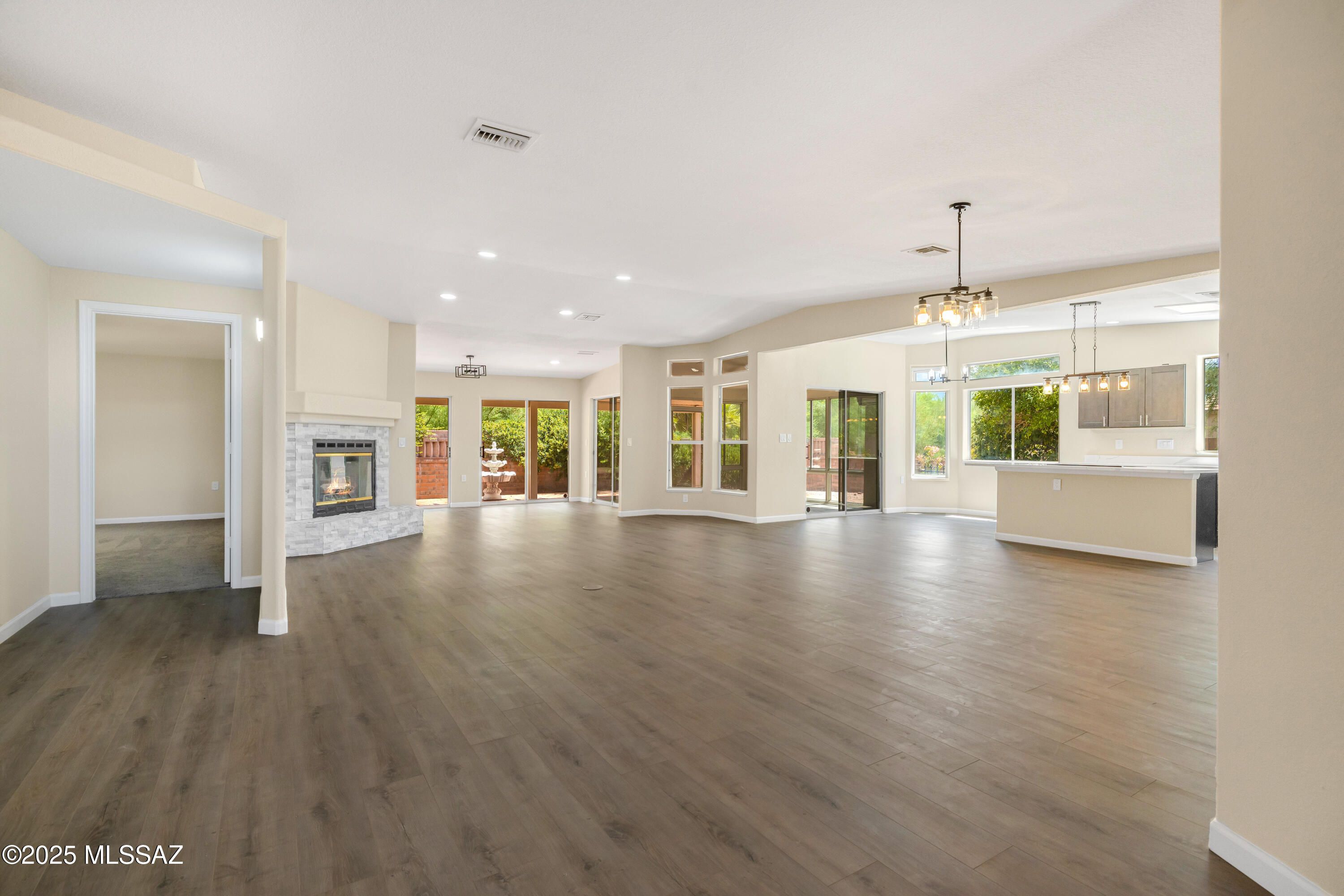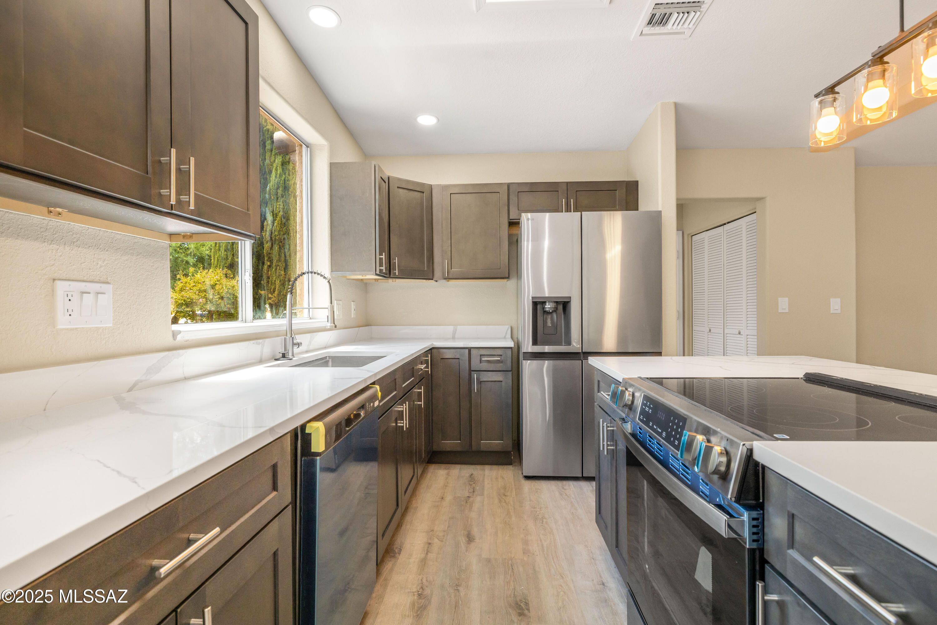 This better-than-new beauty nestled in the desired Country Club Vistas in a premium corner lot awaits you! With modern aesthetics, but keeping all the charm, and manicured landscaping this home is very welcoming. Upon entering the soaring high vaulted ceilings and natural light bathe the home. With many luxurious features such as luxury wood-like flooring, recessed lighting, premium fixtures and a soothing palette. The bright great room sets the tone for family gatherings, and the exposed granite fireplace provides beauty. The gorgeous kitchen featuring plenty of dark wood cabinetry, exquisite Calcutta quartz counters, new high end SS appliances, and a center island adorned w/ pendant light fixtures over the breakfast bar is a chefs dream. With a formal dining space thats ideal for family