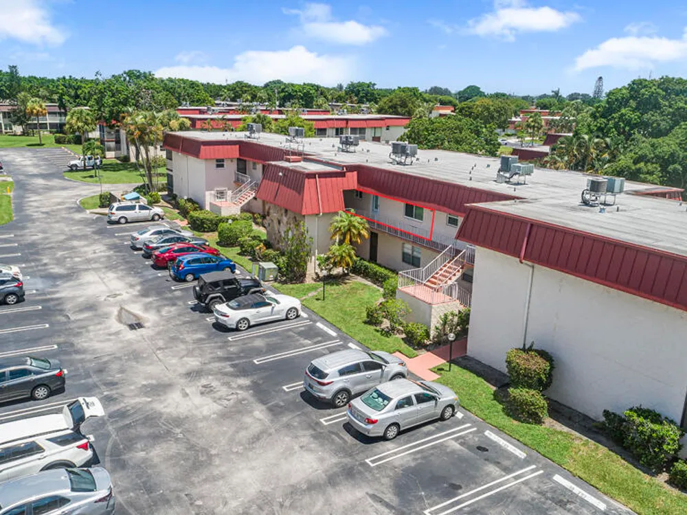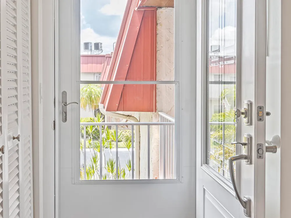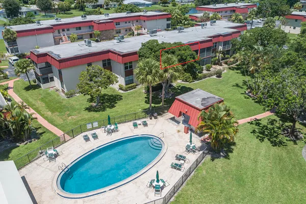 Fantastic 2 bedroom 2 bathroom condo in Greenway Village South. Super location with great view of one of the 5 pools and quiet greenspace. This unit has been upgraded for your safety and security with impact windows and doors. Both full baths have been updated. New roof in 2025 and assessment was paid by seller. Property is being sold furnished and turnkey for your full time or seasonal enjoyment. Small dogs and cats are allowed. Walk to parks, shopping and bus lines.