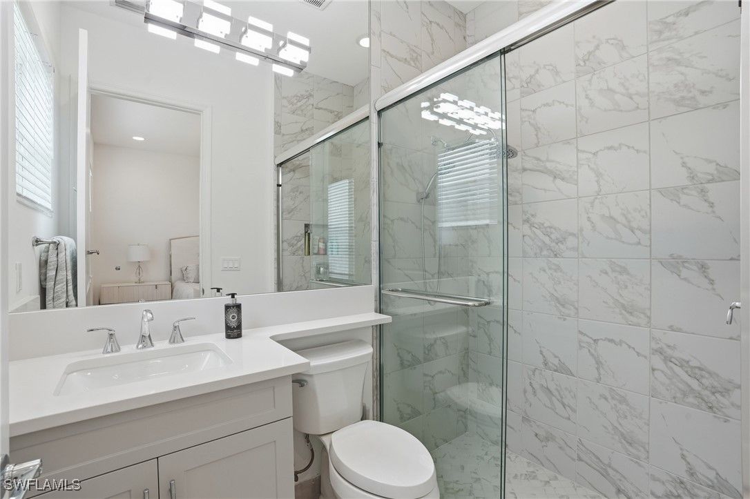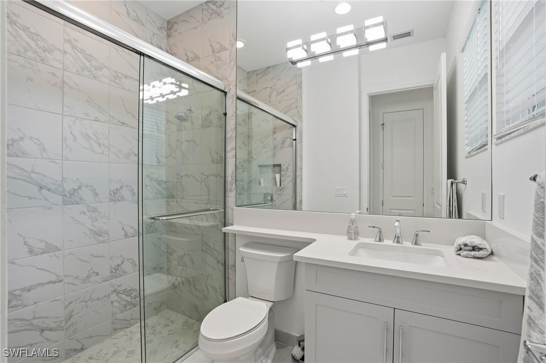 Welcome to this stunningly upgraded contemporary home perfectly situated on a peaceful pond in the prestigious Valencia Trails 55+ community. Designed for both comfort and sophistication, this Captiva Model by GL Homes offers 4 spacious bedrooms, 4.5 bathrooms, and overflows with high-end designer touches throughout. Step through the front doors into an inviting, light-filled interior that showcases an open-concept layout and seamless indoor-outdoor transitions. The gourmet kitchen is a true centerpiece, featuring sleek quartz countertops, a grand island, wine refrigerator, and premium appliances ideal for entertaining or enjoying everyday moments in style. Home chefs will love the option of either a natural gas or induction stovetop, offering flexibility for every cooking preference. Built as a natural gas powered home, this residence combines modern luxury with energy efficiency. The primary suite serves as a private sanctuary with two custom walk-in closets, an additional shoe closet, dual sinks, and an expansive walk-in shower. Each guest bedroom offers its own custom walk-in closet and en-suite bath, ensuring comfort and privacy. The home also features Robb & Stucky window treatments, upgraded mirrors, bespoke light fixtures, and custom designed barn doors, all enhancing its distinctive contemporary charm. Crown molding throughout adds a refined finishing touch. Step outside to an extended screened-in lanai overlooking the shimmering pond, your personal oasis for relaxation and entertainment. Enjoy the saltwater pool and an outdoor kitchen complete with a built-in grill, full-size ice maker, and two refrigerators, along with a gas fireplace that sets the perfect ambiance for evening gatherings. Automatic hurricane shutters provide added safety and convenience. The A/C-equipped two-car garage and a separate single-car garage offer ample storage and flexibility. Life at Valencia Trails offers an exceptional array of resort-style amenities designed to elevate every day. Just beyond your doorstep, a community-wide bike and walking path winds gracefully around picturesque lakes and peaceful ponds, perfect for morning strolls or leisurely rides through the beautifully landscaped scenery. The state of the art clubhouse features a fitness center, restaurant, and poolside bar, complemented by multiple club pools, including a resistance pool. Embrace an active lifestyle with tennis, pickleball, and bocce courts, or unwind at the full-service spa. Additional amenities include dog parks for large and small breeds, cooking classes, a billiards and card room, and even a theater. Located just 3 miles from Founder’s Square, where you’ll find an abundance of dining and shopping options, and less than 15 miles from the beach, this home provides the perfect blend of tranquility, luxury, and convenience. Welcome home to Valencia Trails, where every day feels like a vacation.