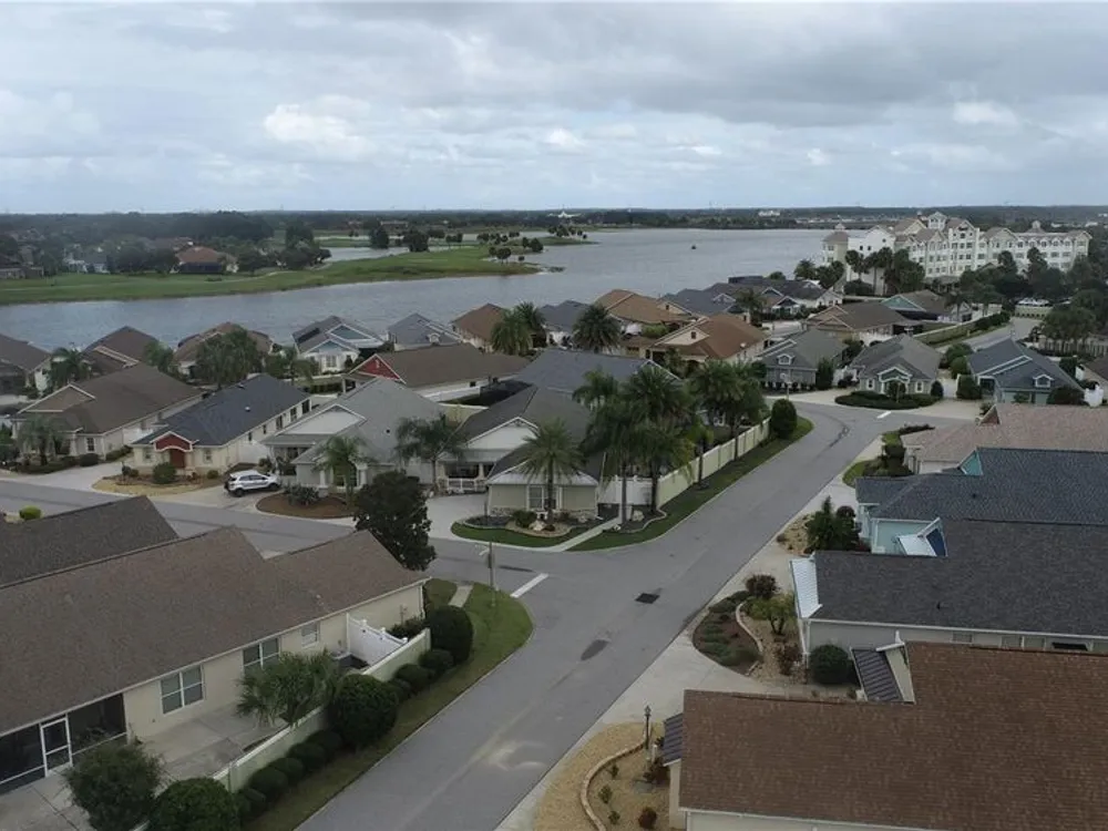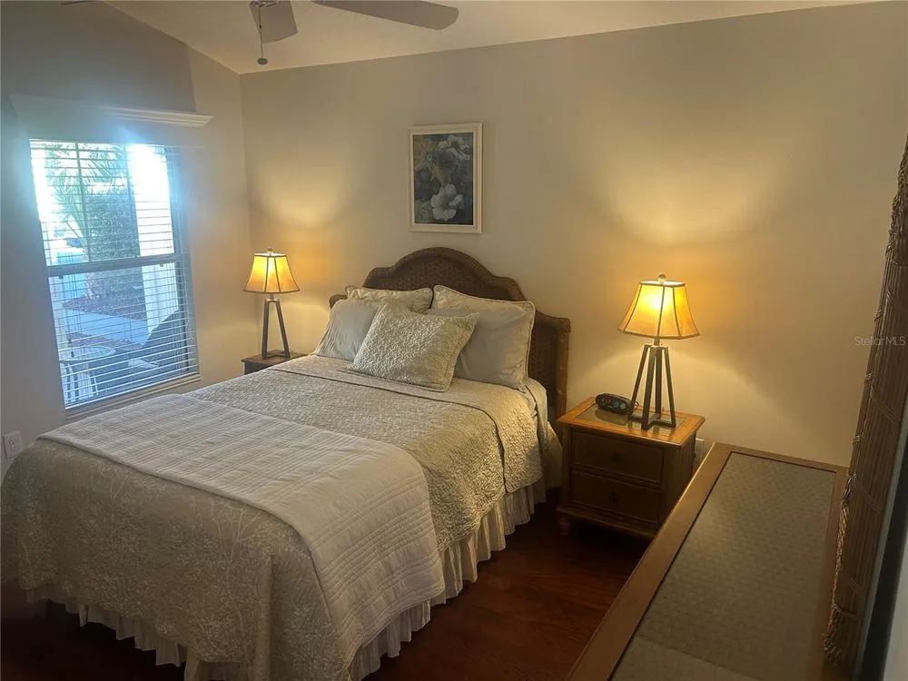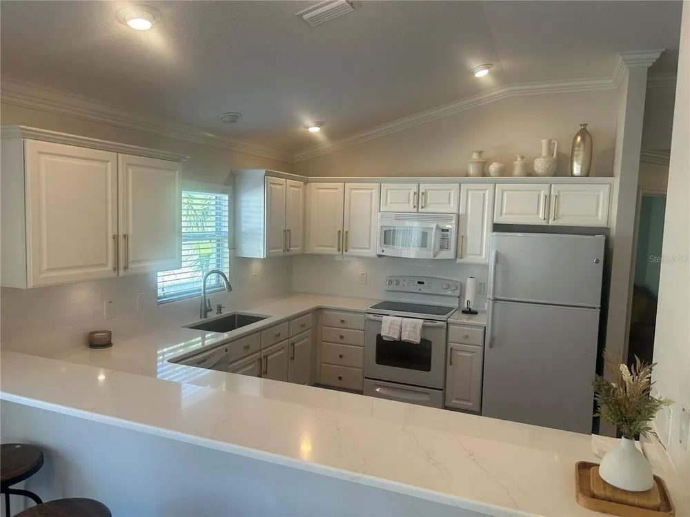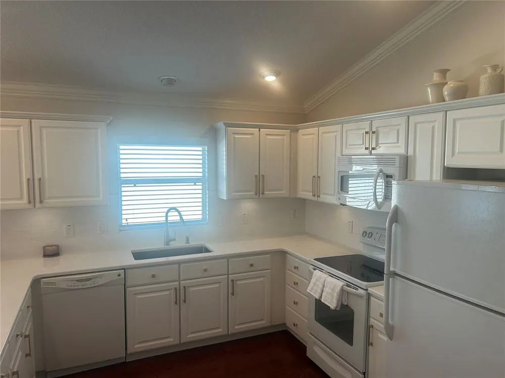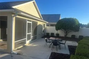 Location, Location, Location! Beautifully Updated Villa just .2 miles from Lake Sumter Landing. Walk to the boardwalk along the waterfront, enjoy dining, entertainment and shopping. This newly updated, turnkey Courtyard Villa is in the highly sought after Village of The Edgewater Bungalows. Recent updates, Sept 2025: Updated kitchen with Miraggio Gold Quartz countertops, new subway tile backsplash, extra-deep single bowl stainless steel sink with brushed nickel gooseneck faucet & pulldown spray. This beautiful kitchen has been accented with brushed gold cabinet pulls & pull-out sink drawers. Custom woodwork with 5 3/4" crown Moulding, Custom made wood cornice boxes over all the windows and door walls. New architectural asphalt shingles, New HVAC system with energy efficient furnace & A/C. New hot water tank, New garbage disposal. Newly refinished Lanai flooring. Fresh interior paint & updated exterior painted with high quality Sherwin Williams paint. Updated bathrooms, with quartz countertops, undermount sinks, brushed nickel Kohler faucets & hardware and new handheld showerheads. This Open floorplan has lots of natural light, its bright & airy, with vaulted ceilings & has a ceiling fan. The functional & well-equipped kitchen has a counter height Kitchen Bar. It has durable, engineered hardwood flooring, that flows seamlessly through-out the living room, dining room, kitchen & bedrooms. The bathrooms and laundry room are laid with Armstrong premium ceramic tile. The peaceful, private Primary Suite has a newly updated bathroom, with quartz countertops, undermount sinks, new brushed nickel faucet & hardware & new hand-held showerhead, large walk- in closet, with shelving for storage. Tray Ceiling with ceiling fan. Sliding glass door wall to the lanai and outdoor courtyard. Comes move-in ready, with TV on a mount over the dresser. Guest & Flex Rooms; Second bedroom located near guest bath with a pocket door providing private guest suite potential. Versatile third bedroom ideal as an office with a partners desk, Large bookcase and beautiful sofa. It also has a large closet. stocked with work out & sports equipment. Both Bedrooms have ceiling fans. The screened-in lanai has newly refinished flooring & a ceiling fan. The private block & stucco courtyard is perfect for pets and outdoor entertaining. Updated and low maintenance landscaping with sprinkler system. The home has tilt-in windows for easy cleaning. The front door has a keyless entry system. Garage comes with storage unit. His & Her Italian Bianchi Bicycles come with the property.
