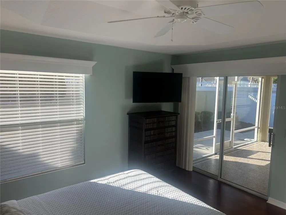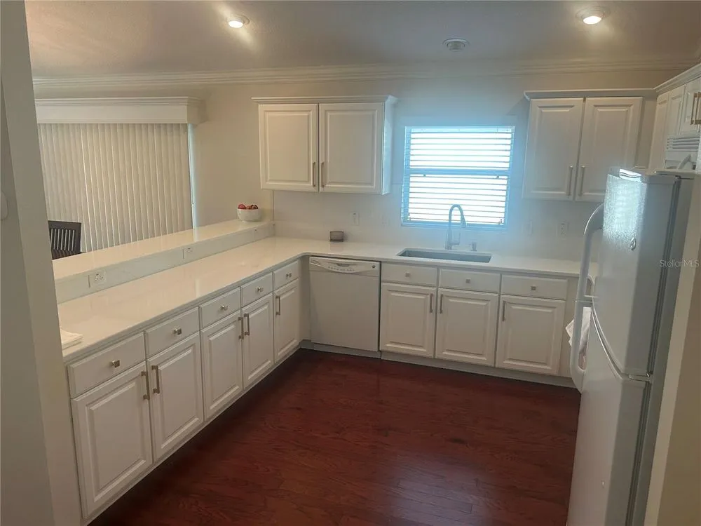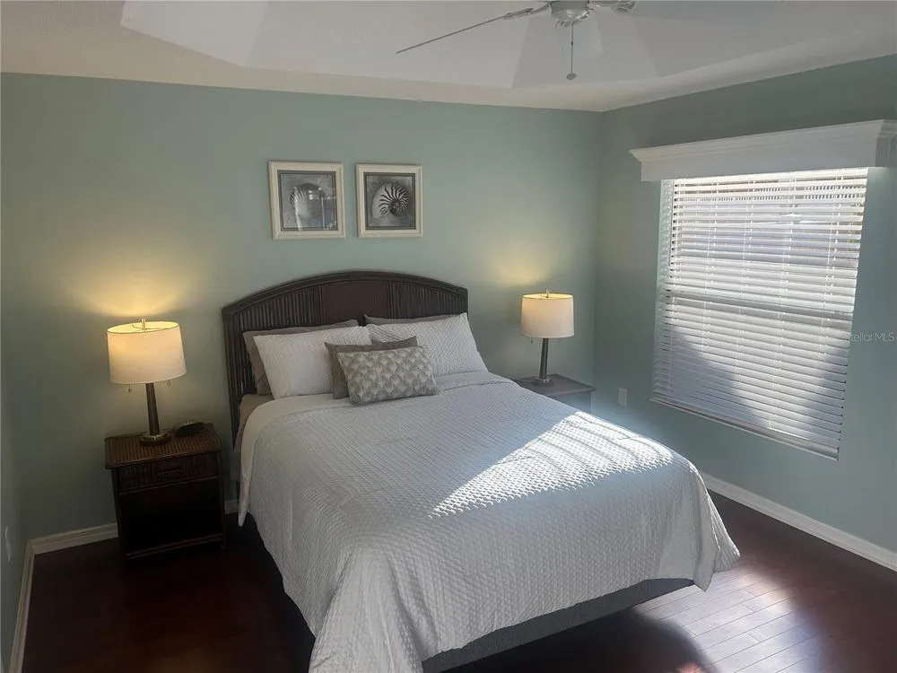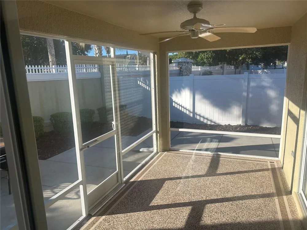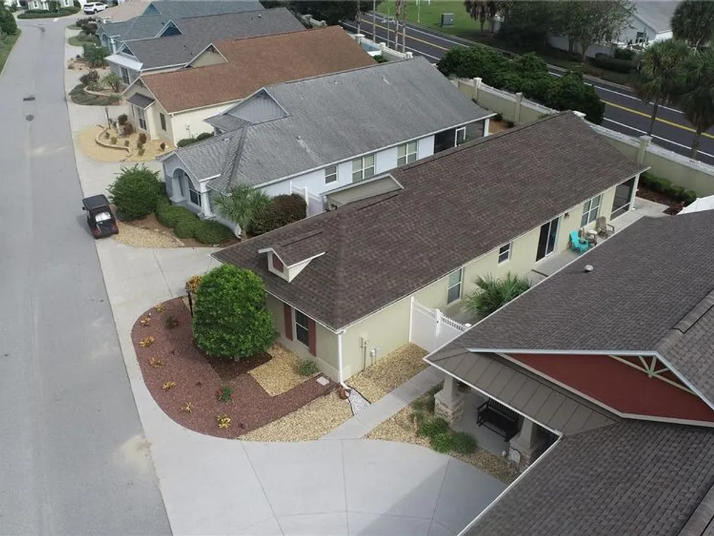 Location, Location, Location! Beautifully Updated Villa just .2 miles from Lake Sumter Landing. Walk to the boardwalk along the waterfront, enjoy dining, entertainment and shopping. This newly updated, turnkey Courtyard Villa is in the highly sought after Village of The Edgewater Bungalows. Recent updates, Sept 2025: Updated kitchen with Miraggio Gold Quartz countertops, new subway tile backsplash, extra-deep single bowl stainless steel sink with brushed nickel gooseneck faucet & pulldown spray. This beautiful kitchen has been accented with brushed gold cabinet pulls & pull-out sink drawers. Custom woodwork with 5 3/4" crown Moulding, Custom made wood cornice boxes over all the windows and door walls. New architectural asphalt shingles, New HVAC system with energy efficient furnace & A/C. New hot water tank, New garbage disposal. Newly refinished Lanai flooring. Fresh interior paint & updated exterior painted with high quality Sherwin Williams paint. Updated bathrooms, with quartz countertops, undermount sinks, brushed nickel Kohler faucets & hardware and new handheld showerheads. This Open floorplan has lots of natural light, its bright & airy, with vaulted ceilings & has a ceiling fan. The functional & well-equipped kitchen has a counter height Kitchen Bar. It has durable, engineered hardwood flooring, that flows seamlessly through-out the living room, dining room, kitchen & bedrooms. The bathrooms and laundry room are laid with Armstrong premium ceramic tile. The peaceful, private Primary Suite has a newly updated bathroom, with quartz countertops, undermount sinks, new brushed nickel faucet & hardware & new hand-held showerhead, large walk- in closet, with shelving for storage. Tray Ceiling with ceiling fan. Sliding glass door wall to the lanai and outdoor courtyard. Comes move-in ready, with TV on a mount over the dresser. Guest & Flex Rooms; Second bedroom located near guest bath with a pocket door providing private guest suite potential. Versatile third bedroom ideal as an office with a partners desk, Large bookcase and beautiful sofa. It also has a large closet. stocked with work out & sports equipment. Both Bedrooms have ceiling fans. The screened-in lanai has newly refinished flooring & a ceiling fan. The private block & stucco courtyard is perfect for pets and outdoor entertaining. Updated and low maintenance landscaping with sprinkler system. The home has tilt-in windows for easy cleaning. The front door has a keyless entry system. Garage comes with storage unit. His & Her Italian Bianchi Bicycles come with the property.