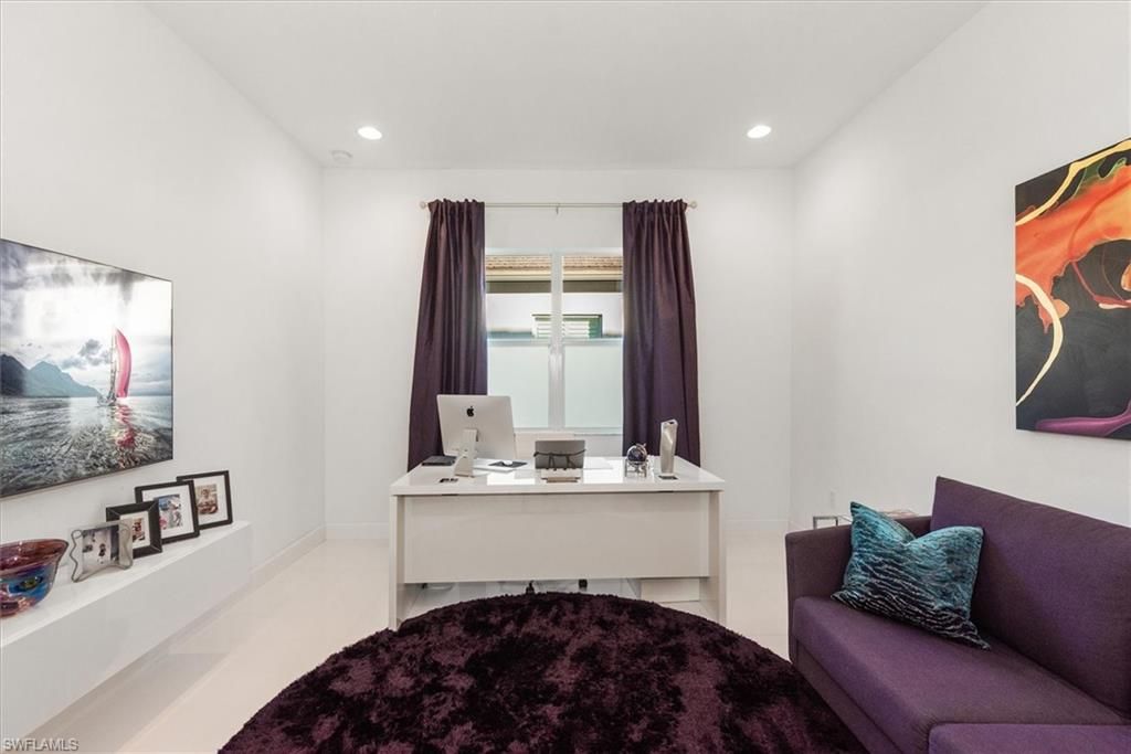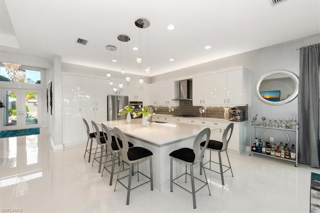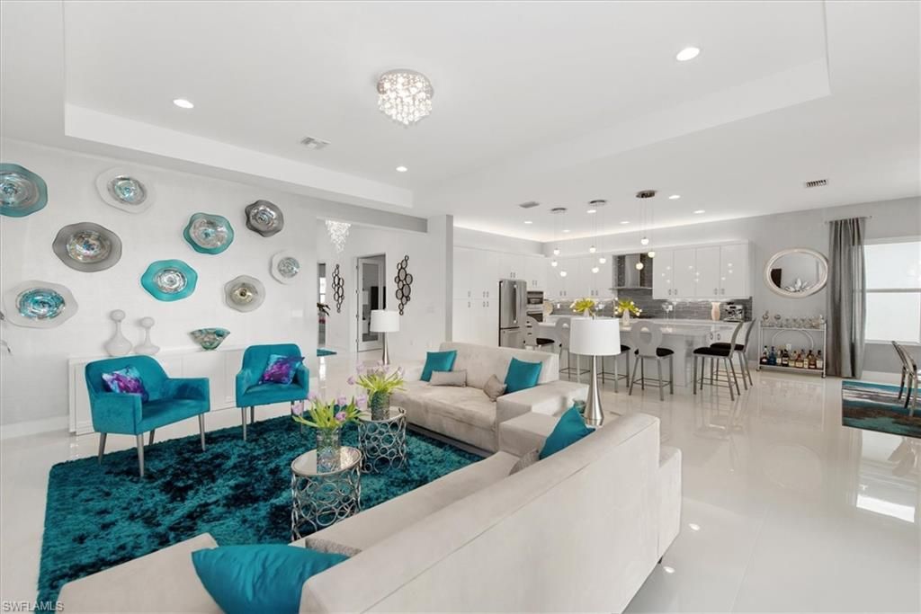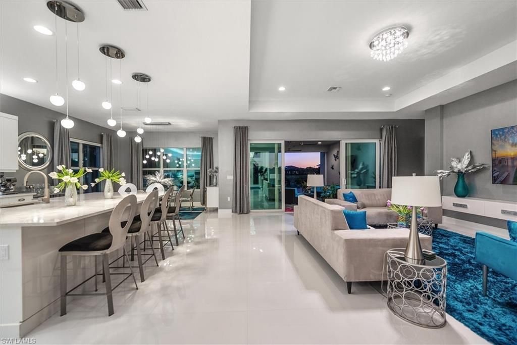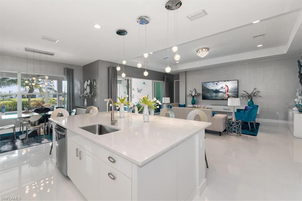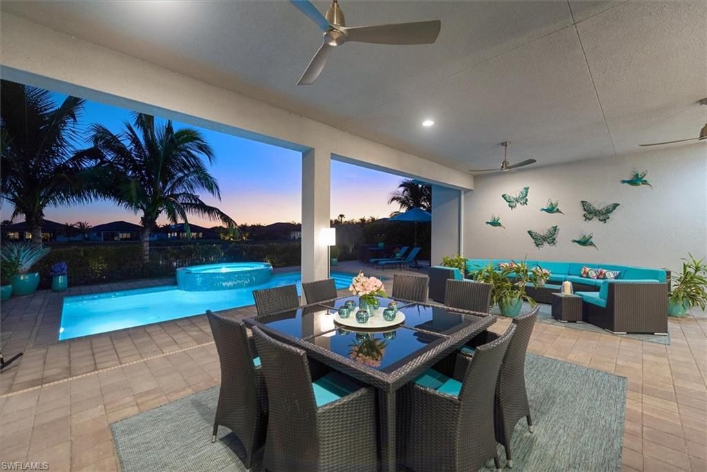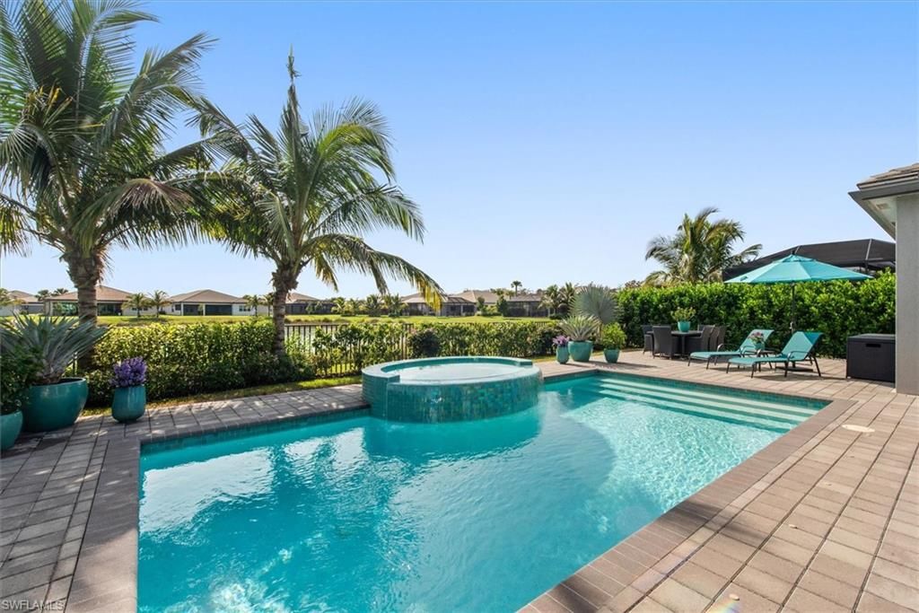 SHOWS LIKE A MODEL! This gorgeous Sunrise model is located on a beautiful southern exposure lake lot, giving you lots of sun all year on the pool and spa along with spectacular sunset views. Fully landscaped with 8' Clusia hedges providing lots of privacy. Interior upgrades include Eurocraft acrylic overlay cabinets (kitchen, primary bath, powder room and den); soft close doors and pull-out shelves in kitchen under the stovetop; 33"x33" white polished porcelain tiles in kitchen, main living area, den and hallways; custom lighting and extra recessed lighting; hanging cabinets in living room, den and bedroom 3; central vacuum system; upgraded GE Profile appliance package, including 5-burner stove and cabinet-flush refrigerator; upgraded Moen kitchen faucet and single kitchen bowl; hooded vent over range; upgraded door pulls on cabinets; glass tile backsplash; upgraded carpet and padding in bedrooms; glass front double doors. Exterior upgrades include premium lake lot; heated pool and 8-seat spa with 9' spillway with super pump to push water over the edge of the waterfall; custom outdoor kitchen with two refrigerators, gas grill, large sink, pull-out trash receptacle and lots of counter space; retractable REMOTE CONTROLLED no-see-um screens to keep the bugs out; lanai fans; TV outlet; upgraded pavers; upgraded landscaping back and front...and more. Minutes from restaurants and shopping. This is your opportunity to enjoy the Naples lifestyle in the highly sought after fun and active Valencia Trails community.