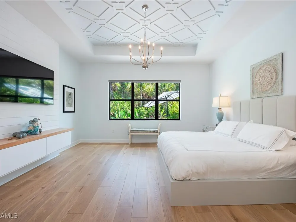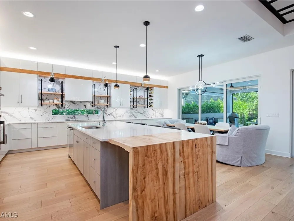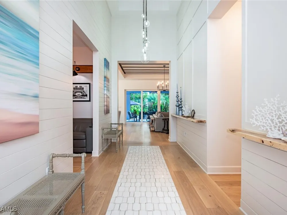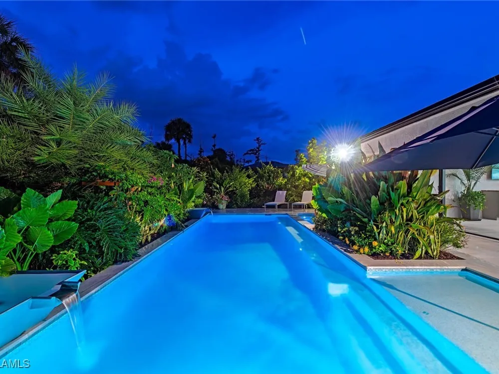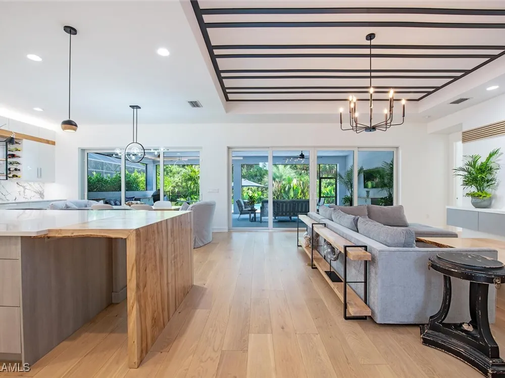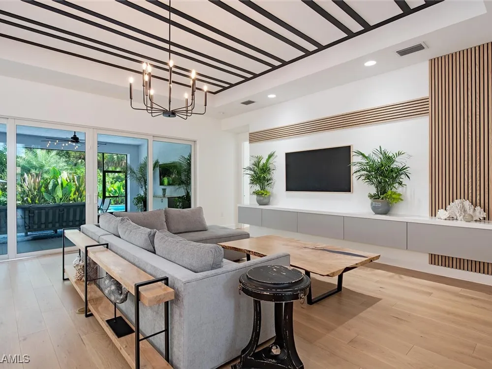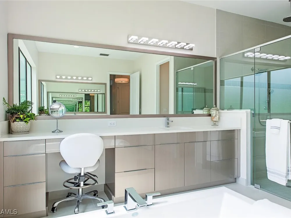 Welcome to one of the most thoughtfully crafted homes in Valencia Trails. Privately nestled along a tranquil preserve, surrounded by lush tropical landscaping, this spectacular Captiva model is a masterpiece, blending modern elegance with peaceful seclusion. Step through the glass front doors into a soaring foyer featuring an intricate marble inlay set seamlessly into the surrounding French white oak hardwood flooring that flows throughout the main living areas. At the heart of the home, a chef’s dream kitchen awaits; designed to impress & equipped to perform. Sleek Eurocraft Reflekt acrylic cabinetry, expanded by 9 feet into the dining space, has soft-close drawers, multiple custom cabinet inserts & pull-outs, and ambient cabinet lighting. A striking porcelain backsplash complements the quartz countertops, while an oversized island offers generous prep space, additional storage & effortless flow for entertaining. The Thermador Professional Series appliance suite includes a side-open convection oven, freedom induction cooktop, speed oven-microwave, Sapphire dishwasher & a column refrigerator. Sub-Zero beverage & freezer drawers and a custom vented hood also deliver professional-grade performance. The great room showcases a striking custom feature wall & is framed by views of the lush preserve through impact-rated sliding glass doors. Outside, the thoughtfully graded lanai has a step-free surface for enhanced safety & the White Ice marble pavers offer an elevated, coastal aesthetic. A Kings Starboard cabinet system adds storage & functionality. The saltwater pool is a standout—35 feet in length with an integrated spa, a sundeck & elegant water bowls for a serene, resort-like experience. Heated by gas, the pool & spa are ready for year-round enjoyment. The extended covered lanai is framed by an invisible screen enclosure and the tranquil preserve view makes this outdoor oasis very private & picturesque. The primary suite offers a spa-inspired bath with an oversized rain shower, soaking tub, dual vanities with Eurocraft cabinetry & 3 generously sized custom walk-in closets. There are 3 additional en-suite guest bedrooms, one featuring built-in bunk beds. An expansive den with a custom built-in entertainment wall provides flexible space for a home office, media room, or additional living area. Fine features include solid core doors, hurricane impact windows & doors, extensive millwork & shiplap, curated lighting accents, epoxy garage flooring, tankless water heater, fenced dog-run & a custom finished laundry space with GE pedestaled washer/dryer. Valencia Trails is more than a community—it's a lifestyle. This exclusive 55+ neighborhood features world-class amenities, including a 43,000 SF clubhouse with gourmet restaurant, poolside bar, resort-style pools, fitness center, pickleball, tennis, bocce, yoga, art studio, cooking classes, spa, dog park & a vibrant social calendar. This is your invitation to live where everyday feels like a resort getaway.
