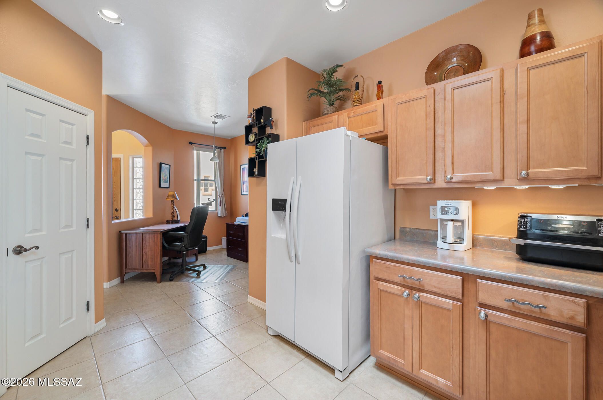 Step inside and feel it right away--light-filled, clean, and beautifully cared for. This expanded Sabino model, approx. 1275 sq ft, blends warmth and simplicity with arches, skylights, and tile throughout. The kitchen offers generous cabinetry, dual pantries, and a breakfast bar that draws people in. The primary suite is a quiet retreat with a sunny bay window, plus a comfortable guest room. Ample closet space throughout and extra garage storage. Enjoy a private covered patio perfect for morning coffee or evening conversations on a quiet cul-de-sac. Turn-key, fully furnished with a complete kitchen and tasteful decor inside and out.