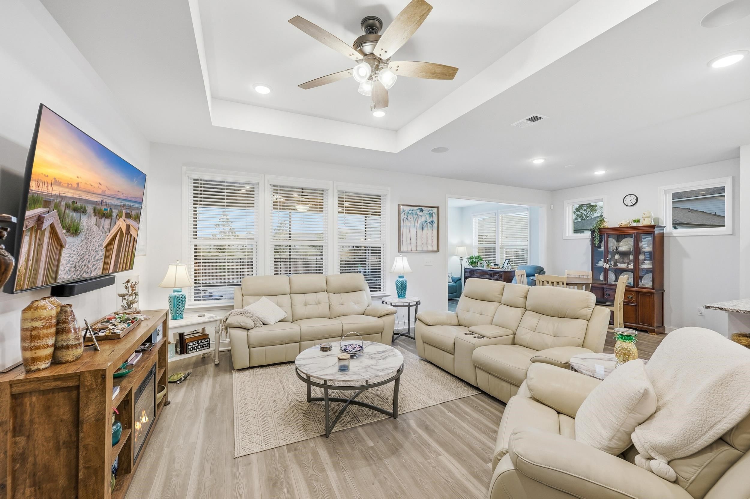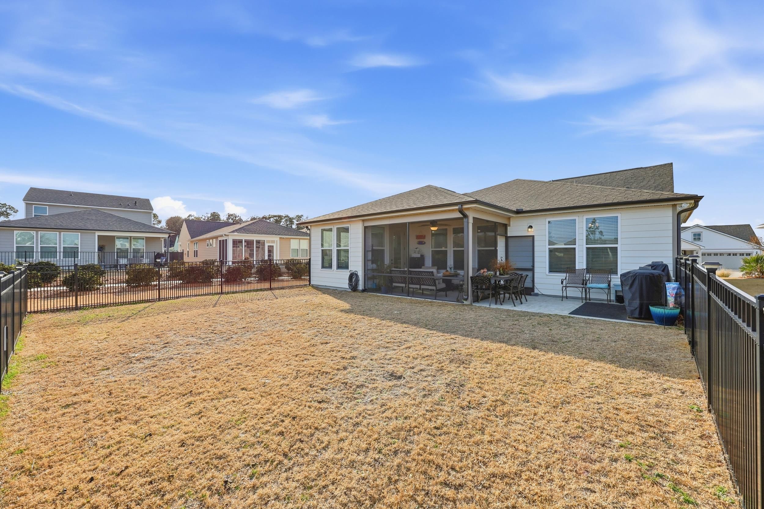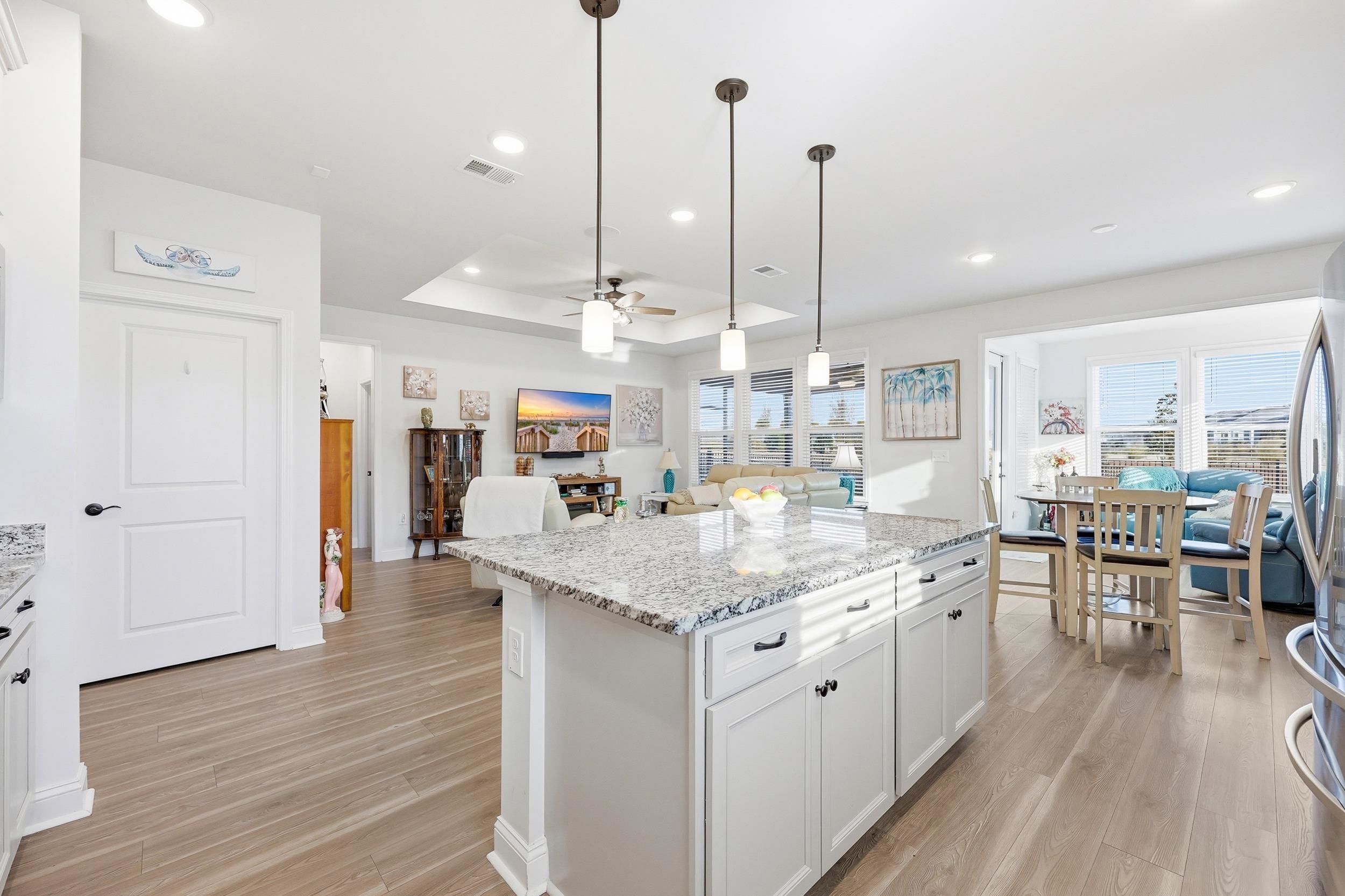 Welcome to 1206 Coneflower Way, a beautifully designed 3-bed, 2-bath ranch home perfectly positioned on a private, fenced lot in the award-winning Del Webb North Myrtle Beach community. With thoughtful upgrades; LVP flooring throughout, tankless hot water heater, natural gas community, black gutters, screened in porch with extra patio area for grilling ideal spaces for living and entertaining, this home embodies relaxed coastal comfort just moments from the beach. Step inside to an inviting open layout where the gourmet-style kitchen anchors the heart of the home. Featuring modern cabinetry, stainless appliances, and a central island, this space flows seamlessly into the bright living room and dining areas — perfect for everyday living or hosting friends. The Carolina room extends the living space with abundant natural light and transitions effortlessly to the screened-in porch, creating a relaxing indoor-outdoor lifestyle. Overlooking the fully fenced backyard, this setting adds privacy and year-round enjoyment in a peaceful setting. Retreat to the spacious owner’s suite with trey ceiling featuring a spa-like bathroom with an expansive walk-in tile shower and upgraded double vanities — a perfect blend of style and function. Two additional bedrooms offer flexibility for guests, hobbies, or a home office. Fully size laundry room with upgraded tile flooring. This exceptional home is part of the vibrant 55+ Del Webb community, where resort-style amenities and a full calendar of social activities are curated by a full-time Lifestyle Director. Residents enjoy: Indoor lap pool and outdoor saltwater pool with two hot tubs, pickleball courts, bocce courts, putting green, fitness center and walking trails, Monthly events and clubs for active, social living. Sidewalks on both sides of every street for strolls and neighborly connection. Low-maintenance lifestyle with proximity to beaches, dining, golf courses, and more. Located just minutes from Crescent Beach access, community recreation centers, shopping, dining, and medical facilities, this home offers the perfect blend of coastal charm and active adult convenience.