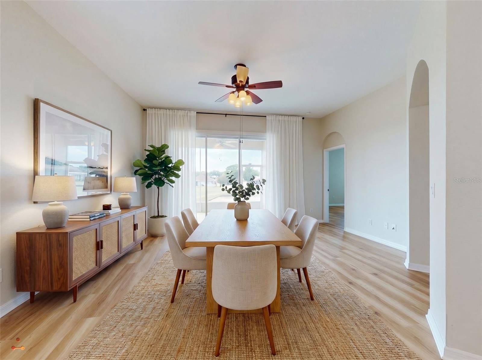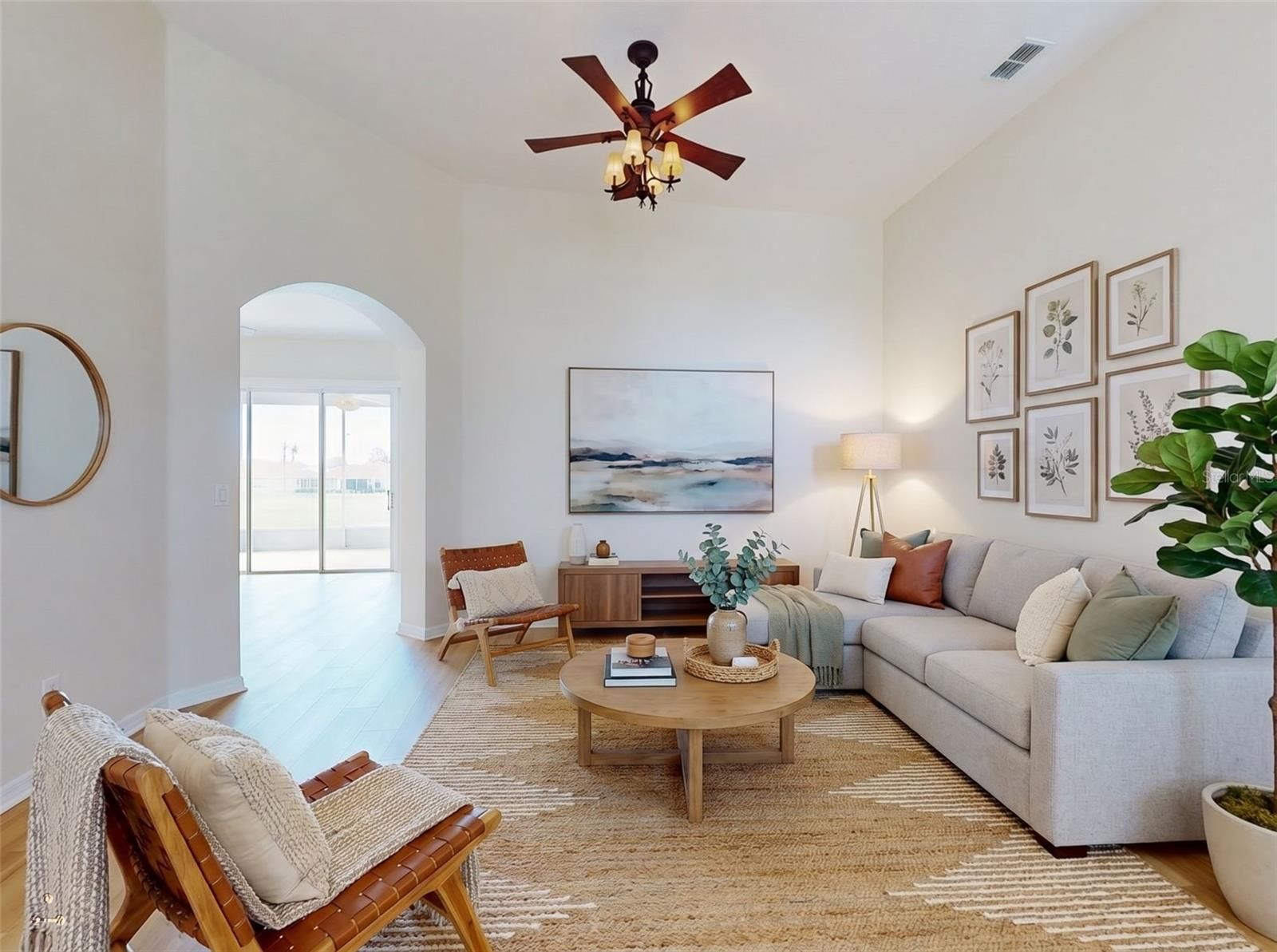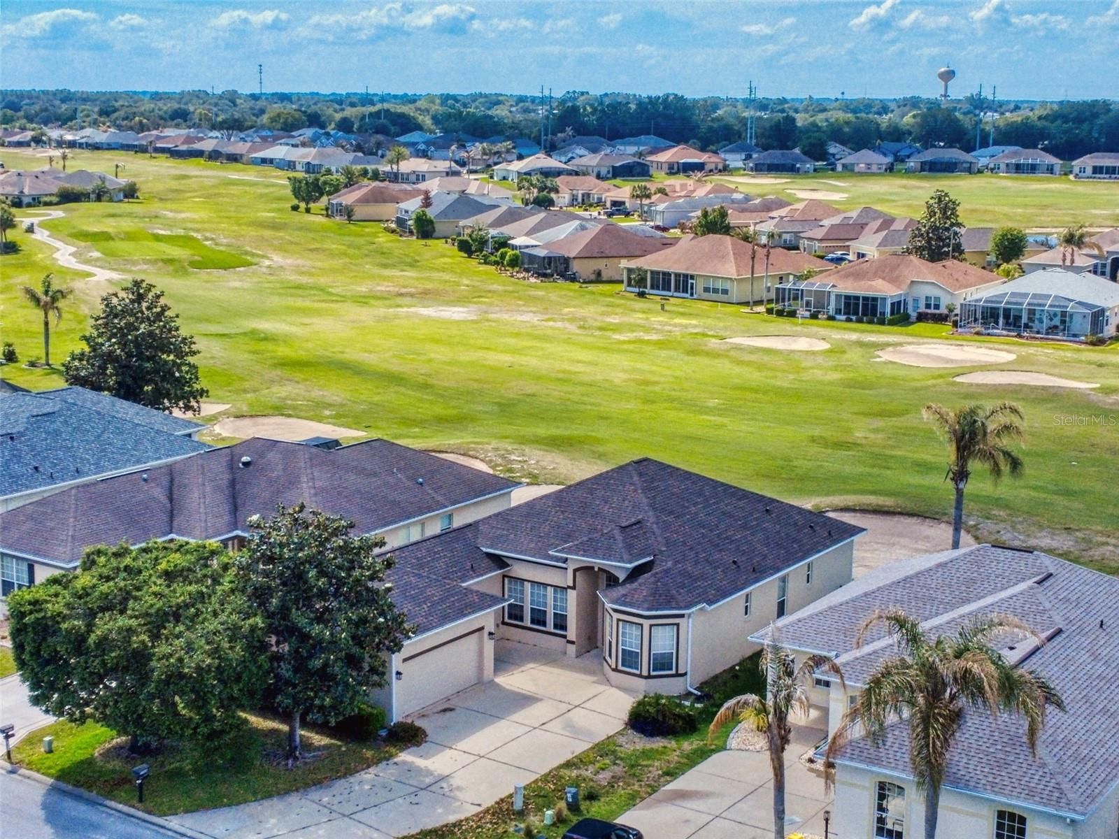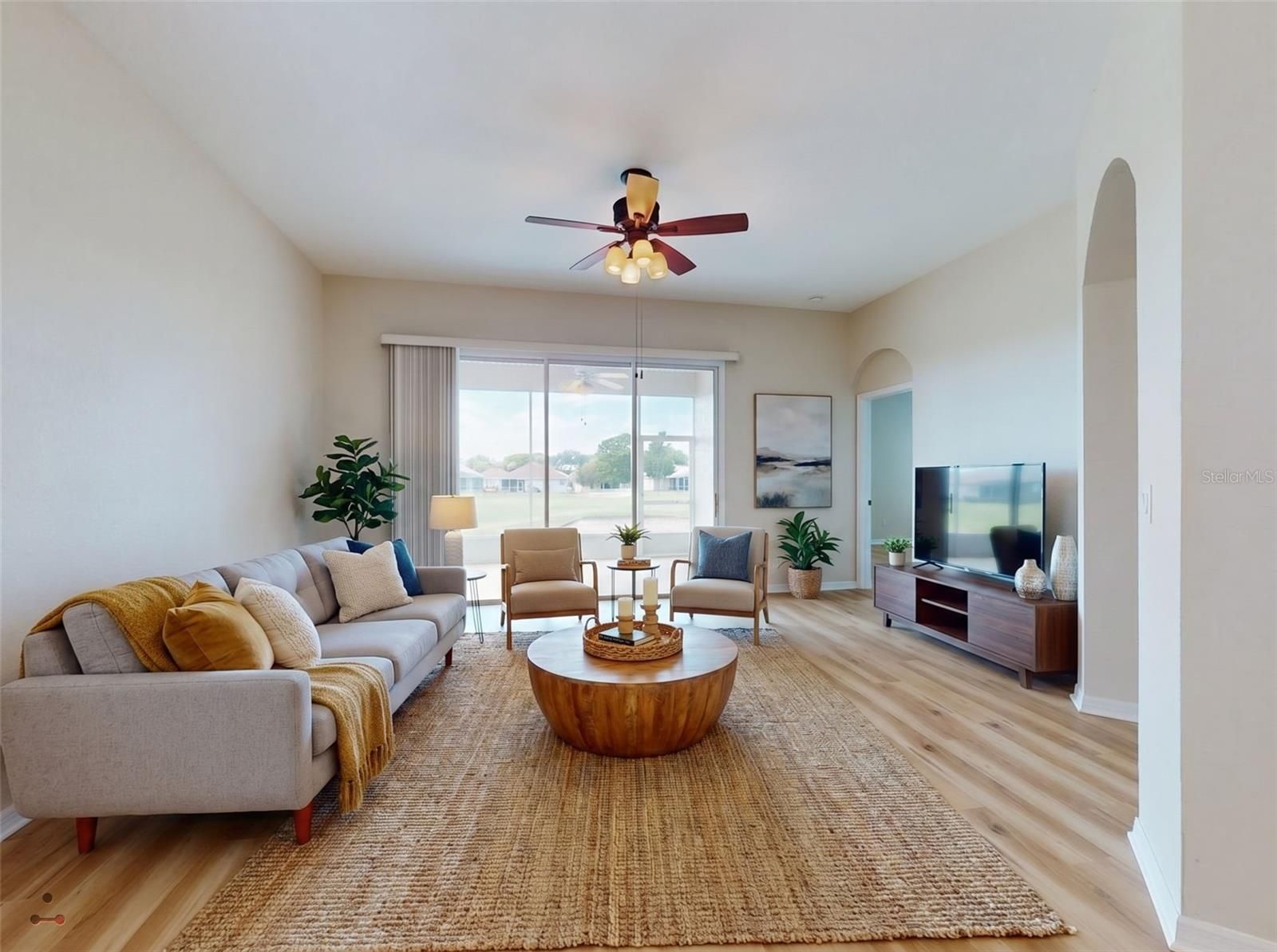 One or more photo(s) has been virtually staged. One or more photos has been virtually staged. Stonecrest - This newly updated home is located on the 8th hole of the Stonecrest Championship Golf Course. This home has been completely updated with a new roof (2025) HVAC (2024) tankless water heater (2021), new vinyl plank flooring throughout and newly painted both interior and exterior. The kitchen has new appliances (2023) and 42 inch cabinets. The spacious floor plan features 10 foot ceilings and split bedroom plan. The primary suite features walk-in closet, ensuite bath with dual vanities, sunken tub, shower and separate water closet. The guest bath has a tub with shower. The third bedroom is currently being used as a home office. The living room has glass sliders that open to a screened patio overlooking the golf course. Stonecrest is a golf course community offering a wide varity of activities and amenities including 3 outdoor pools, an all weather enclosed pool, spa, fitness center, restaurant, community activity center and so much more. A golf cart ride to The Villages.