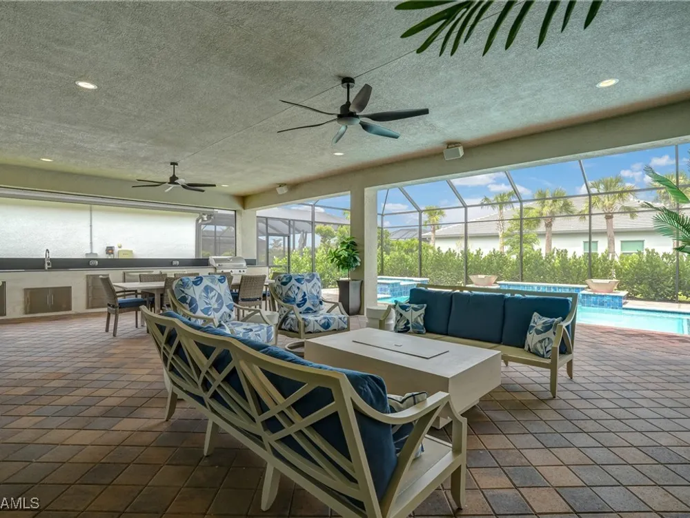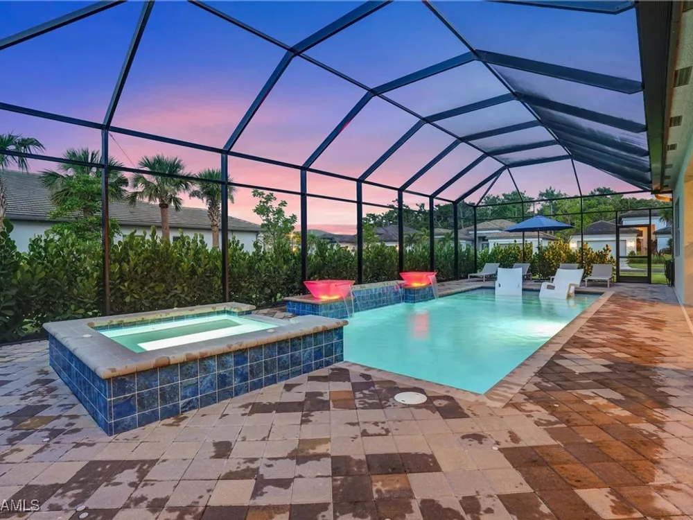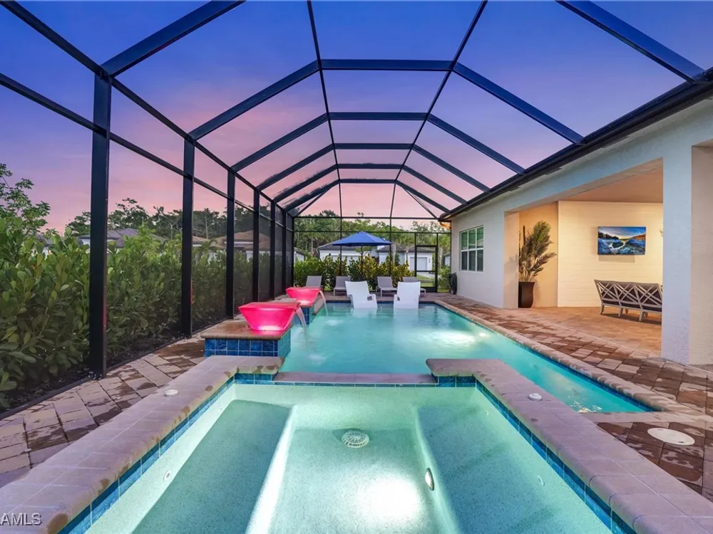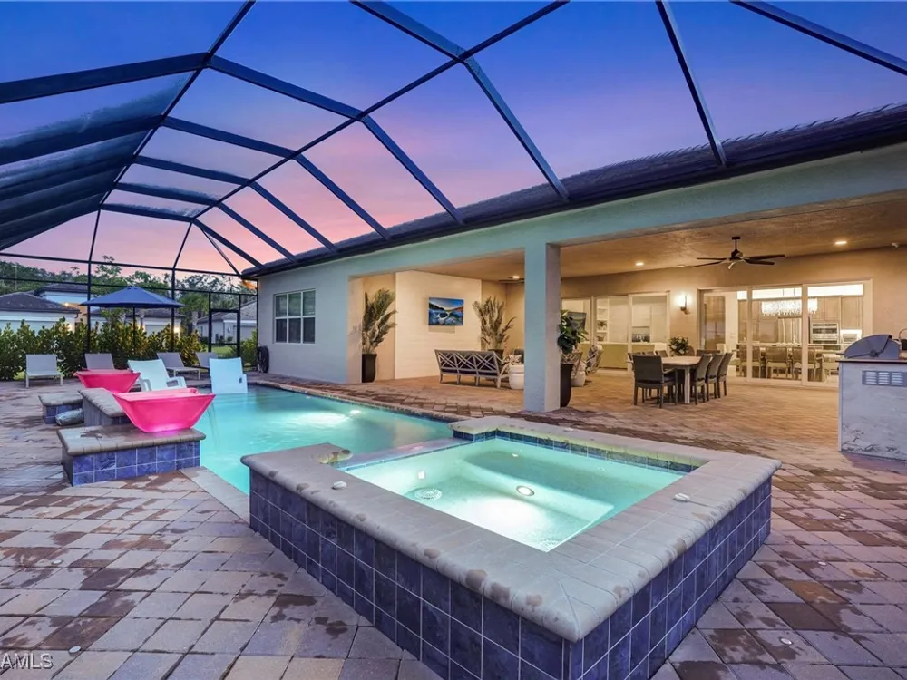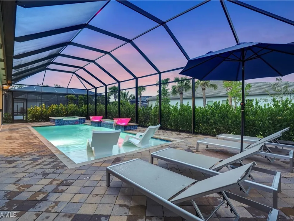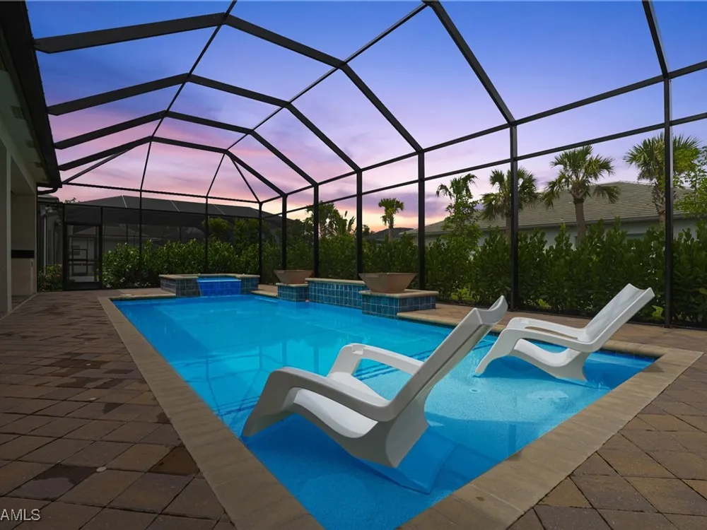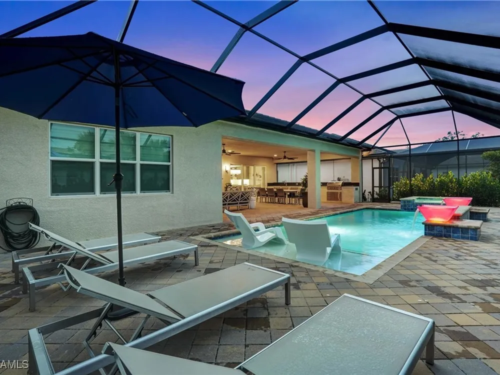 Discover unparalleled luxury in Naples' premier 55+ community, Valencia Trails, with this exquisite Captiva floorplan home, a highly sought-after design by GL Homes. Built in 2023, this newly constructed residence boasts professional decor and nearly every premium builder upgrade available. Situated on one of the largest lots in the community—nearly half an acre—this corner property on a private cul-de-sac street offers both space and serenity. The renowned Valencia Trails clubhouse is just a short stroll around the corner. This expansive home features 4 bedrooms, each with its own en suite bathroom, plus an additional half guest bath for ultimate convenience. Car enthusiasts will appreciate the air-conditioned, extended-length 3-car garage, perfect for your collection. Step outside to the iconic Captiva covered lanai, measuring an impressive 37 x 22 feet, complete with a state-of-the-art summer kitchen and exceptional outdoor living space. The custom saltwater pool and spa create a refreshing daytime oasis and transform into a dazzling nighttime retreat with a lighted spa waterfall and elegant spill-over bowls. Valencia Trails is equipped with natural gas, and this home includes a natural gas cooktop, water tank, and pool heater for added efficiency and comfort.