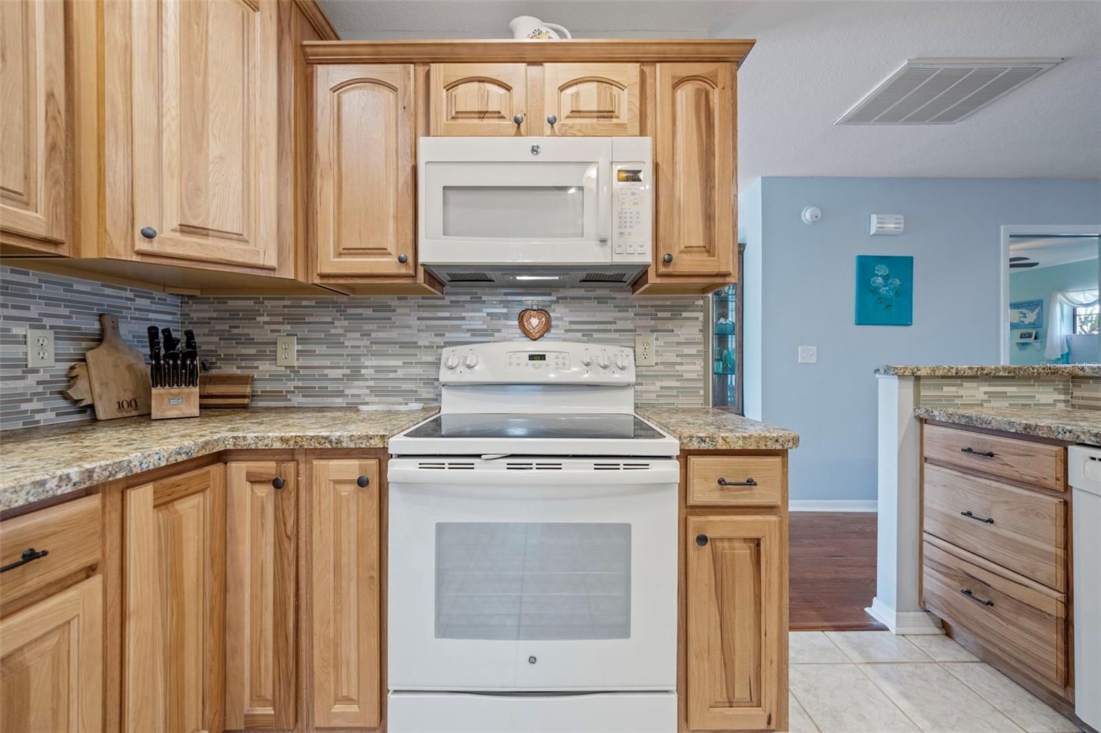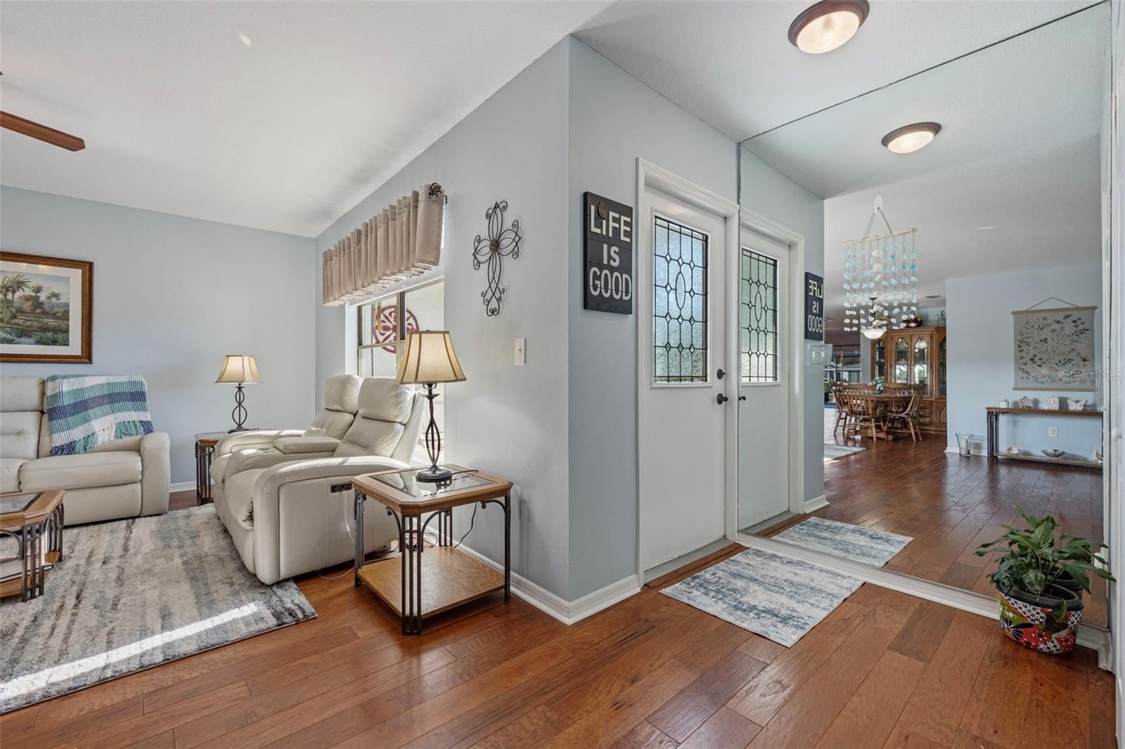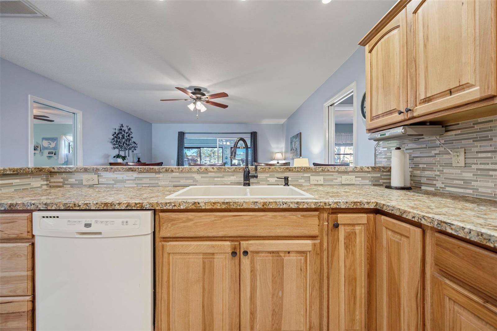 Tucked away in the tranquil Bluewater neighborhood, this distinctive Twintree model offers a rare blend of comfort, privacy, and scenic beauty. Step inside to discover rich wood flooring that anchors the main living areas and sets a welcoming tone throughout the home. Large windows and thoughtful design draw your eye to the glass-enclosed lanai, complete with heat and air conditioning, where peaceful views of Acacia Lake create a perfect space to unwind year-round. Designed with both homeowners and guests in mind, each bedroom includes an ensuite bath, with pocket doors adding an extra layer of privacy. The updated kitchen is as functional as it is stylish, featuring hickory cabinetry with soft-close doors and drawers, pull-out shelving, dual lazy Susans, and expansive counter space. A sleek glass backsplash adds visual interest, while the recessed French-door refrigerator—cleverly tucked into the garage—maximizes kitchen flow and workspace. Whether prepping meals or cleaning up, the pond views and visiting wildlife make everyday moments feel special. The raised counter comfortably seats four for casual dining. The laundry room, conveniently located off the kitchen, offers exceptional storage with a pantry, closet, cabinetry, and a utility sink. Quality pleated blinds are installed throughout the home, and additional upgrades include a whole-house Culligan water treatment system and an irrigation system that draws from the pond, helping reduce water costs. Peaceful, thoughtfully designed, and filled with standout features, this home is truly something special. Schedule your showing and experience it firsthand. AC 2020 and new water heater to be installed prior to close.