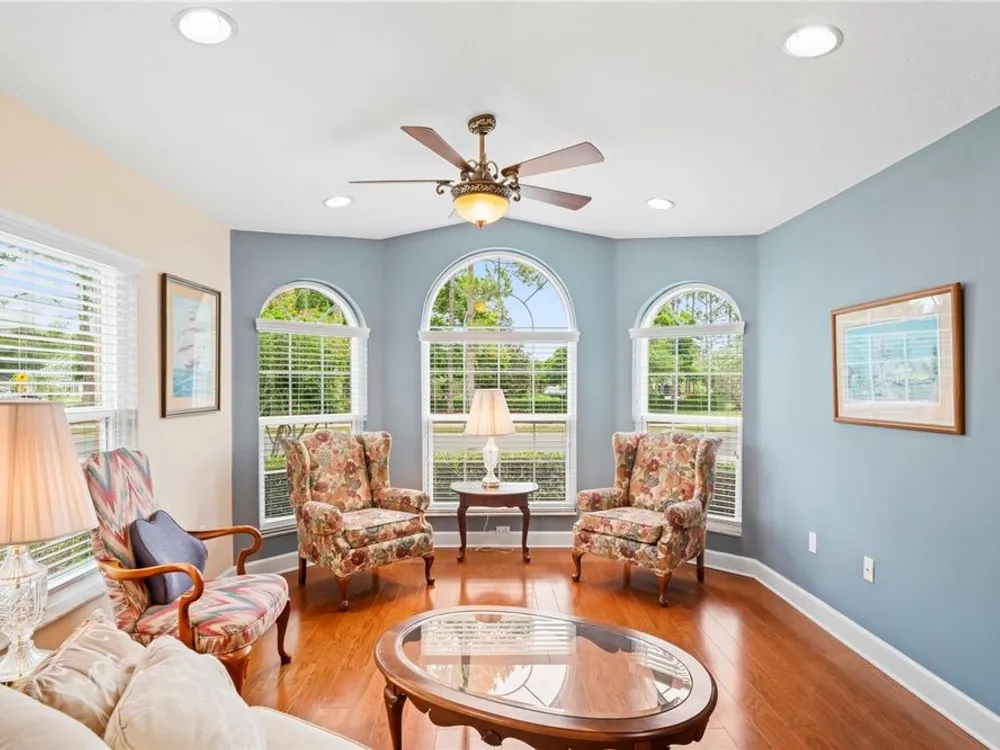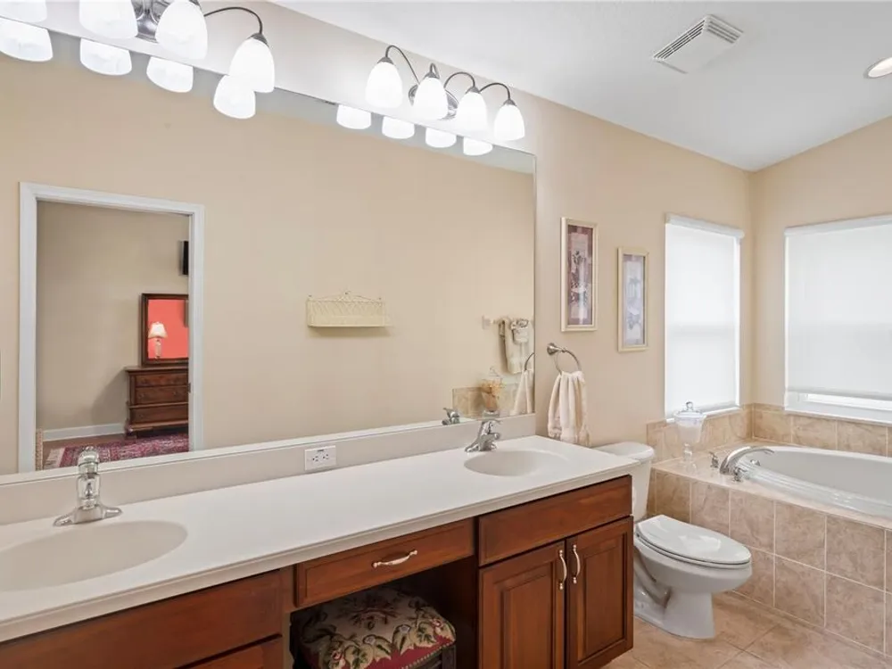 In the heart of Wellington's Seven Hills community, a 55+ neighborhood, lies the coveted Bluebird model. This three-bedroom, two-bathroom residence features a two-car garage, formal living and dining rooms with designer lighting, and a modern kitchen equipped with 42-inch wood cabinets with under counter LED lighting, tile backsplash, pull-out drawers, pot drawers, a lazy Susan, Quartz countertops, stainless steel appliances, a pantry, breakfast bar, breakfast nook, and luxury vinyl tile flooring all seamlessly connected to the expansive family room. The owner's suite has a large walk-in closet and private bathroom, complete with a separate shower, garden tub with air jets, and dual sinks with Corian countertops. The extended lanai, upgraded with tinted acrylic windows in 2021 and plank ceramic tile, offers a serene escape. Additional features include two secondary bedrooms, a hall bathroom with Corrian countertops, and an inside laundry room includes newer front load washer and dryer. Notable upgrades include a new roof 2021 and upgraded carrier air conditioning system 2019, upgraded tinted double pane windows as well as hurricane shutters, wood flooring in main living and bedrooms, 5-inch baseboards, quiet Quorum fans, and a newer side garage door. Decorative curbing encircles the whole house and trees, and the backyard overlooks a lush green space and is conveniently located across from one of Wellington's many parks. Seller has transferable warranties for the a/c unit, the termite, washer and dryer, stove and dishwasher. Enjoy all the amenities the Wellington community has to offer, including a vibrant clubhouse, have dinner and drinks at the Wellington bar and Grill. $225 HOA fee a month includes: Fiber optic internet and TV; multifunctional clubhouse, pool, spa, pickleball and tennis courts; Bocce ball, Billiard room, exercise room. Lots of clubs, community trips, parties, bingo and so much more. You can be as busy as you wish.
