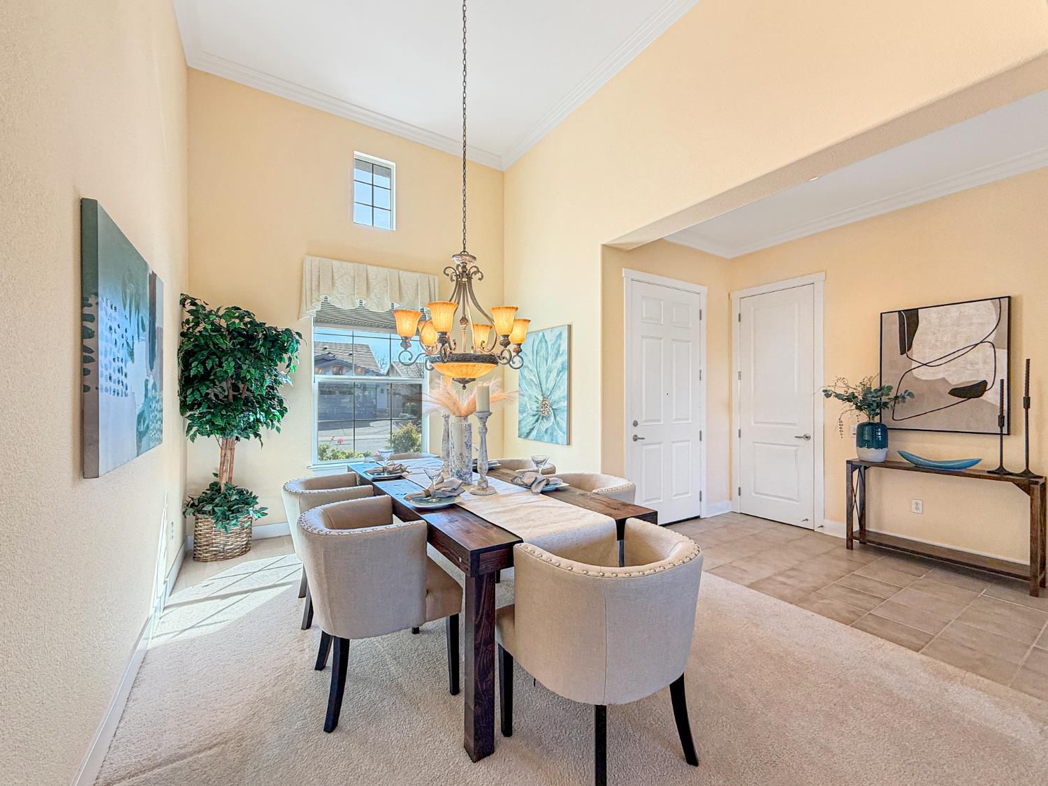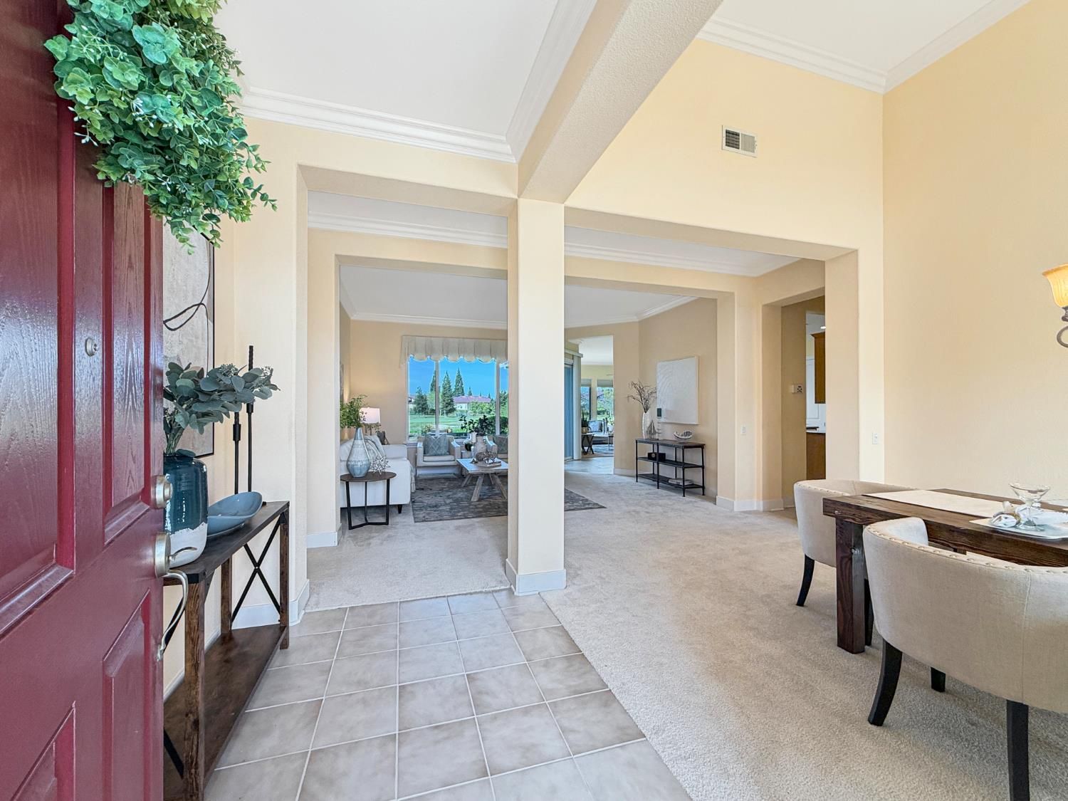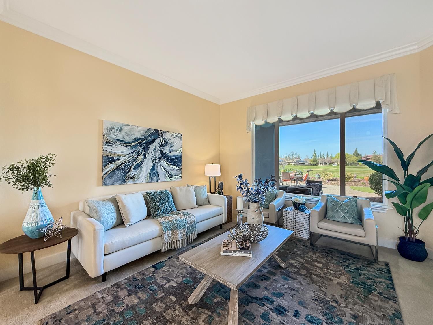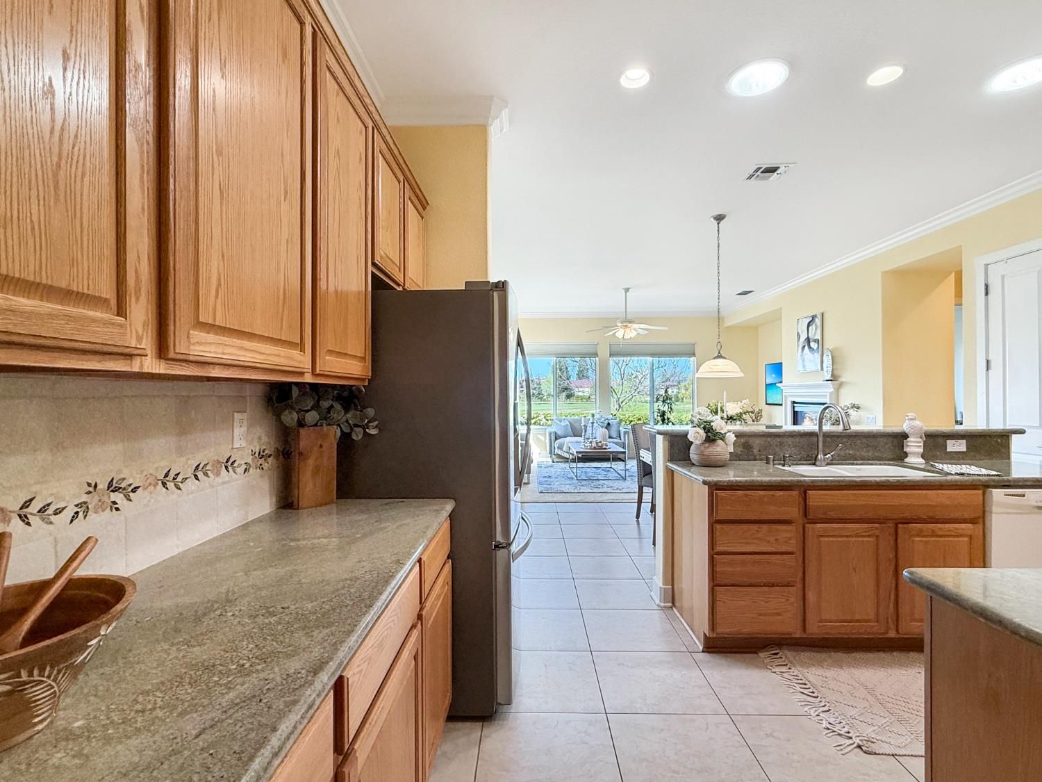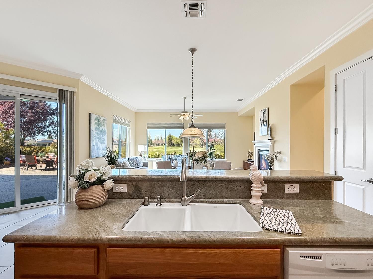 Welcome to this stunning Marin model on the golf course in Sun City Lincoln Hills! Low-maintenance landscaping sets the tone before you even step inside. A dramatic vaulted entry with crown molding opens to both a formal living room and formal dining room, immediately showcasing the home's spacious, light-filled layout. The formal living room features large picture windows and a slider framing direct golf course views a backdrop that never gets old. The family room centers around a gas fireplace with a classic white mantel surround, perfect for relaxed evenings at home. The well-appointed kitchen offers abundant oak cabinetry, granite countertops, a large center island with sink, gas cooktop, double wall ovens, a built-in microwave, tile backsplash with decorative border accent, walk-in pantry, recessed lighting, and tile floors throughout. A generous inside laundry room with upper cabinets and folding counter adds everyday convenience. The split-bedroom floor plan provides excellent privacy the spacious primary suite features a vaulted ceiling, ceiling fan, a wall of windows overlooking the golf course, a slider to the back patio, and dual walk-in closets. Two additional bedrooms and a full guest bath with tub/shower combo round out the interior, along with a powder room for guests. Step outside to a large aggregate patio perfect for entertaining, artificial turf, and mature landscaping all set against sweeping golf course views. Sun City Lincoln Hills offers resort-style living with two clubhouses, pools, fitness center, pickleball, tennis, golf, walking trails, and a vibrant social calendar the ultimate active adult lifestyle!