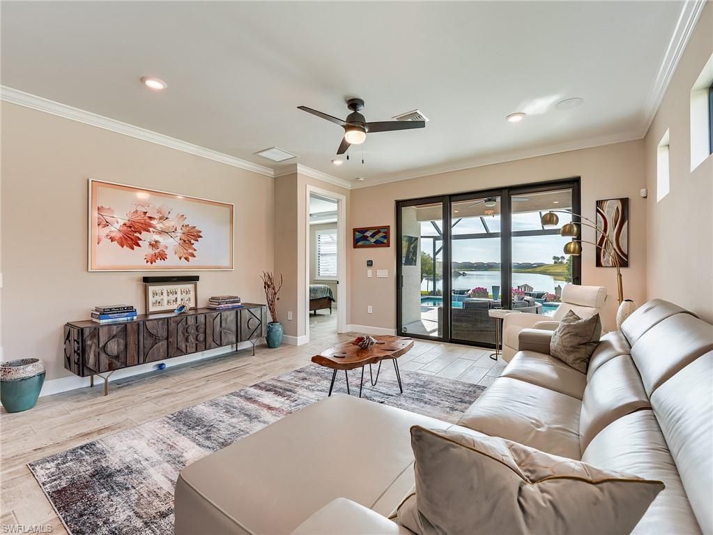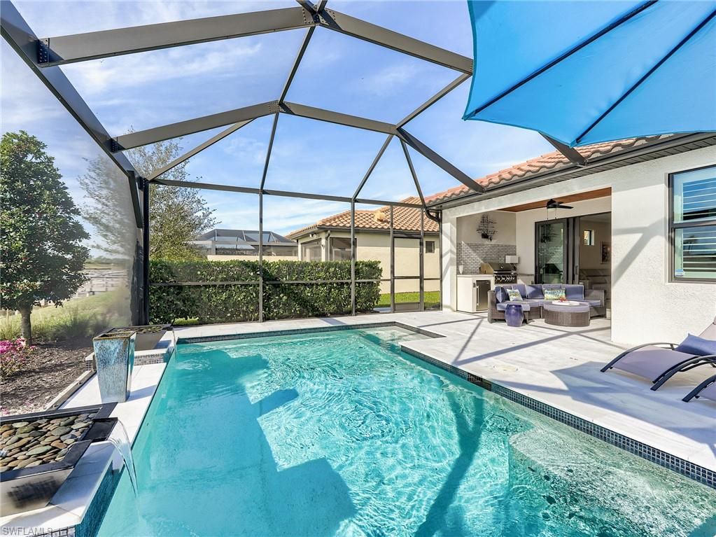 Experience the ultimate waterfront lifestyle at a significantly lower price point than comparable lake-access homes. Located in the prestigious Esplanade Lake Club, this 2021 "Ellenwood" villa is a high-tech masterpiece featuring a private boat dock with direct access to 352-acre Lake Como. The unique lot setbacks and strategic views create an exceptionally private setting.Inside, enjoy premium plank tile flooring and a professional tech suite including 8 hard-wired (Cat 5) TVs—highlighted by a 75” Samsung Frame—and a Sonos sound system. The backyard is an entertainer’s dream, boasting an expanded travertine lanai, wood-plank ceilings, and a stone accent wall. Relax by the custom pool with cascading waterfalls, managed via the Aqualink system and framed by a "picture window" screen for unobstructed, long water views down the canal. The outdoor kitchen comes fully equipped with a built-in grill, fridge, and sink. Home has hurricane impact windows and doors throughout for piece of mind. This home offers resort-style living with a waterfront bar/grille, private beach, and sports courts. Skip the wait for new construction and enjoy elite luxury with low HOA fees and county-only taxes. This move-in-ready gem is priced to sell in one of SWFL’s most sought-after communities!
