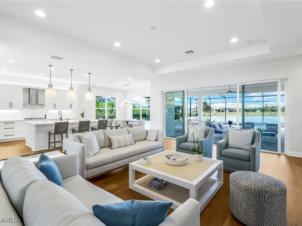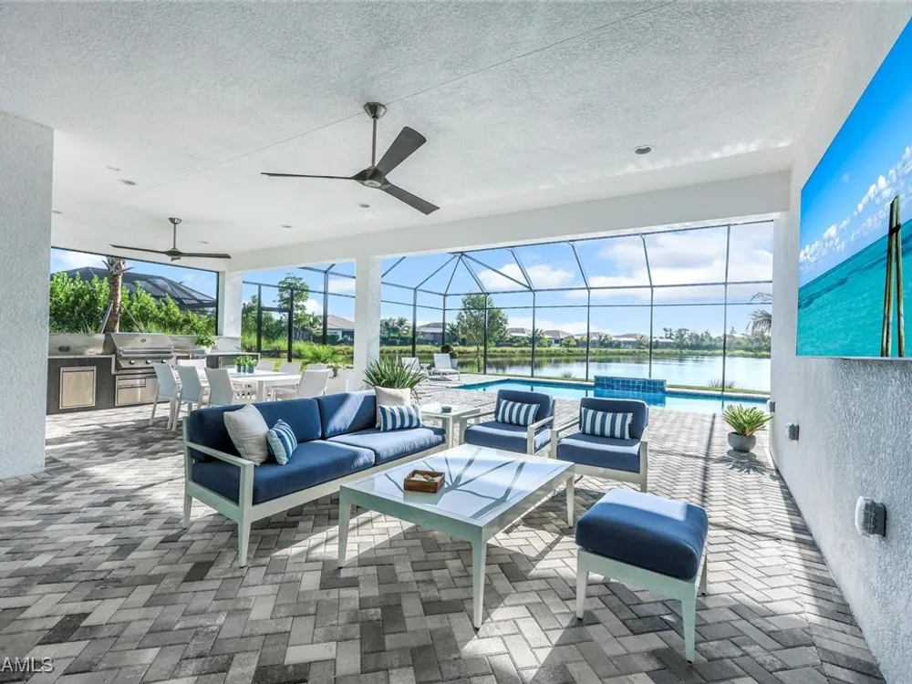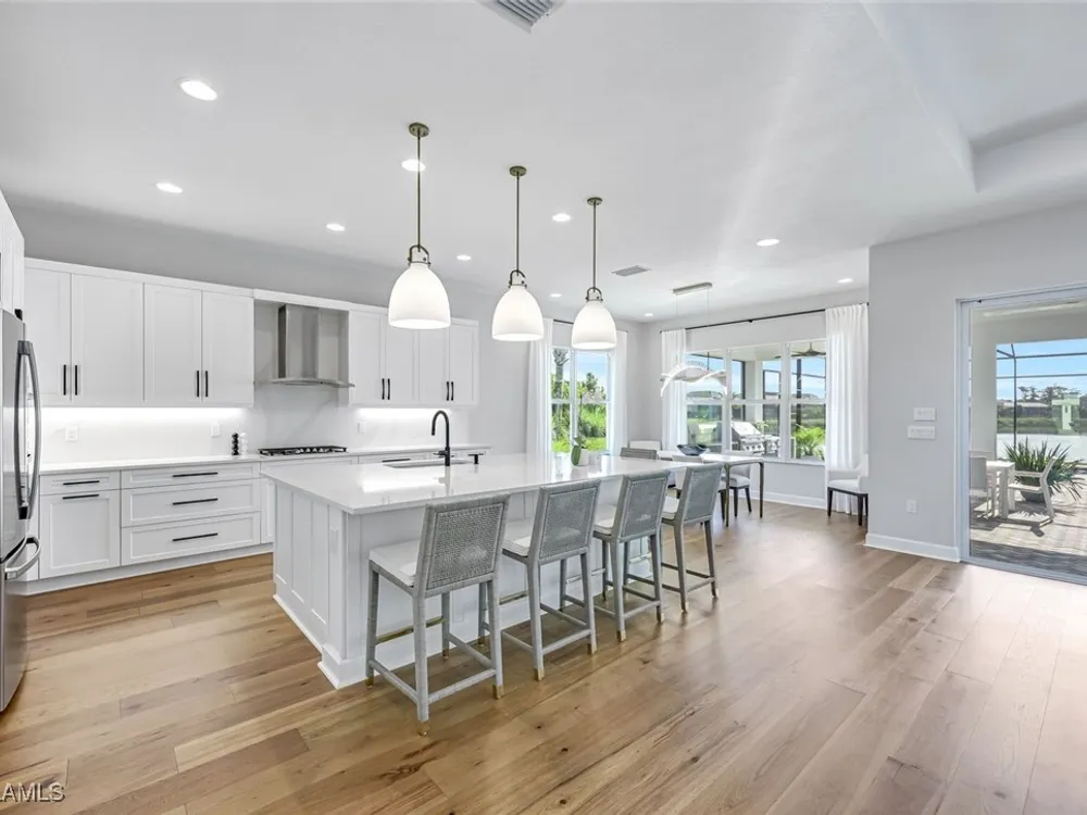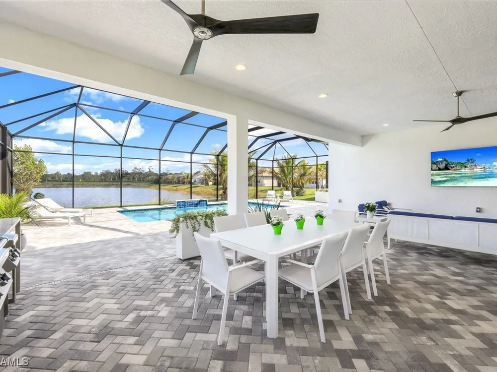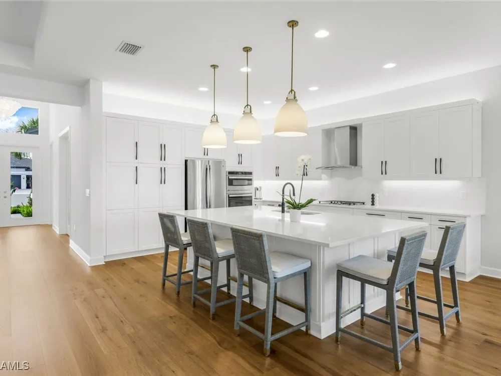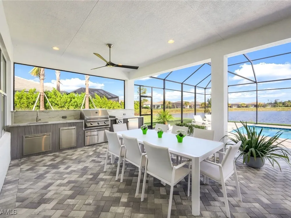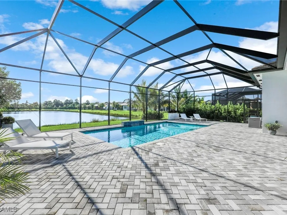 Stunning Lakefront Retreat in Valencia Trails – Your Private Oasis Awaits! Welcome to a breathtaking sanctuary nestled at the end of a peaceful cul-de-sac in the highly sought-after community of Valencia Trails. This exquisite 3-bedroom + den, 3.5-bath home boasts ultimate privacy and offers a rare opportunity to indulge in lakefront living with long, unobstructed views that will take your breath away. As you step through the grand entryway, you are greeted by soaring 14-foot ceilings that create an airy, open ambiance. Natural light floods the space through expansive windows, illuminating the elegant coastal-inspired design and highlighting the stunning wide plank wood flooring that flows seamlessly throughout—say goodbye to carpet! The heart of this home is undoubtedly the show-stopping gourmet kitchen, a dream for any culinary enthusiast. Boasting premium white solid wood cabinetry with integrated lighting, sleek quartz countertops, and a massive center island with seating for five, this kitchen is the perfect space for entertaining friends and family. High-end GE Profile appliances promise both functionality and style, while designer pendant lights and chandeliers add a touch of glamour to the heart of the home. Your luxurious primary suite is a true retreat, featuring a spa-like bathroom equipped with a custom linen closet, oversized rainfall shower, deep soaking tub, and dual vanities with stunning counter-to-ceiling mirrors. Step outside through the sliding glass doors into your very own private oasis, where the sun-drenched saltwater pool awaits—perfect for year-round enjoyment. The extended lanai, complete with dual oversized ceiling fans, offers a cool, shaded refuge for relaxation or entertaining guests. Take advantage of the magnificent custom summer kitchen, adorned with a striking waterfall-edge countertop, designed to elevate your outdoor gatherings to new heights. The spacious side yard, fence-ready and ideal for pets or play, adds to the allure of this stunning property. Additional features of this remarkable home include a three-car garage with epoxy flooring and modern floating cabinetry, full impact windows and doors for peace of mind. Enjoy the added benefit of living in a community with NO Community Development District (CDD) fees. Just a short walk or bike ride away lies the spectacular clubhouse, on-site restaurant, and lighted pickleball courts—making this not just a home, but a lifestyle filled with active living and vibrant community engagement. Opportunities like this are truly rare—don’t miss your chance to own a piece of paradise in Valencia Trails. Schedule your private showing today and step into a world of luxury, tranquility, and endless possibilities!