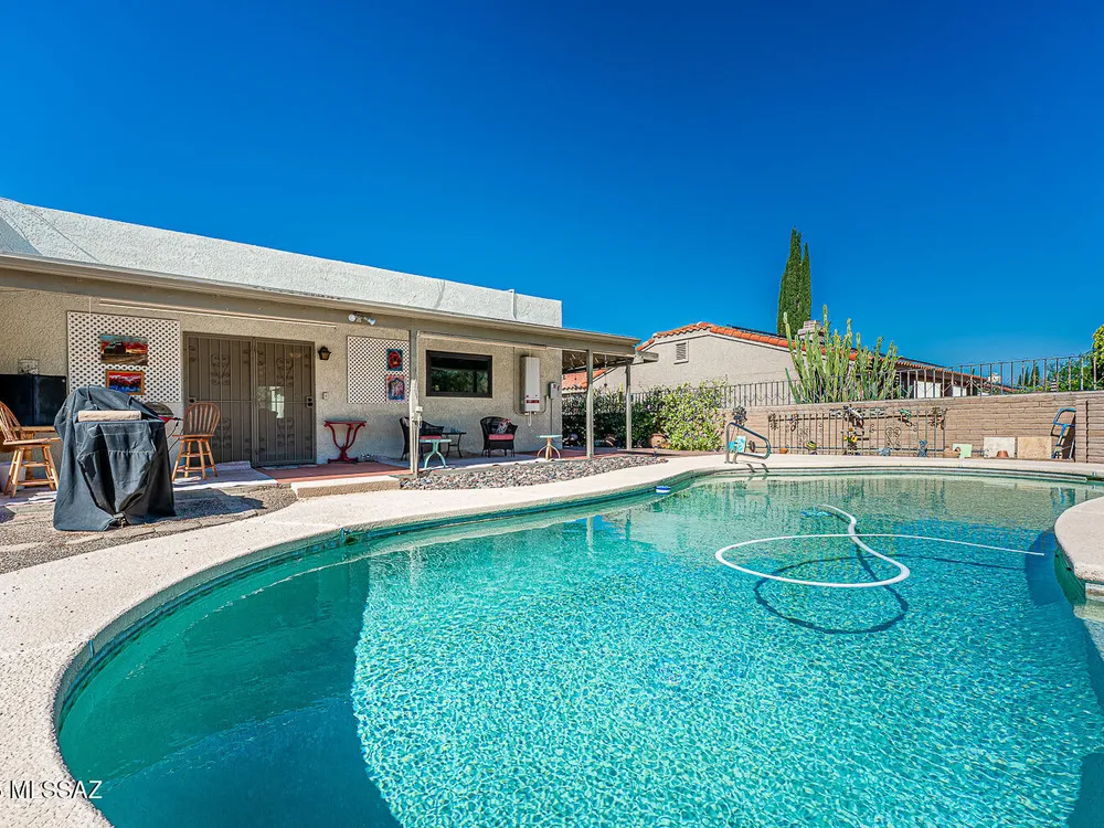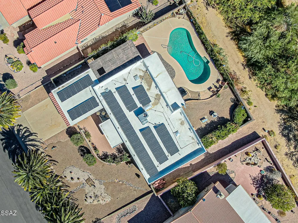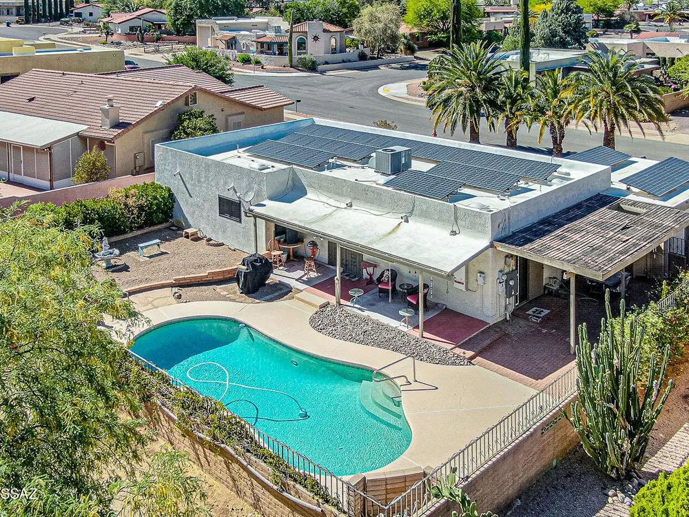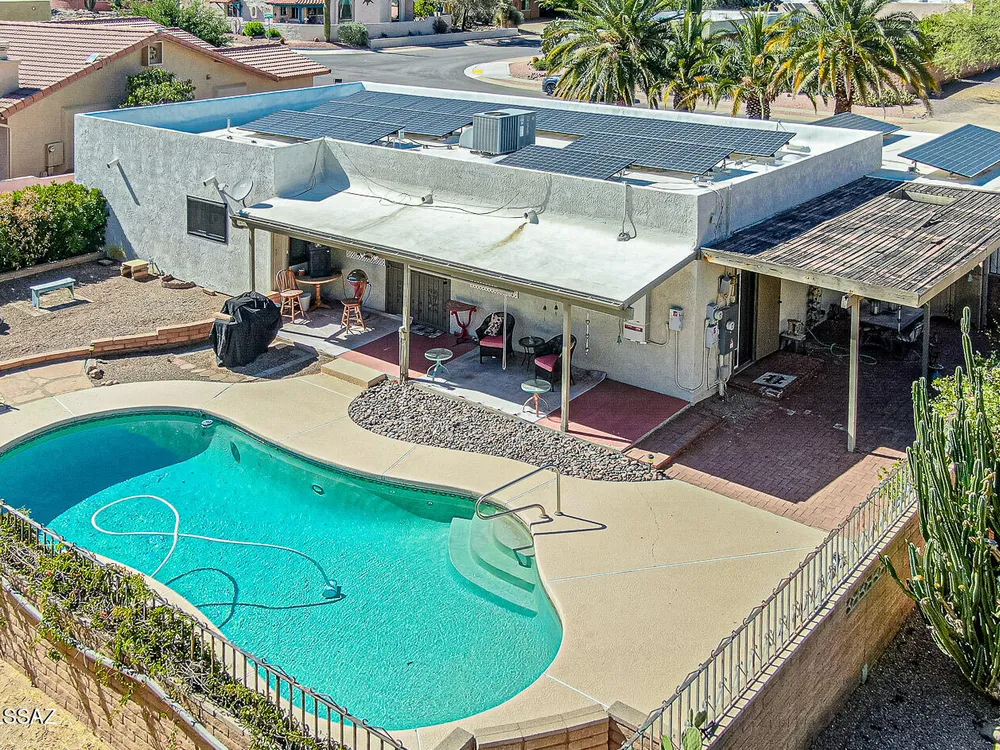 Great house on a quiet street in Country Club Vistas! Move in ready! Carpet and house cleaned. Front courtyard with mature rose bushes and the back is private with your own pool and views of the Santa Rita Mountains. The interior features a great room, newer tile floors, new Anderson windows and sliding glass doors. The roof was fully recoated 2019 with 6 years remaining on the warranty. Heat pump replaced in 2015; house completely rewired; newer pool pump. Tesla solar lease payment currently $180/month. The lot backs up to common area. CHOICE HOME WARRANTY