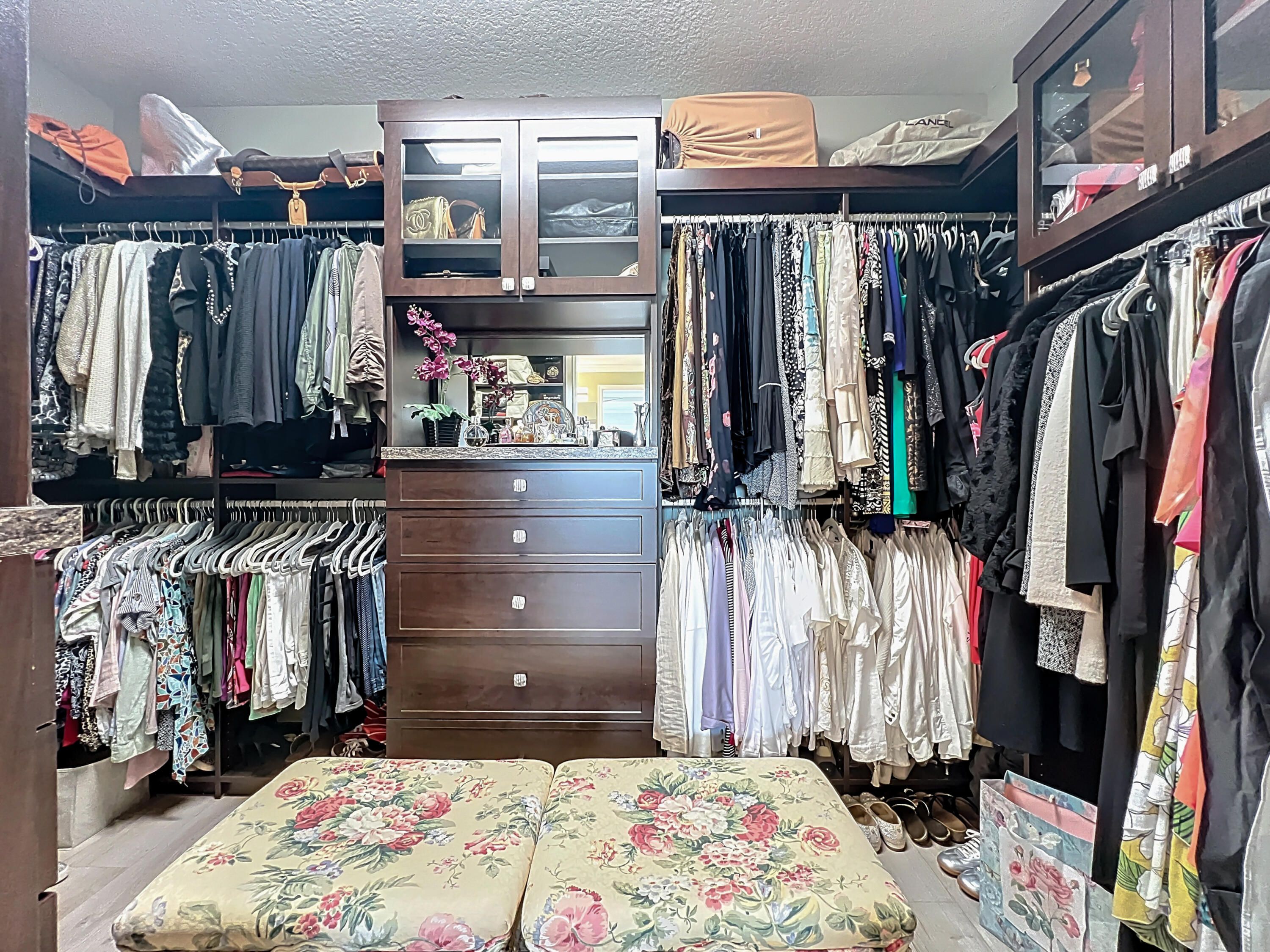 - Closet Cabinetry, Walk-In Closet(s), Family Room, Kitchen/Dining Combo, Separate/Formal Dining Room, Primary Downstairs, Storm Shutters