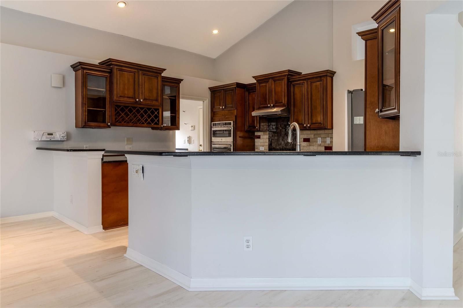 - Built-in Features, Cathedral Ceiling(s), Ceiling Fan(s), Eat-in Kitchen, High Ceilings, Kitchen/Family Room Combo, Main Level Primary, Solid-Wood Cabinets, Split Bedrooms, Stone Counters, Thermostat, Vaulted Ceiling(s), Walk-In Closet(s), Window Treatments