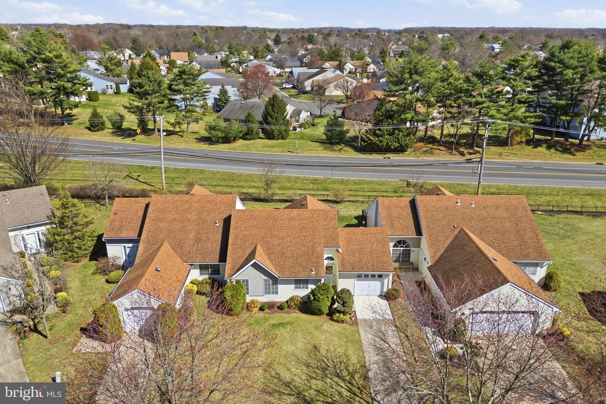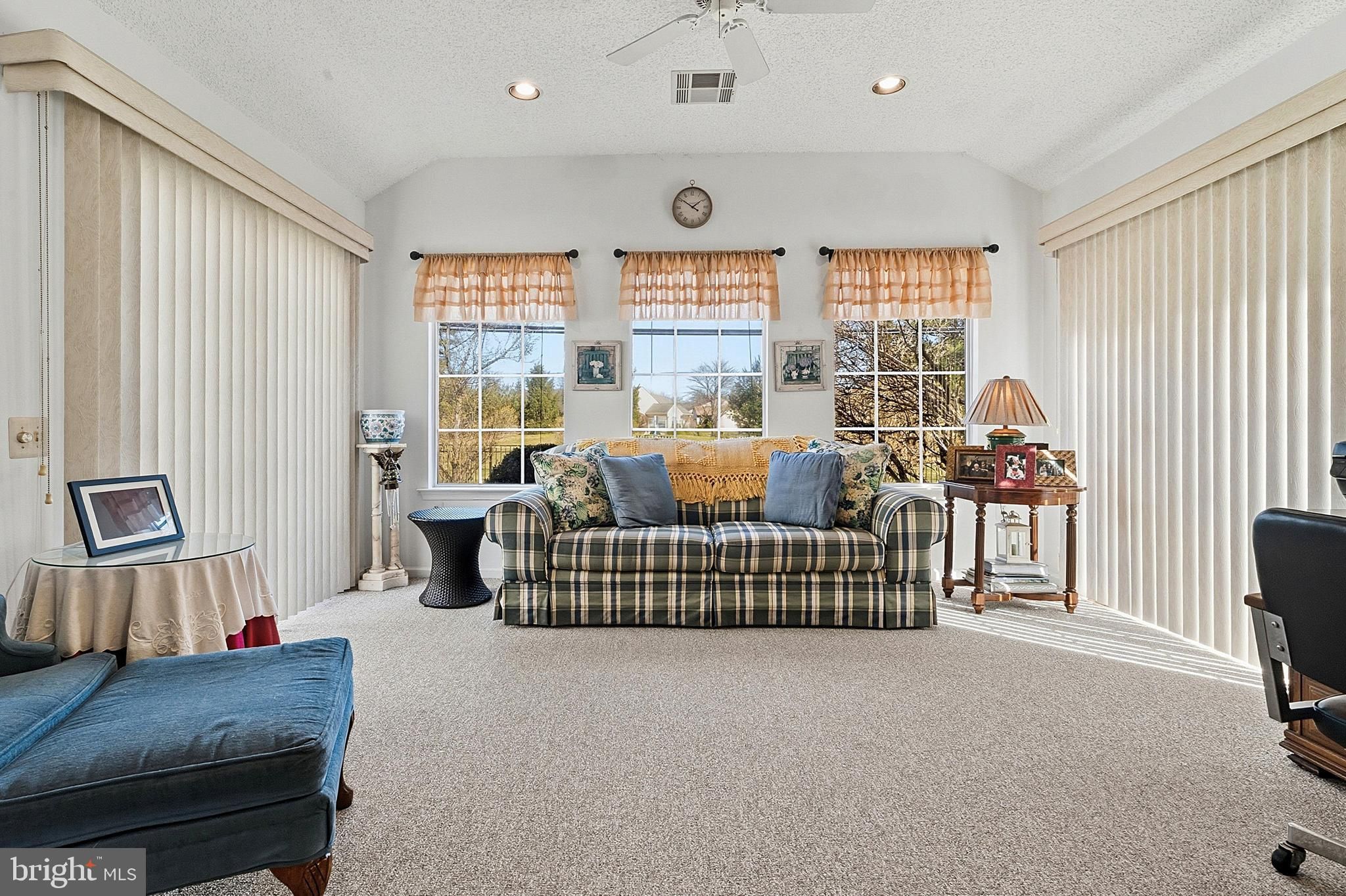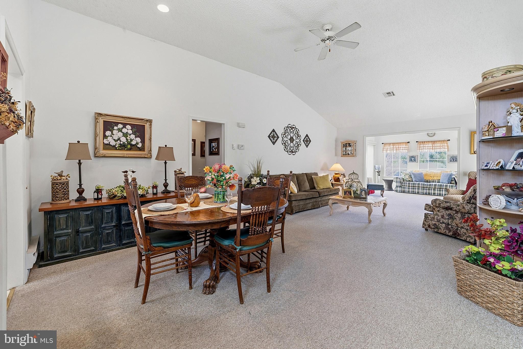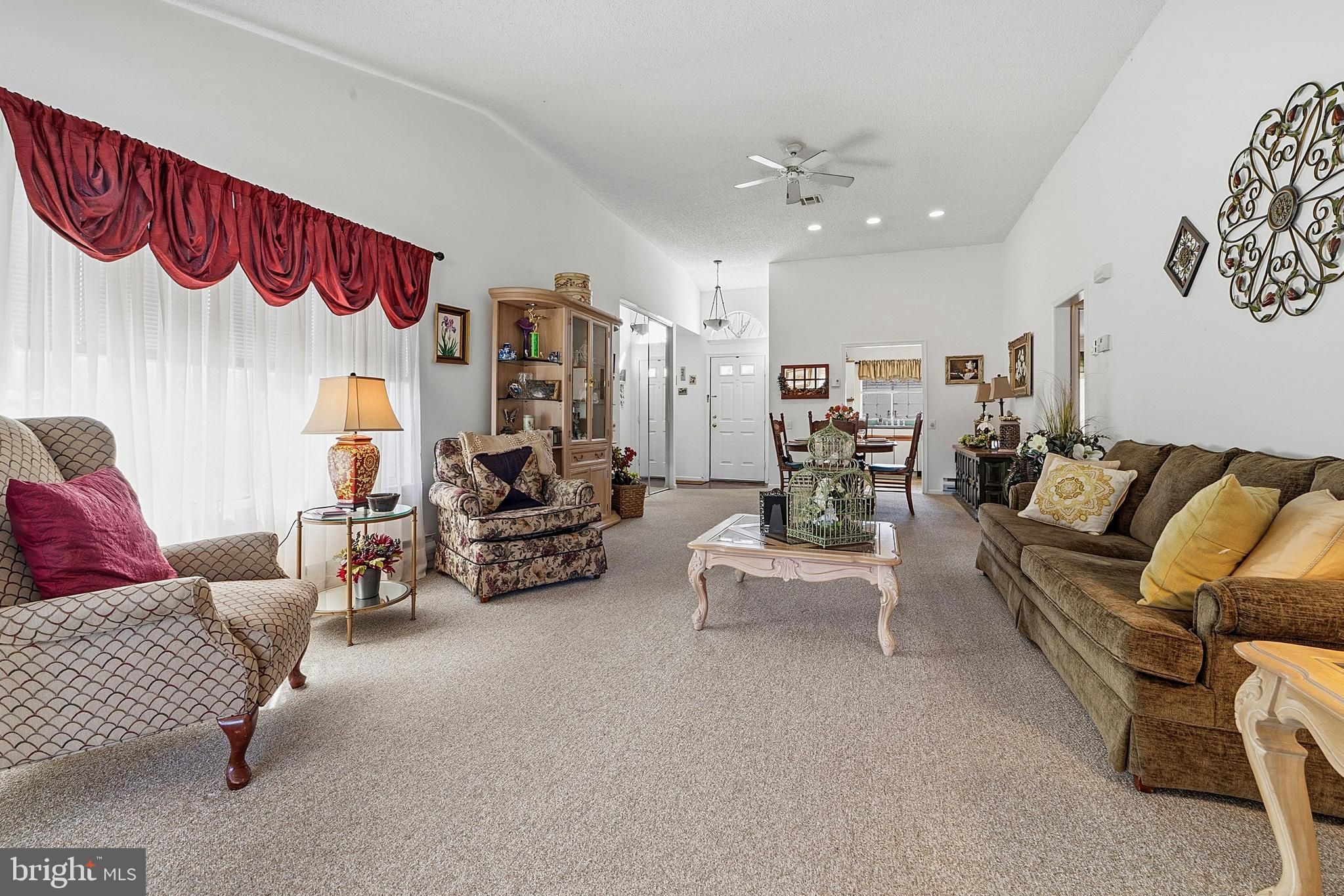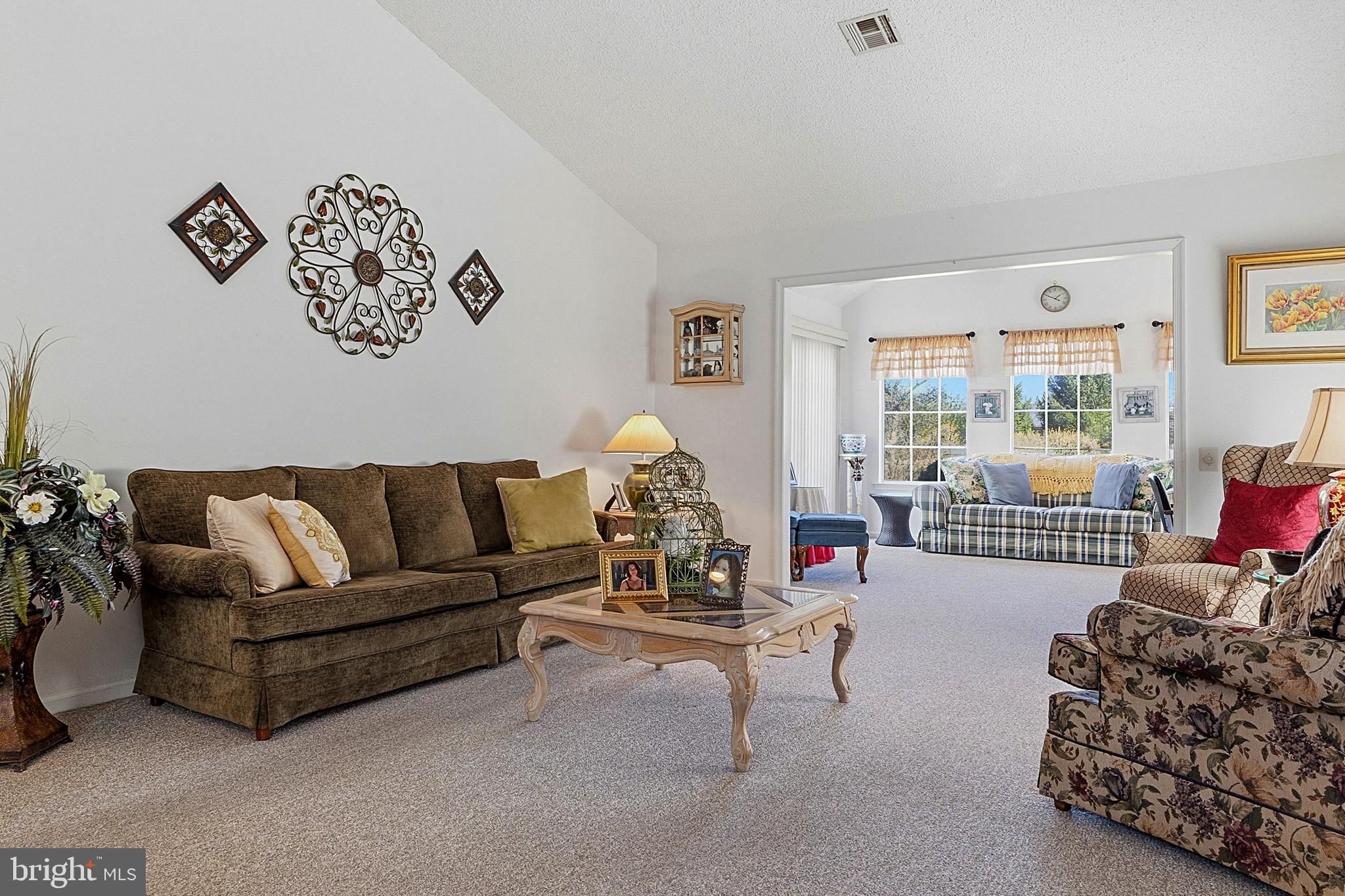 Welcome home to this beautifully maintained Dexter model in the highly sought-after Clearbrook 55+ community, offering comfort, space, and easy one-level living. Step inside through the inviting front door with transom window into a bright and welcoming foyer featuring a convenient double coat closet. The spacious living and dining area is perfect for everyday living and entertaining, complete with recessed lighting, carpeting, a ceiling fan, and a vaulted ceiling that adds an open, airy feel. The sunroom is a standout feature—boasting a vaulted ceiling, ceiling fan, recessed lighting, and two sliders that fill the space with natural light and provide easy access to the outdoors. Enjoy a large grassy area behind the home, offering privacy and a peaceful setting. The kitchen features a vaulted ceiling, stainless steel appliances, a built-in microwave, and a window over the sink for added natural light. The primary bedroom offers comfort and convenience with a ceiling fan, ample space, and an en suite bath featuring a large shower, updated grout work, and a vanity with storage and a medicine cabinet. A second bedroom includes a ceiling fan, large closet, and a big picture window. Additional highlights include a main bath with tub/shower, vanity, and medicine cabinet, as well as a laundry area with shelving for extra storage. The home also features a one-car garage with direct access to the yard. Enjoy resort-style living in Clearbrook with access to golf, pools, clubhouse, and endless activities—all in a prime location close to shopping, dining, and major roadways.