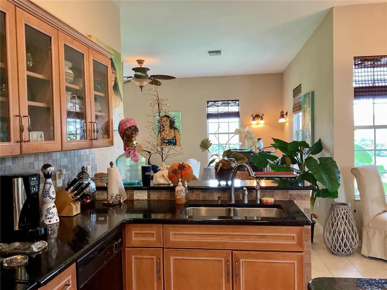 - Ceiling Fan(s), Eat-in Kitchen, High Ceilings, Kitchen/Family Room Combo, Living/Dining Room, Open Floorplan, Solid-Wood Cabinets, Split Bedrooms, Stone Counters, Thermostat, Walk-In Closet(s), Window Treatments