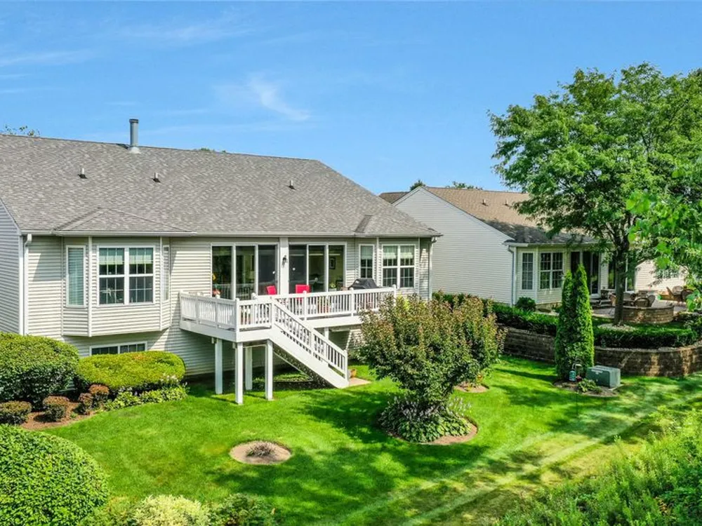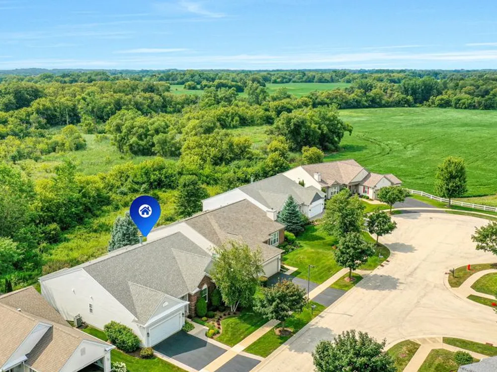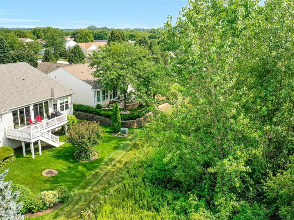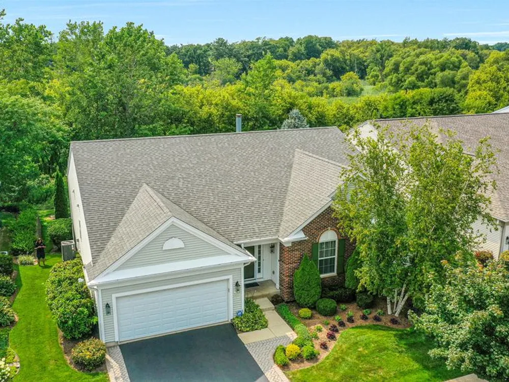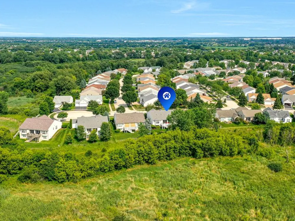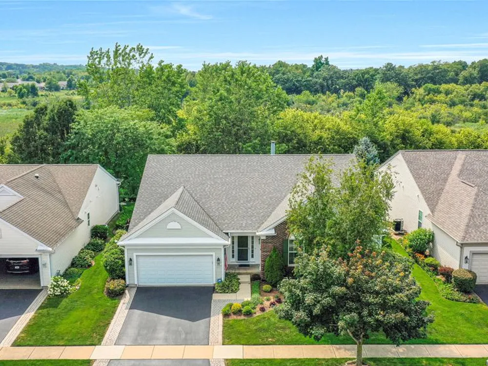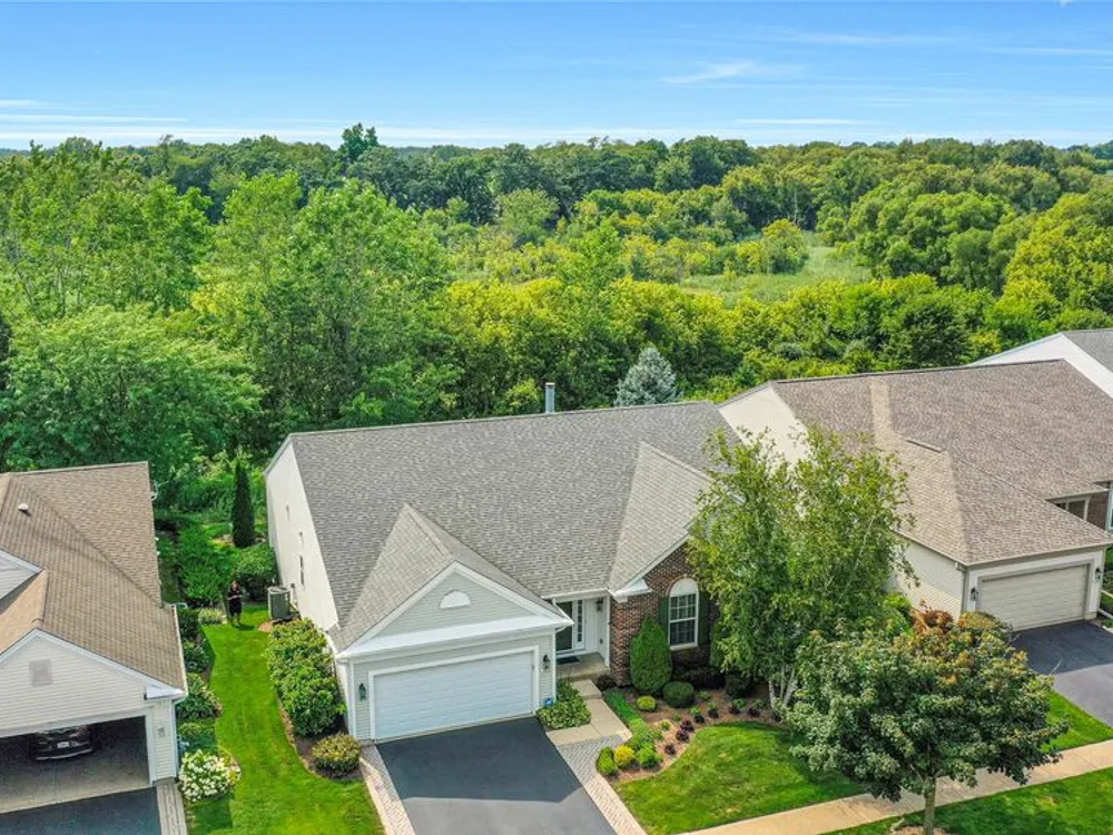 Welcome to this rarely available, meticulously maintained Dearborn model in Del Webb's Sun City. Perfectly nestled on a quiet street and backing to lush trees and wetlands -This home offers the peace and privacy you've been waiting for. Designed for comfort and convenience, this spacious home features an open concept floorplan with 3 generously sized bedrooms, a versatile den, and 2 full bathrooms, all on the main level. The light-filled garden room features floor to ceiling windows with amazing year-round views and 2 sliders walking out the maintenance free Trex deck. The cozy family room with surround sound system and gas fireplace offer beautiful views, while the large kitchen impresses with quartz countertops, GE Profile appliances, recessed lighting, a spacious snack bar and a large eating area with bay window overlooking the lush wetlands, ideal for both casual meals and entertaining. Retreat to the serene primary suite complete with a bay window, crown molding, large walk-in closet with custom organizers and a spa-style ensuite bath with whirlpool tub, dual vanity, and separate shower with tile surround. Additional highlights include extended cabinets in the kitchen and laundry room, professional landscaping with lawn irrigation system, driveway ribbons and an expansive English basement with rough-in plumbing for a future bathroom. Updates include Roof 2013, HVAC 2024 and Water Heater 2023!! All of this in Del Webb's vibrant, amenity-rich 55+ community-where every day feels like a getaway.