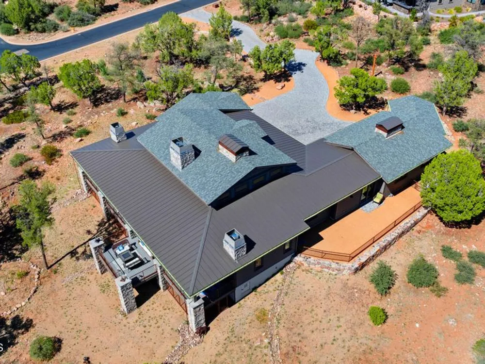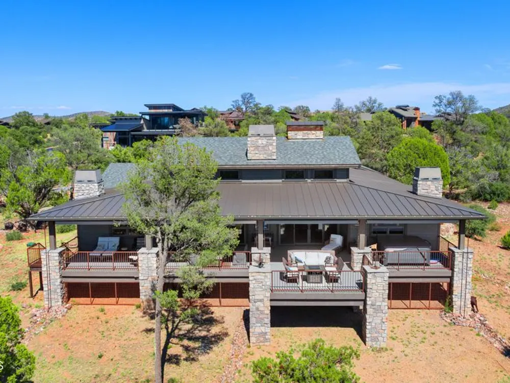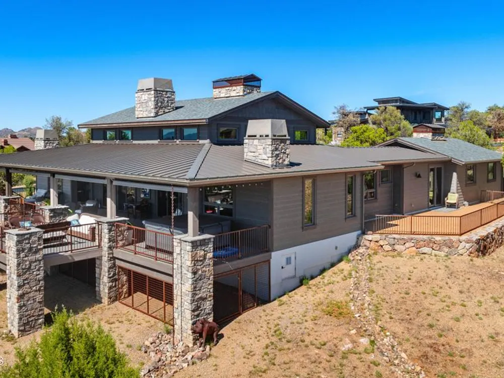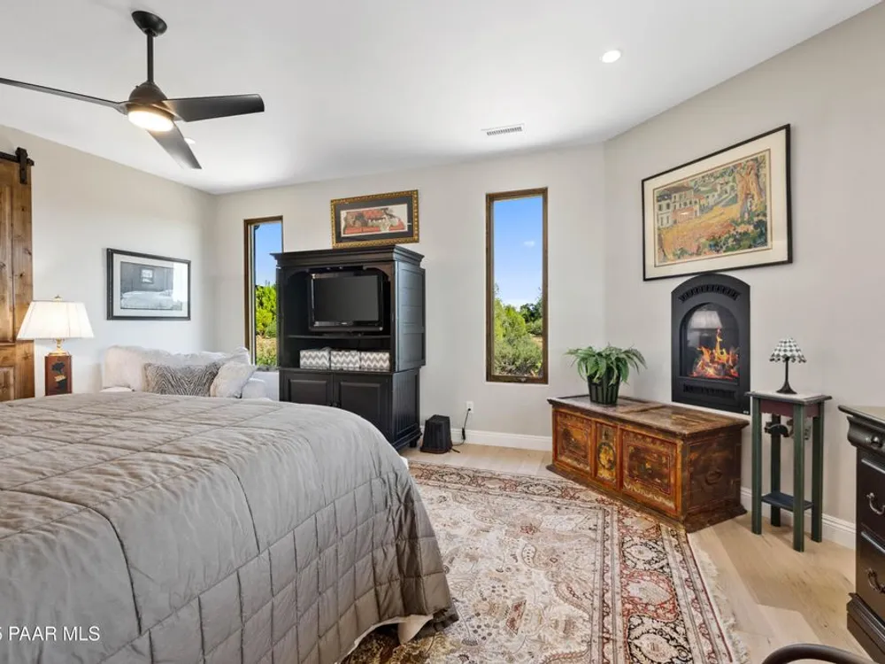 Russ Lyon Sotheby's is excited to share details about a truly unique custom home floor plan, meticulously built by Imperial Builders and completed in 2022. This residence stands as a testament to quality craftsmanship and is situated on a private 2.07-acre oasis in Talking Rock, formed by the thoughtful combination of two lots, offering incredible views. The home itself features a split floor plan design, with two luxurious master bedroom suites for ultimate comfort and privacy. The great room is a central hub with a dedicated dining area, a large fireplace, and elegant built-in bookcases, creating a warm and inviting atmosphere. There is a cozy den that's perfect for weekend guests, plus a versatile bonus room/office space that can be adapted to your specific needs. You'll find a total of four fireplaces throughout the home, with the added luxury of one in each bedroom. Outside, you'll love the expansive back deck, offering both covered and uncovered areas, along with a relaxing spa/tub that provides stunning views of Granite Mountain. Additionally, the covered front patio offers a cool retreat on warmer days, and a dedicated fenced run ensures your furry friend has their own space. Every detail in this quality home has been thoughtfully designed to create a truly inviting and comfortable living experience. NOTE: Den area is 12x12 and very easy to convert to 3rd bedroom with added wall and pocket or barn doors.